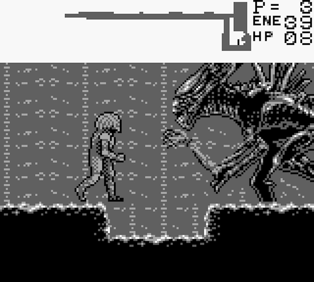The first thing that struck me was the intricately detailed sprites of the Predator and the aliens. Or rather, alien in the singular sense as it’s the same sprite used for every xenomorph throughout. Not that it’s easy to make them out. While original GameBoy games did blur when scrolling, this one seems to do so way more than others, resulting in a right confusing mess on the screen.