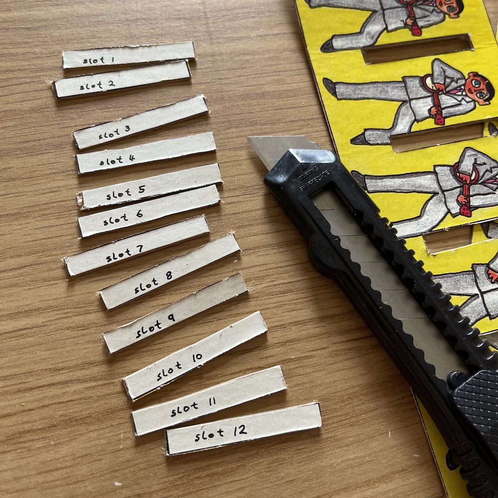 Franks’ alter ego, Chris Sievey decided to try his hand at creating one so let’s see how good it is, shall we? We begin by gluing it to a piece of flexible card. I used a cereal box and the very second I glued it to the blank interior I realised I’d already made a mistake. With the brightly coloured cereal design on the side I’d be looking through to see the animation it would be too distracting when spun. I should’ve made sure the blank side of the cardboard was on the outside. So I glued it on to another piece of the box, blank side out, meaning it was rather more stiff than it should’ve been. Oh well.