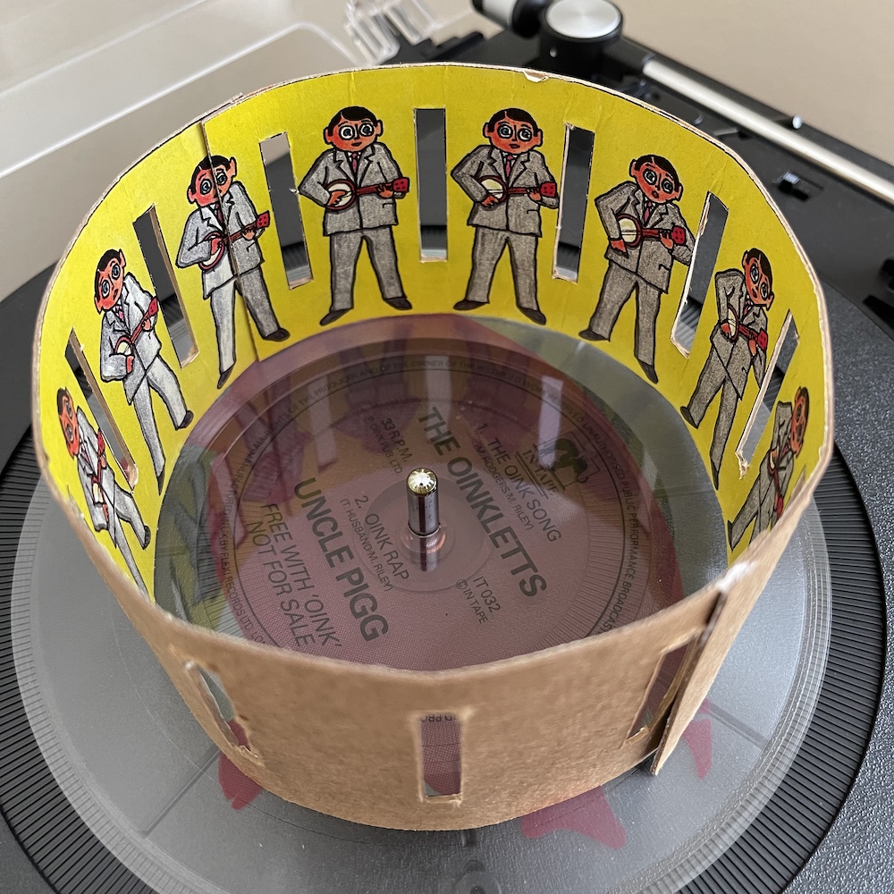 I remember as a kid those art shows would show zoetropes and we’d only see one of the images animating, making it look like an old-fashioned cartoon animation from the early days of film. Maybe if the device had different dimensions (larger device with smaller holes? I have no idea) it would look more professional but I still think the effect is great, with a group of Franks all strumming away and tapping their feet. I did try to play the OiNK flexidisk while it spun but due to it being only slightly larger than the zoetrope the player’s head hit it and kept skipping after a few seconds. So your ears have been spared!
