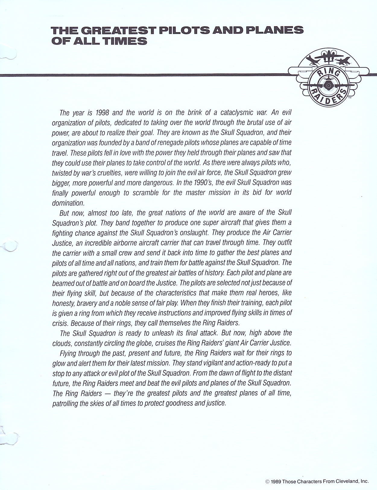 On the next page is a selection of variants for both the Ring Raiders and the Skull Squadron (quaintly described as “Good Guy / Bad Guy Logos”). The top two were used as the individual logos for each side on toy packaging and across any and all merchandise. The next row down are the in-universe logos used by the characters themselves on their planes, bases and uniforms.