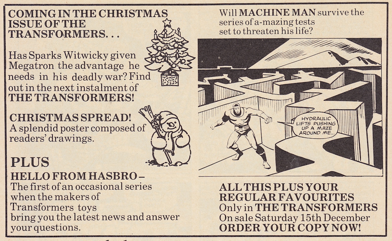 It’s been a long time coming but finally it’s time for the next instalment of Transformers at Christmas, my yearly look at the Yuletide issues of Marvel UK’s epic G1 comic on their 40th anniversaries. Well, it’s almost time. There are still seven days to go but first let’s take a look at how 1985’s special issue was promoted in the previous issue. In fact, this issue includes its own holiday highlights on the editorial page too.