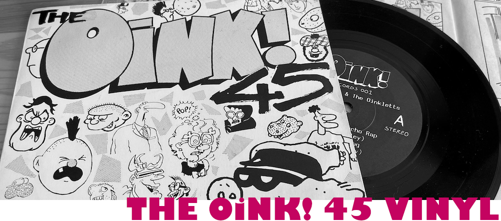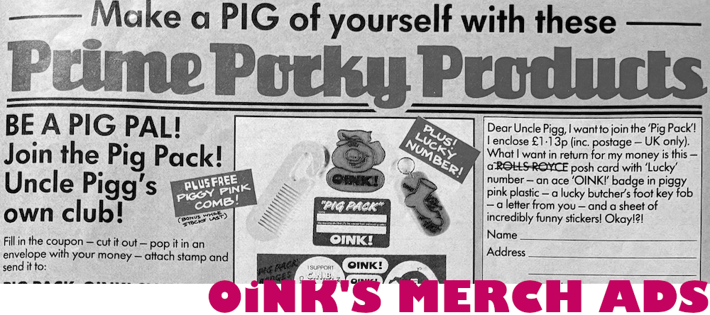 OiNK had a huge variety of merchandise available for pig pals. It wasn’t just a comic, it was a lifestyle! Clothing, a mug, a vinyl record, even bubblegum. I only owned two pieces myself back in the day and one ended up ruined pretty quickly, so I’m eager to replace both and track down the rest… just so I can show them to you, of course. I’m looking forward to adding more to this section as time goes on.