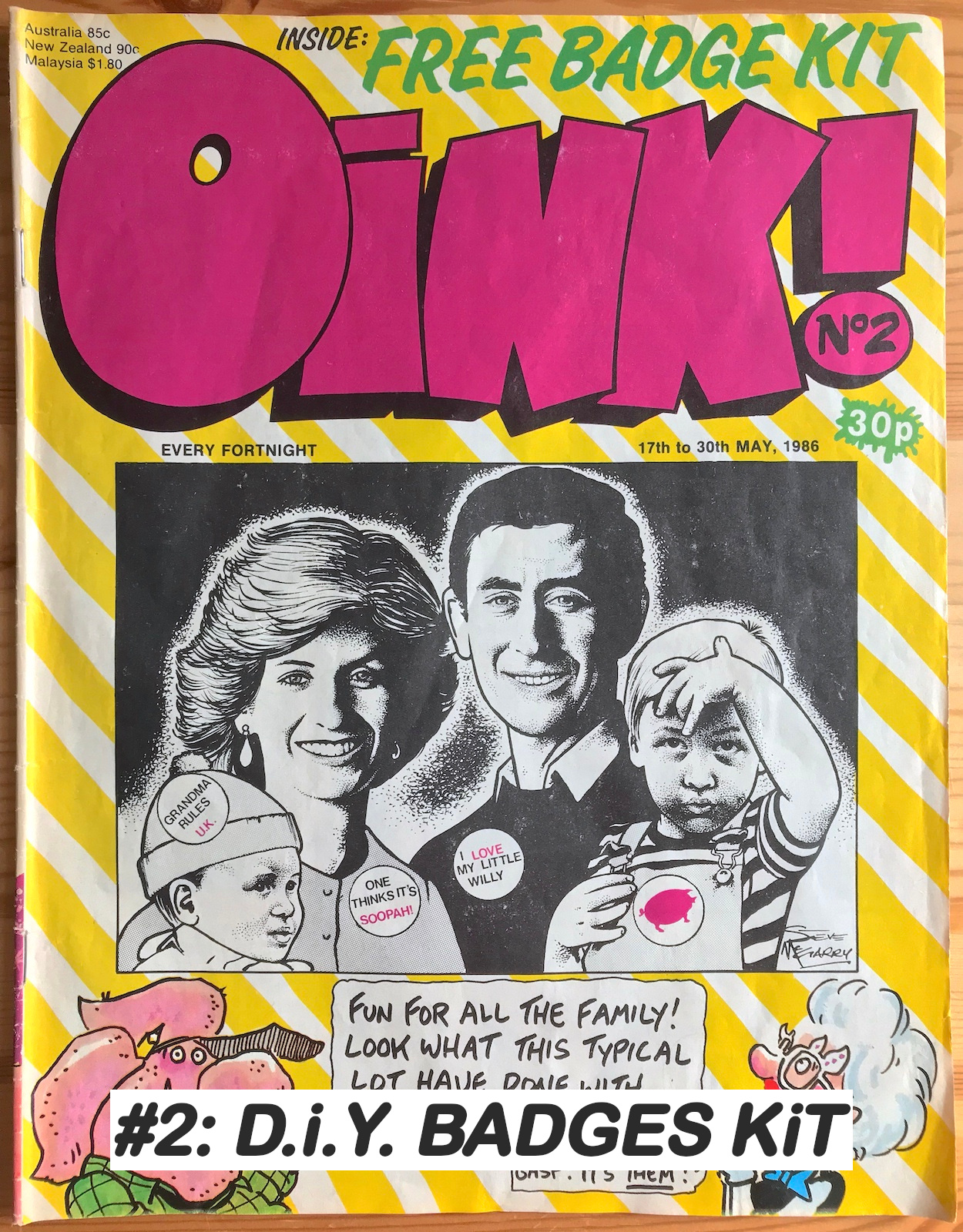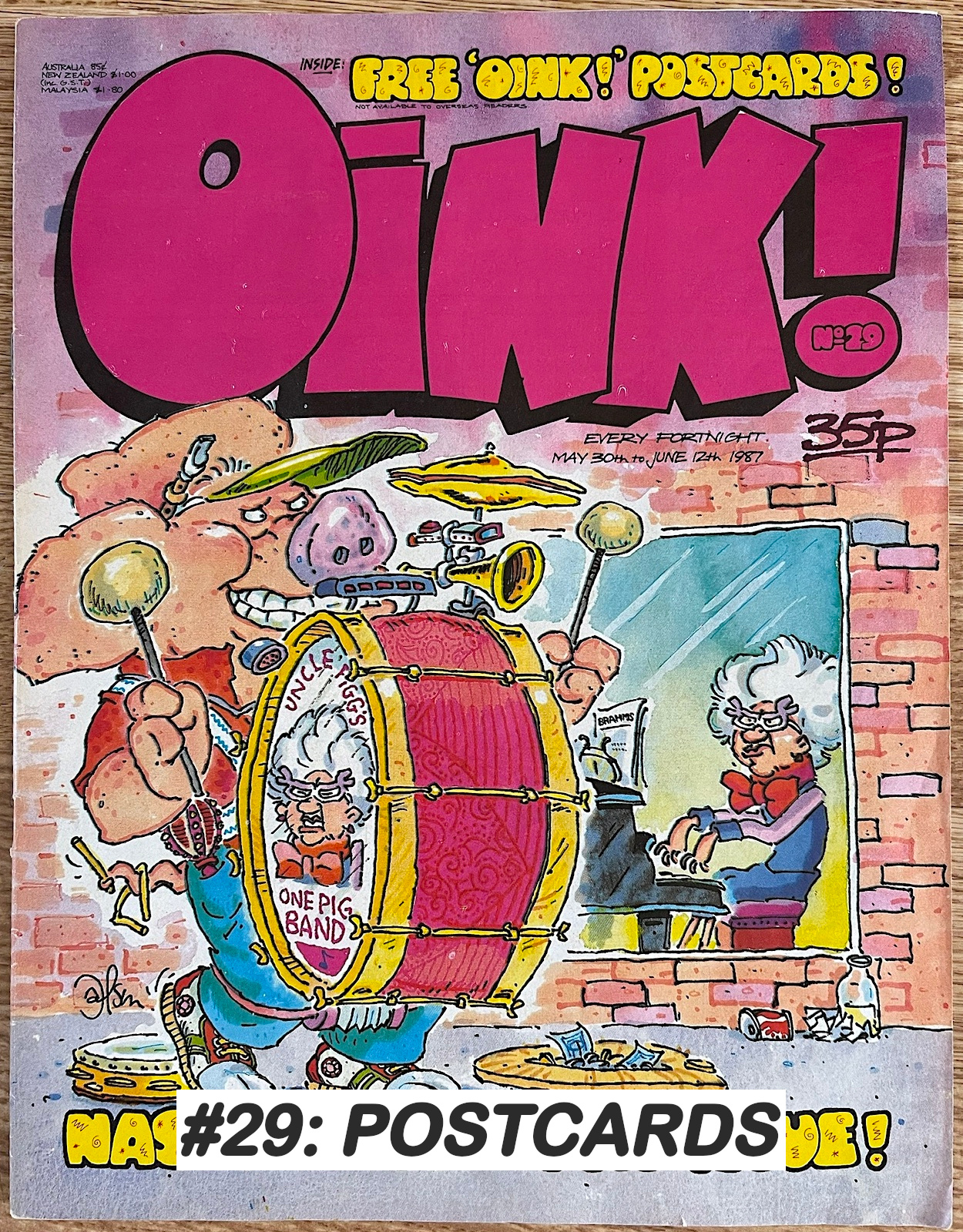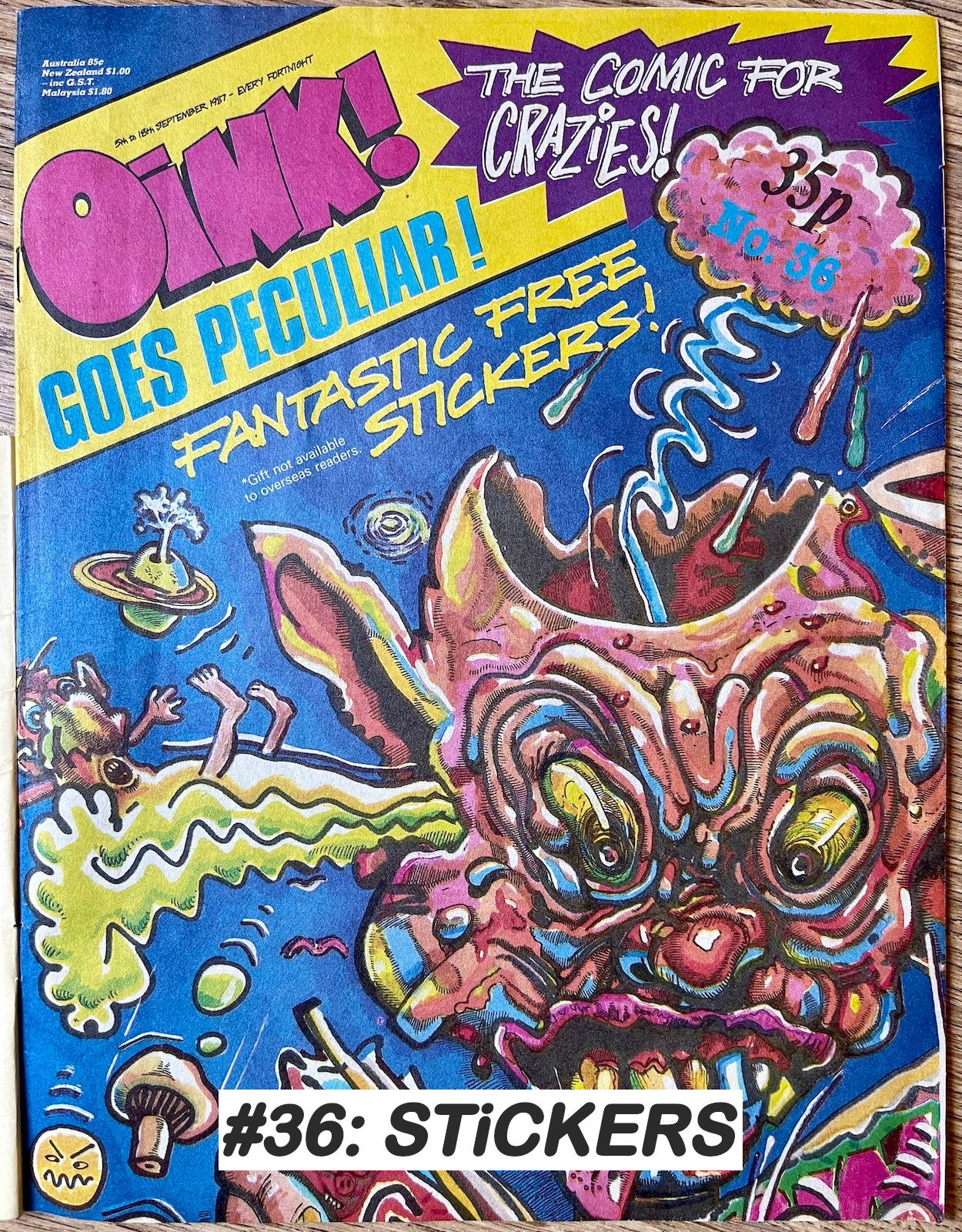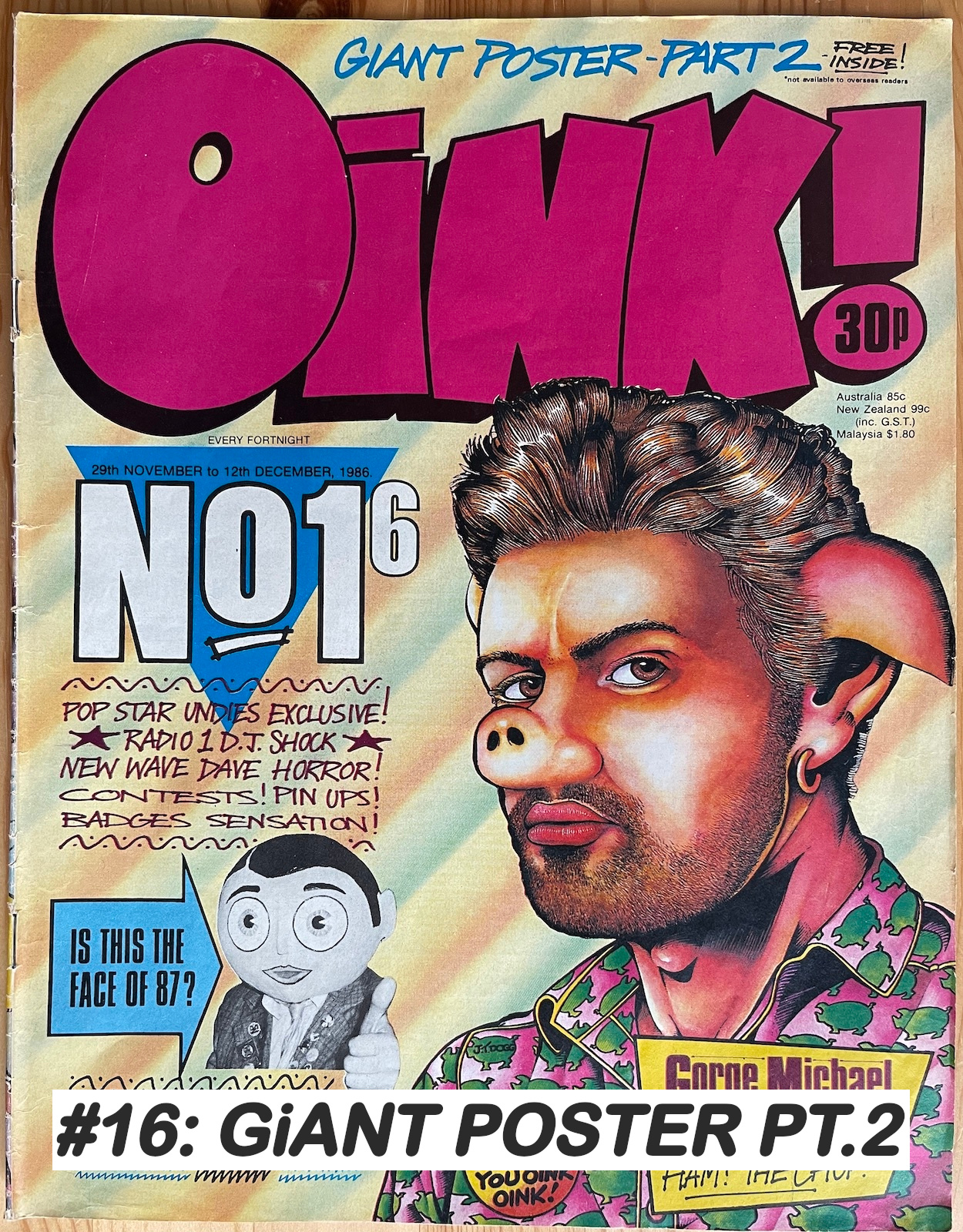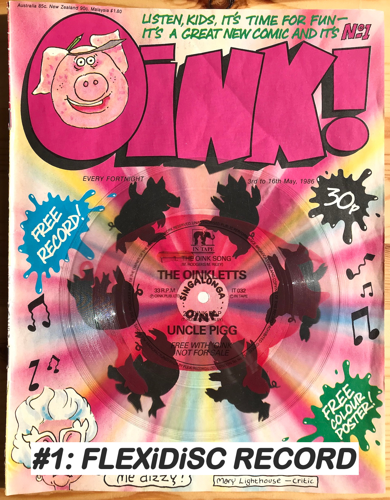 Free gifts were a big deal for comics readers back in the 80s. Rarely appearing and always an event when they did, out of 68 regular OiNKs only 12 issues had something either tucked away inside or stuck to the cover. When an actual free record is given away with the first issue of a new comic you just know any further freebies are going to be special. Below are links to the reviews of the issues that came with a little something extra.