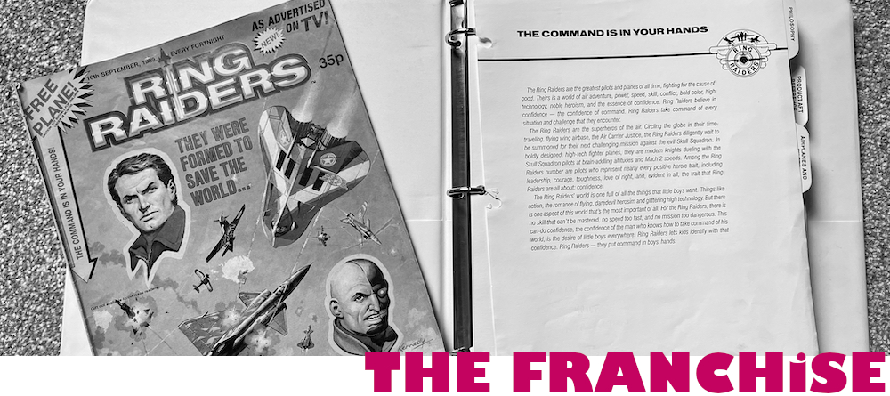 Supplied to Fleetway editor Barrie Tomlinson and the team behind the comic, this folder contains details about Ring Raiders that would be essential in putting it together. Sent to all potential licensees, this rare piece of memorabilia is an exciting addition to the blog for Ring Raiders fans and a fascinating look at what’s involved in creating a comic based on an existing toy licence. I’ve broken it down into five sections and will be showing every single page to you in this monthly series of posts.