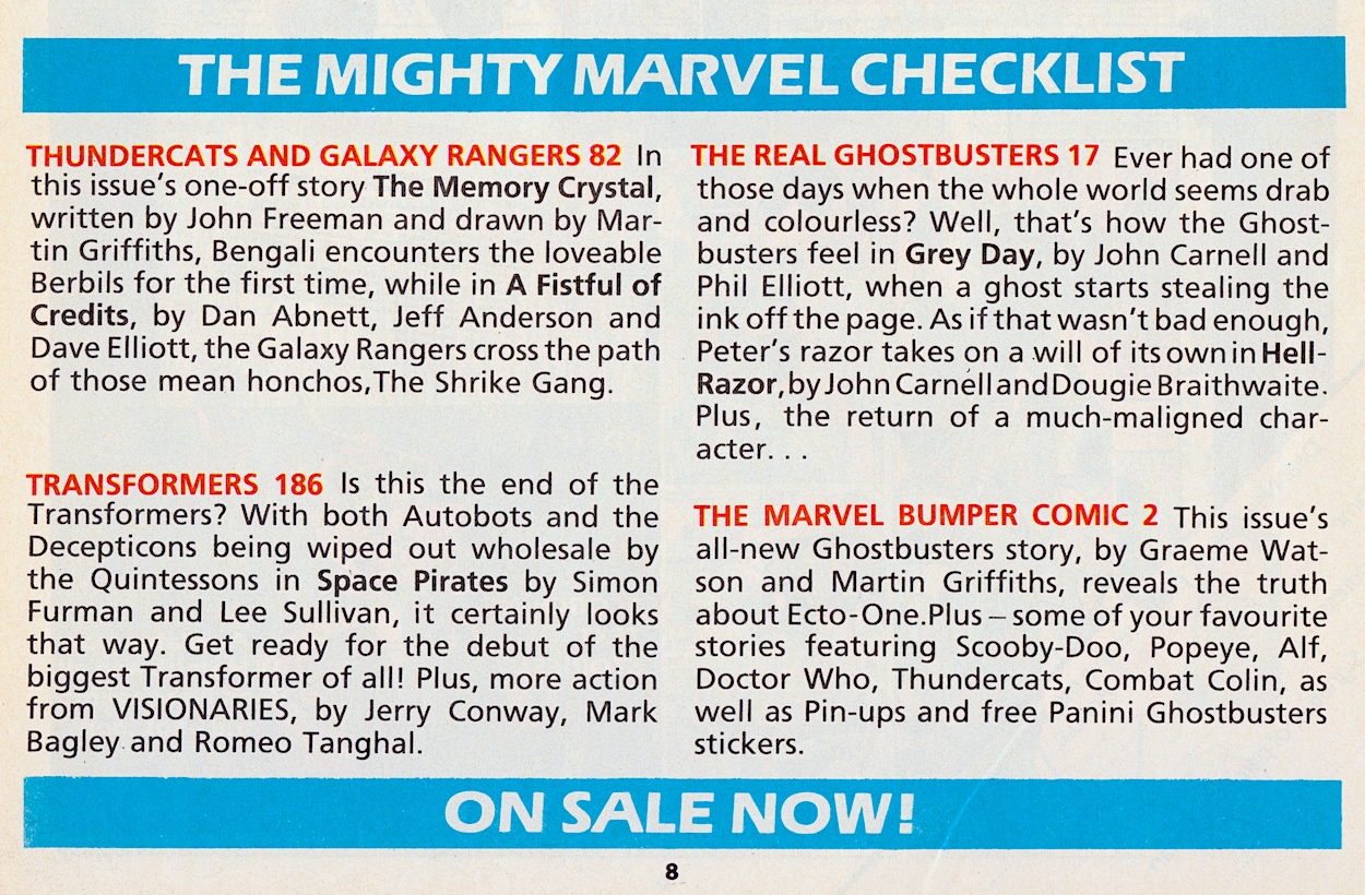 Brian Williamson’s cover to The Real Ghostbusters introduced us to an issue that contained haunted tongues but no checklist. Yup, unfortunately both our comics were just too packed to make room for our weekly shopping list, even though it was listed on the contents page of Ghostbusters. Instead, the Dragon’s Claws strip advert was in its place and in the pages of my second Transformers I was introduced to someone else via a similar page.