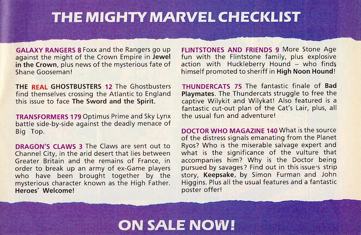 Our two comics may get short-changed a bit but at least Huckleberry Hound gets his promotion promoted, the Galaxy Rangers edge closer to their final issue and in Thundercats did they really have to rescue those two? Interesting that the Doctor Who Magazine entry focuses solely on the comic strip when it’s only one part of the publication. Then again, it had a lot less pages back then so the strip was a bigger part of the whole.