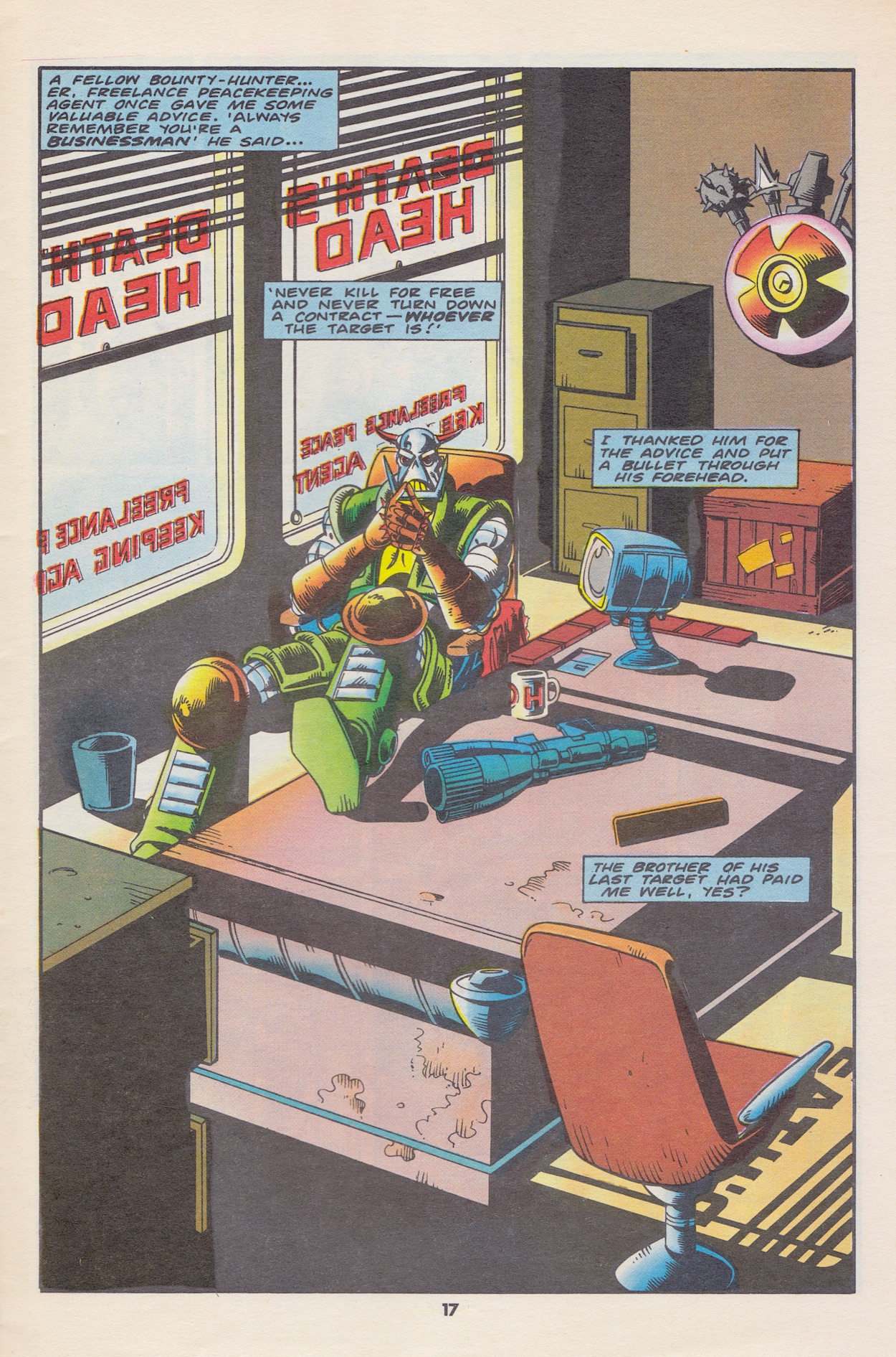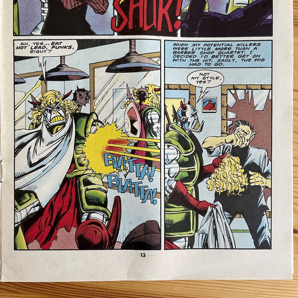 So the Freelance Peace-Keeping Agent has been sent to round up Scavenger rather than kill him, and deliver him to the Game team. The first half-dozen pages consist of their back and forth battle involving anything that comes to hand for Scavenger, including Scratch the dog! As ever, Death’s Head keeps his cool and even has time for the occasional quip before he finally overcomes his target.