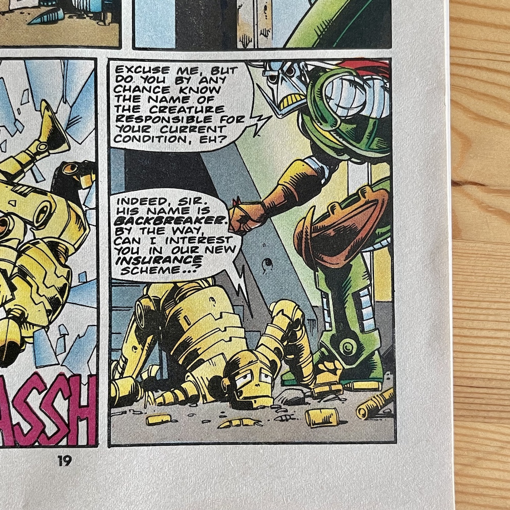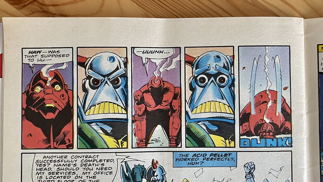 You see, he’s been rebuilt by a Game team looking for revenge on Scavenger of Dragon’s Claws and as always business comes first, so up he pops in as characteristic a manner as ever. First though, don’t forget to subscribe to 12 issues of the comic that would only last for ten. Obviously Marvel UK had much bigger plans for their smaller US-sized comics. A sad reminder of that to kick things off with.