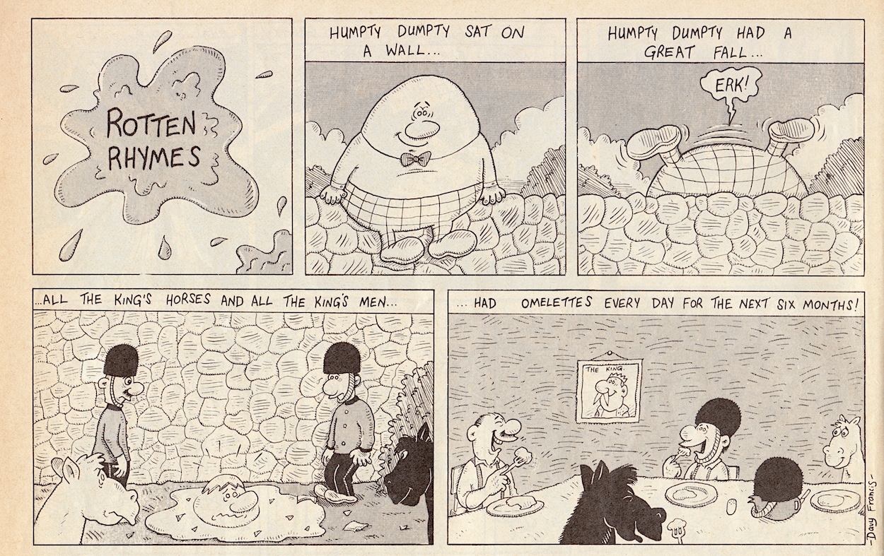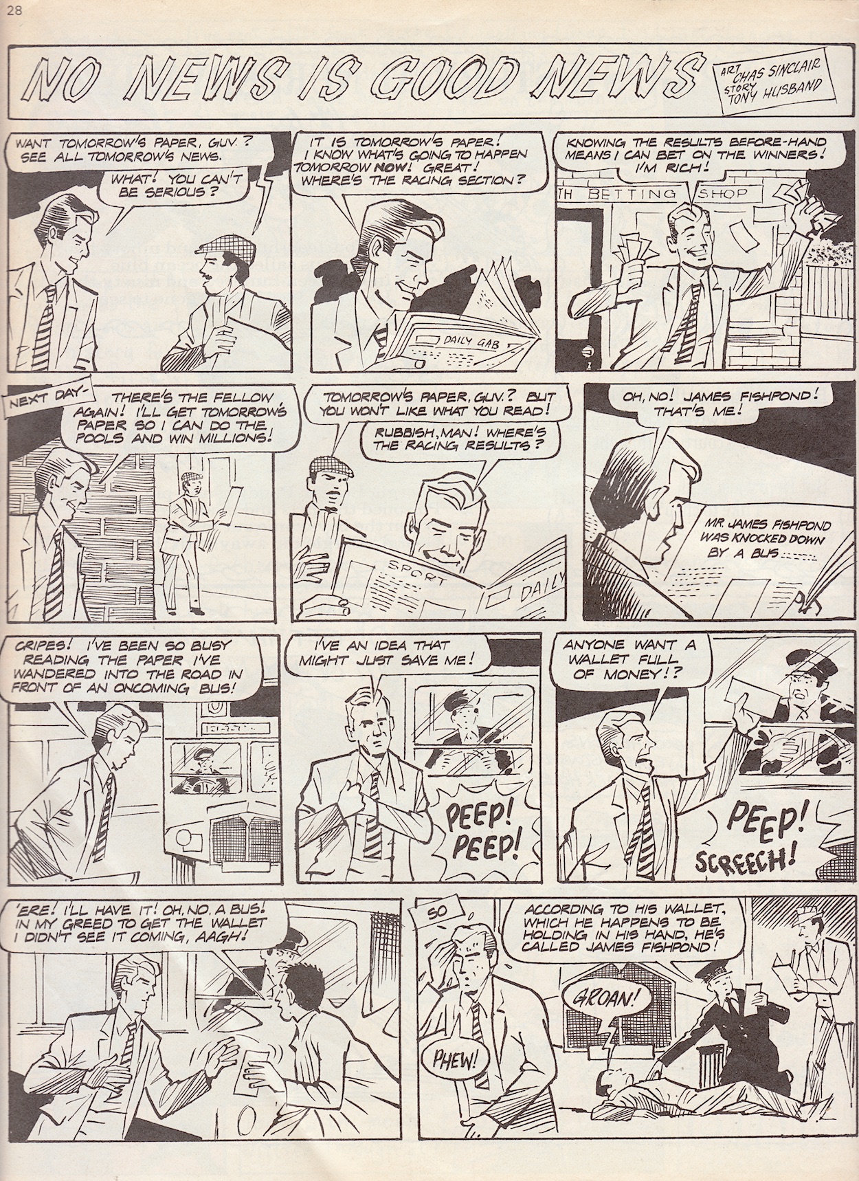 So who wrote this incredibly funny strip? Patrick confirms that it was his fellow co-editor Tony Husband, who worked so brilliantly with Chas on many strips, but strangely it includes no credits all. In fact, Tony’s signature is nowhere to be found in any of the new material. There are reprints of Horace Watkins, one of Tony’s Golden Trough Awards from an early issue and some of his quick gag pages from the weeklies, but for all intents and purposes he’s absent. I asked Patrick about this and he tells me the reason is most likely because they were simply so busy on the Round the Bend TV show by this time.