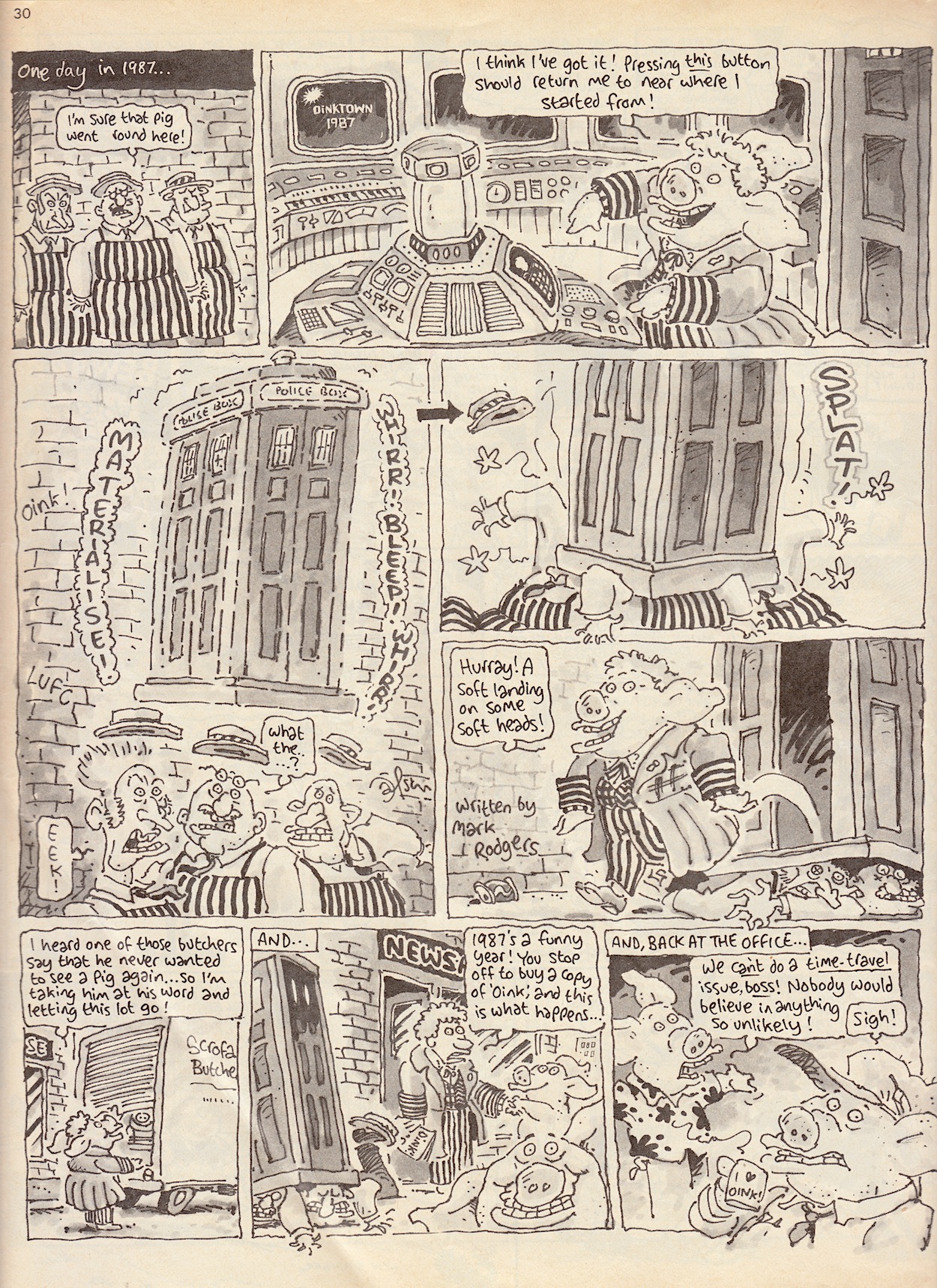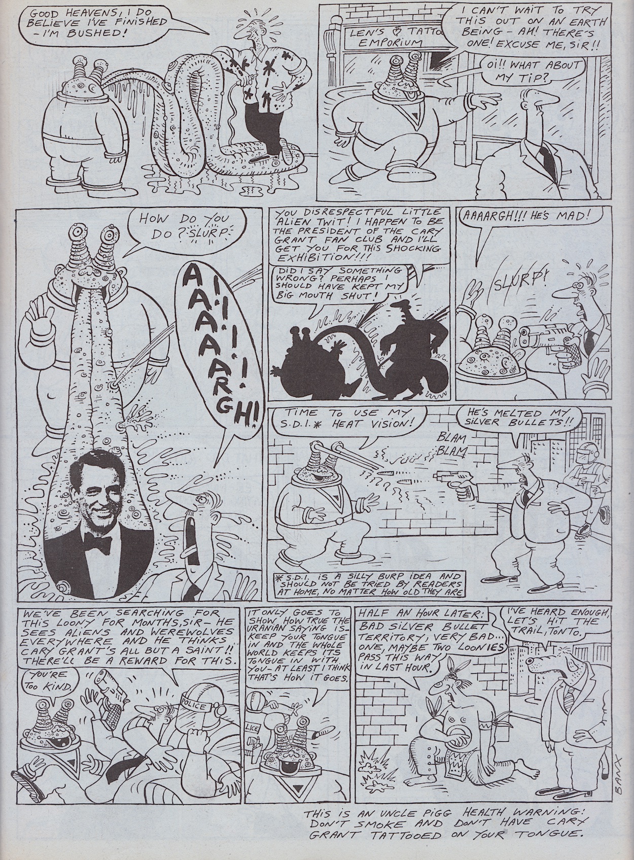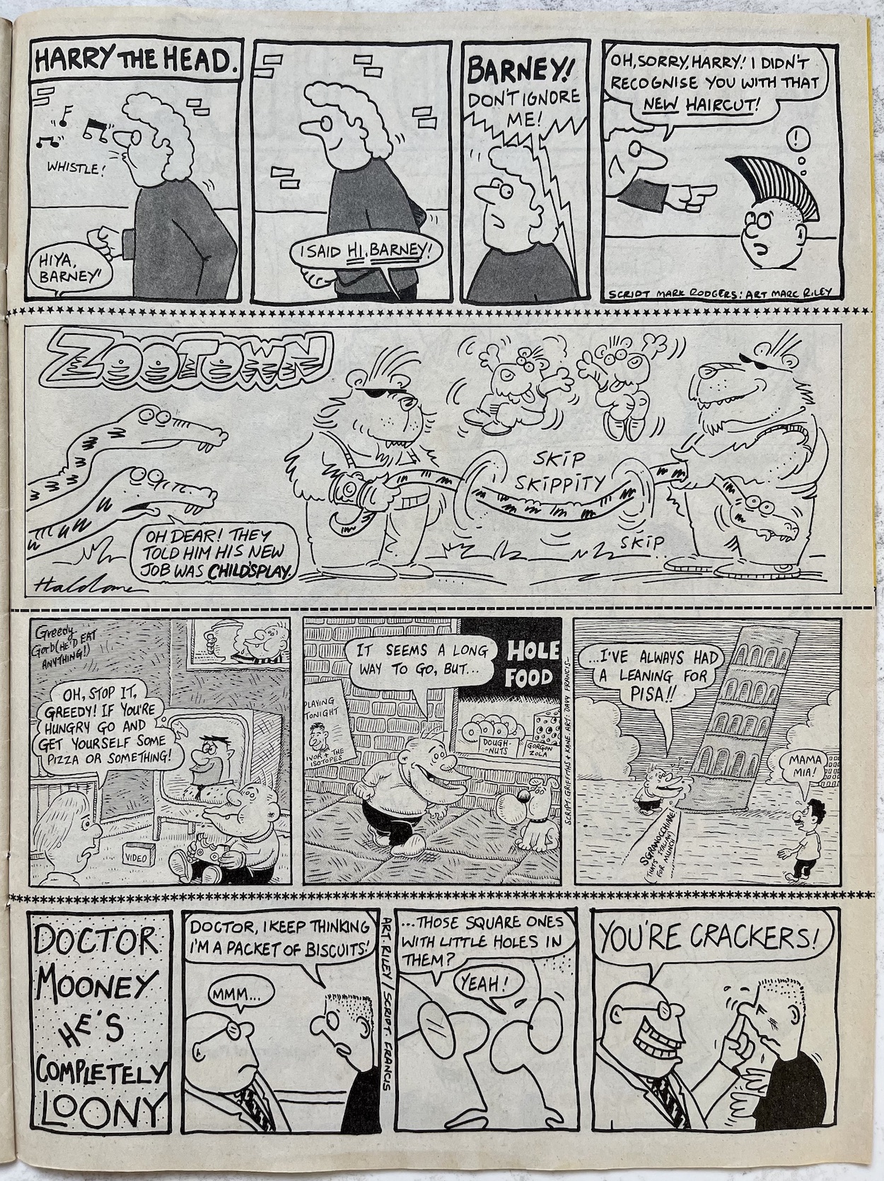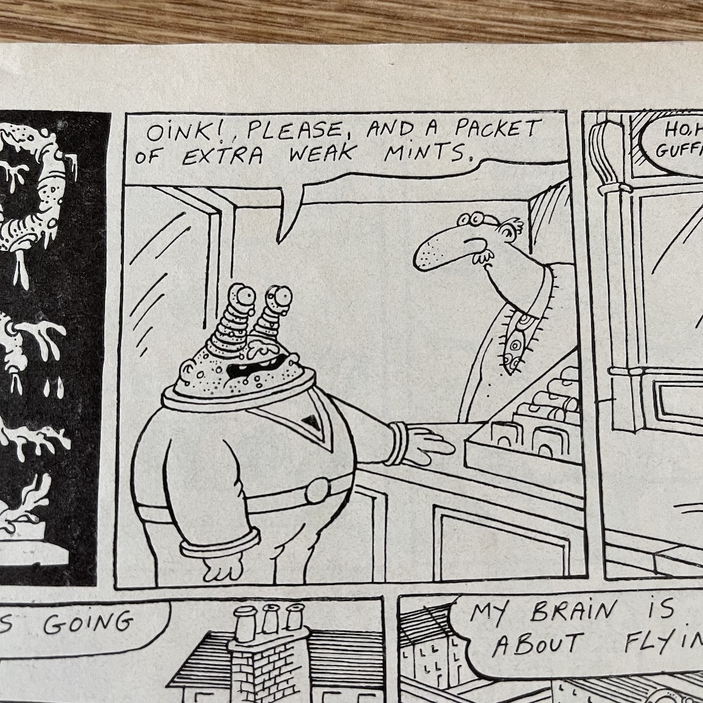 If you look closely at the first and last speech balloons, the words “effort” and “Holiday Special” seem added in after the fact, like there was originally mention of a “Book” or “OiNK Book” respectively. I asked Patrick who confirms some of the material here was indeed intended for The OiNK! Book 1990 before OiNK was cancelled and he thinks I’m right about the edited words above too.