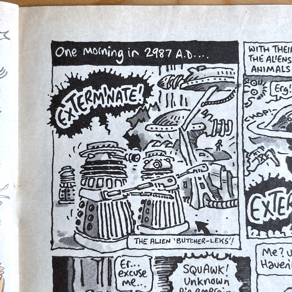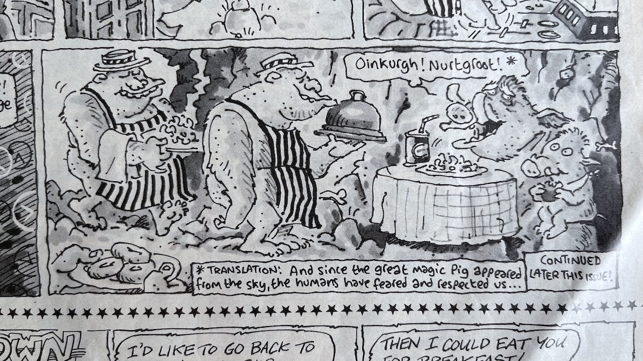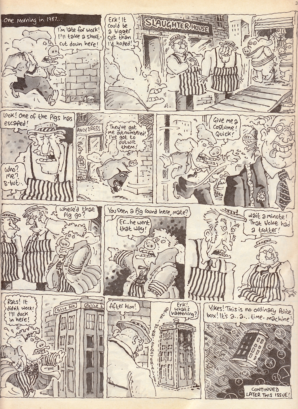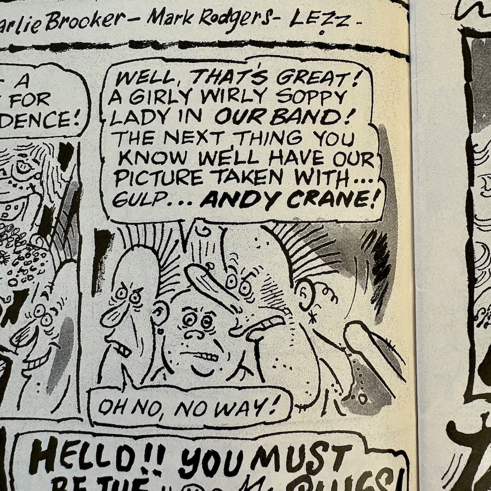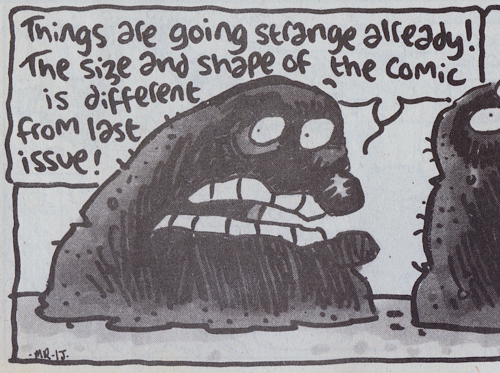 If you look closely at the first and last speech balloons, the words “effort” and “Holiday Special” seem added in after the fact, like there was originally mention of a “Book” or “OiNK Book” respectively. I asked Patrick who confirms some of the material here was indeed intended for The OiNK! Book 1990 before OiNK was cancelled and he thinks I’m right about the edited words above too.