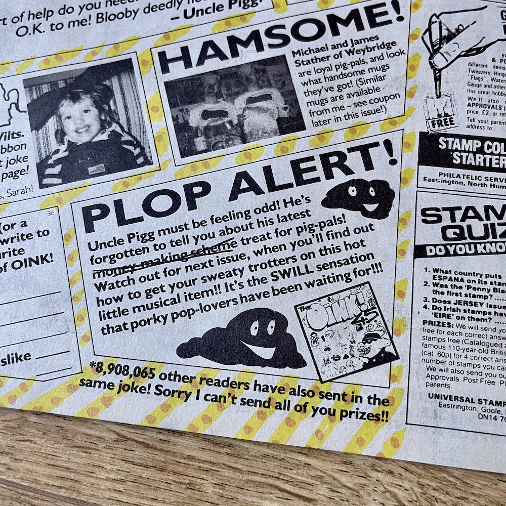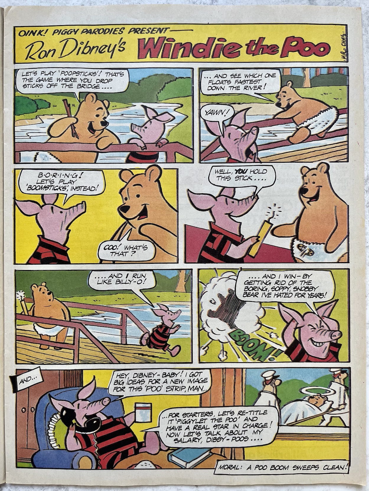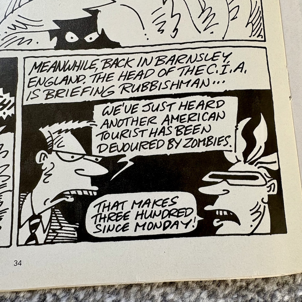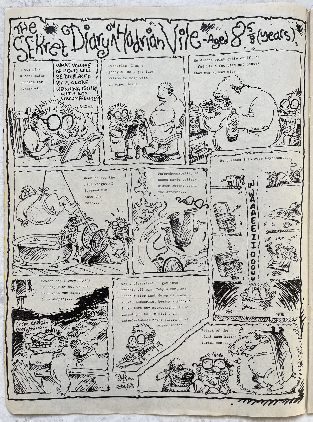 If you look closely at the first and last speech balloons, the words “effort” and “Holiday Special” seem added in after the fact, like there was originally mention of a “Book” or “OiNK Book” respectively. I asked Patrick who confirms some of the material here was indeed intended for The OiNK! Book 1990 before OiNK was cancelled and he thinks I’m right about the edited words above too.