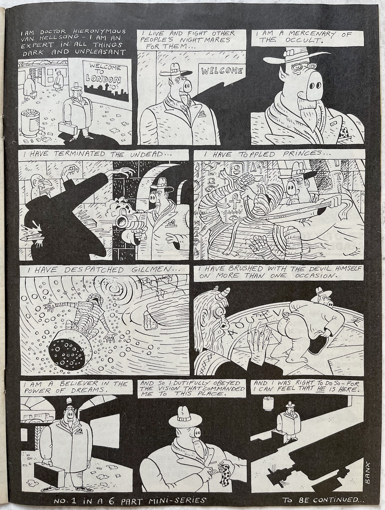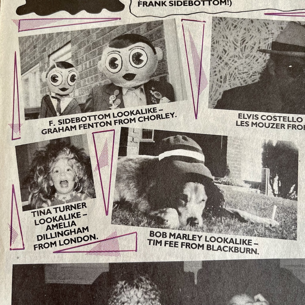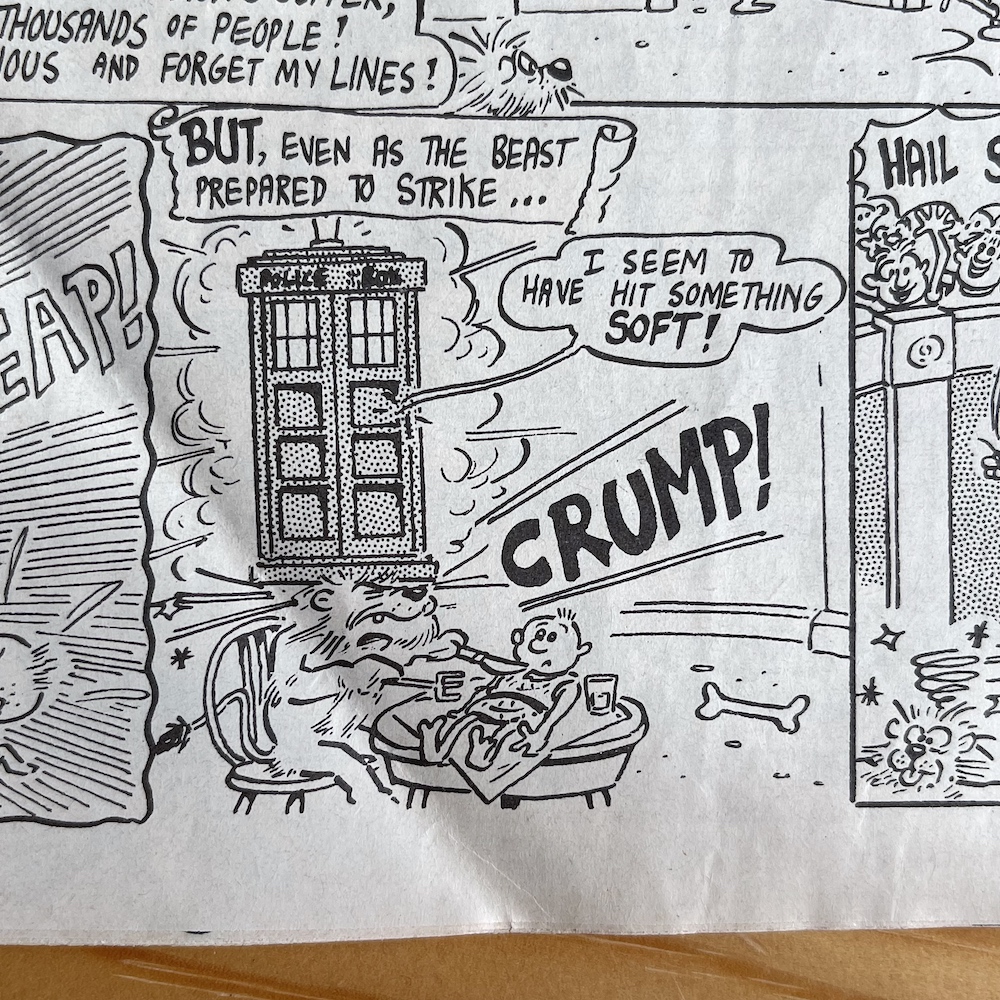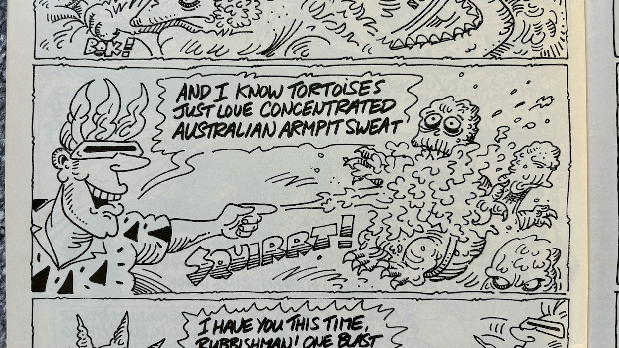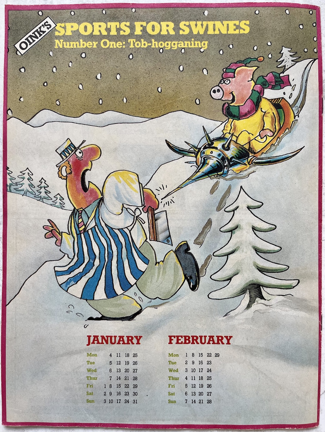 If you look closely at the first and last speech balloons, the words “effort” and “Holiday Special” seem added in after the fact, like there was originally mention of a “Book” or “OiNK Book” respectively. I asked Patrick who confirms some of the material here was indeed intended for The OiNK! Book 1990 before OiNK was cancelled and he thinks I’m right about the edited words above too.