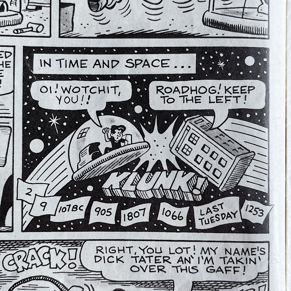 There are some fun little additions too (although that alien on the first page wasn’t Lew’s), like an apology to fellow OiNK cartoonist Davy Francis and marking the occasion of David Leach’s wedding. At the end you’ll see Pete was due to reappear in the Buster Book 1990 which readers of that comic would soon receive for Christmas. I didn’t move over to Buster (the comic or books) as I explained when I reviewed the early merged issues, but that’s something I’m going to correct this year.