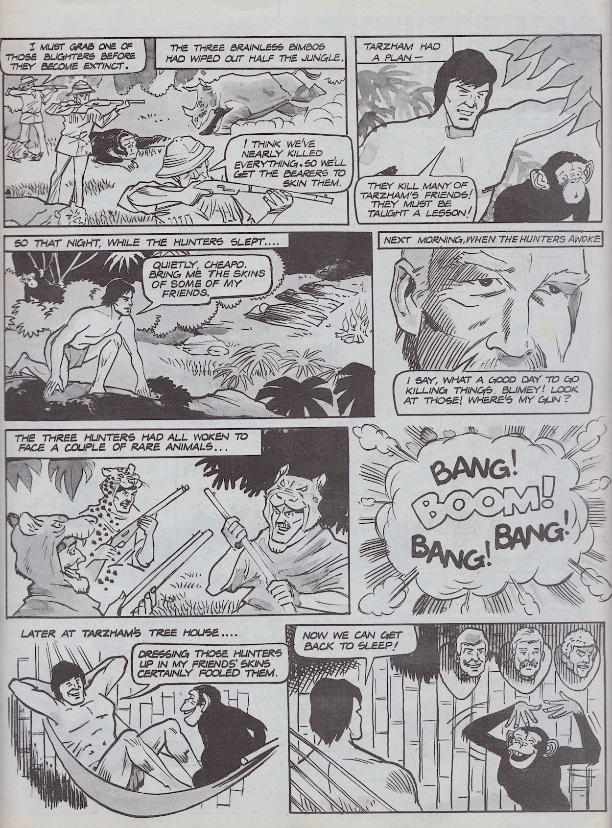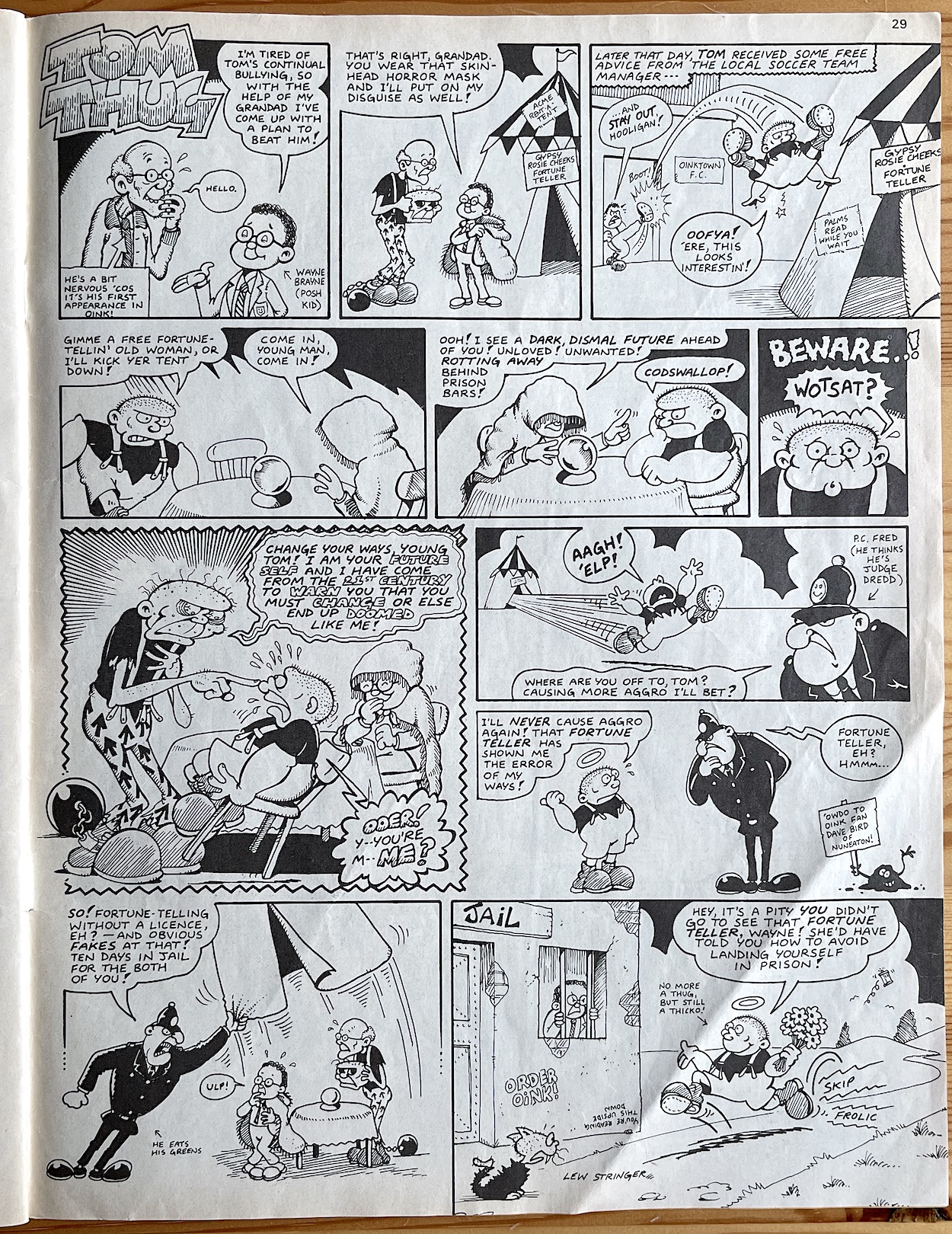 David Haldane‘s Rubbish Man also returns in the nine-page Plague of the Zombie Tortoises and it’s much better than his last strip in the monthlies; his idiocy has returned, as has (I’m very happy to say) his disgusting superpowers. So Jimmy got the send off he deserved in the end. Then on Tom Thug’s page is another classic Lew Stringer rhyming script with a plug for where we could find Tom for the next several years.