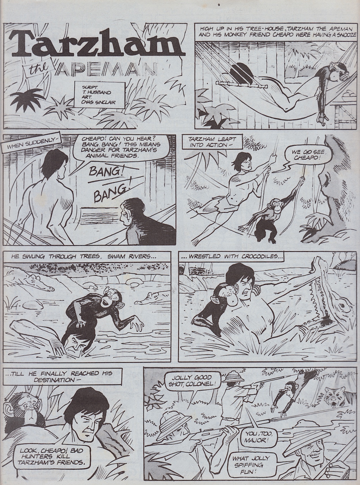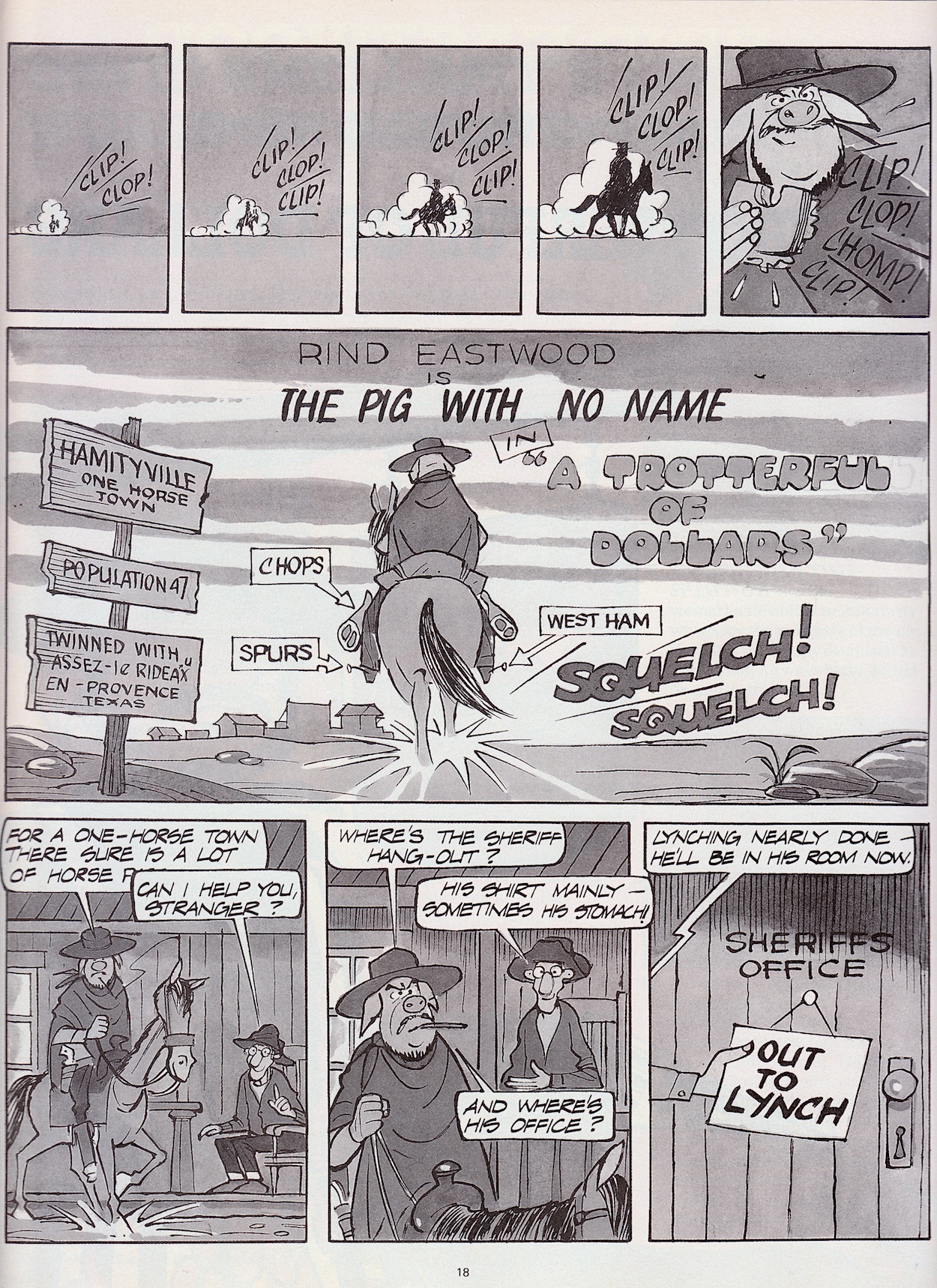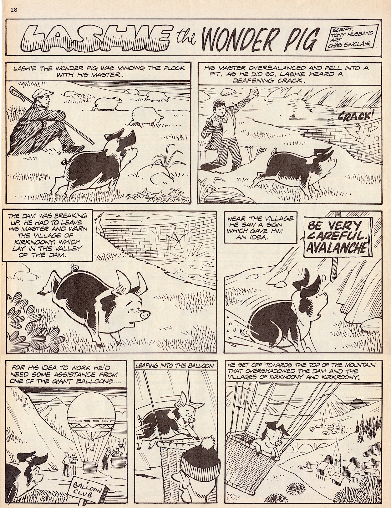 The third and final multi-part strip was most likely created for the weeklies, seeing as how it’s made up of two-page spreads with edited cliffhanger captions and even looks like it may have originally been in colour (there are black and white reprints of colour strips elsewhere with the same finish to them). Drawn by Chas Sinclair, The Pig With No Name takes on all of the clichés of cowboy and western movies. It’s one I remember laughing so hard at as a kid that I developed a little pain in my side. That moment comes on the second page below and I’m sure you can work out what bit I’m talking about.