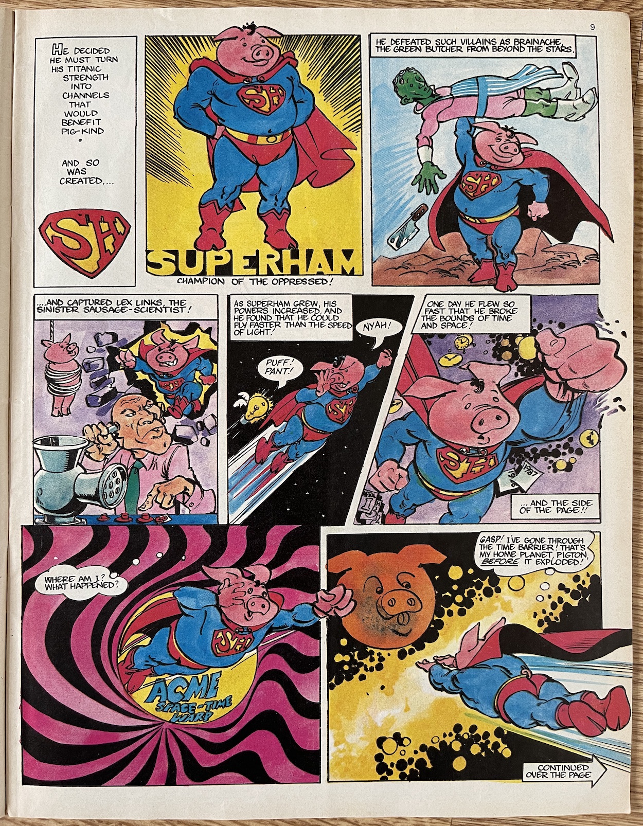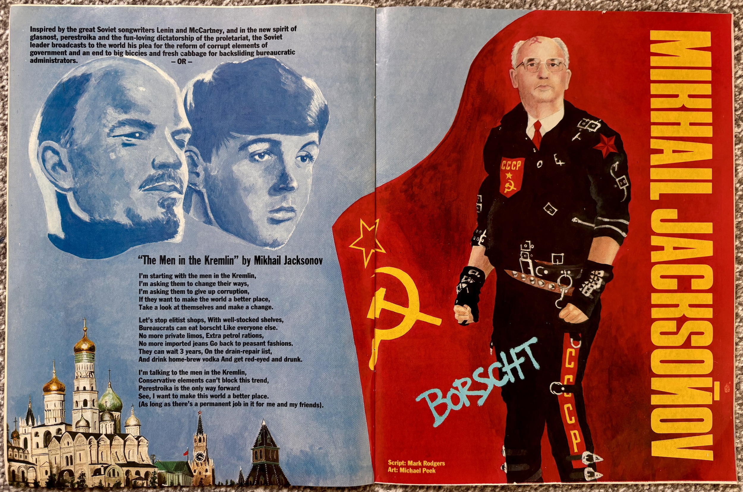A couple of pages later comes a double-page which shows how much OiNK had changed since its early days. Drawn by Mike Peek with admittedly very funny lyrics written by co-editor Mark Rodgers, this went way over my head at the time. The same thing happened a few times in the monthlies after publisher Fleetway’s well-intentioned (but misguided) tampering to push OiNK towards a slightly older teen audience.