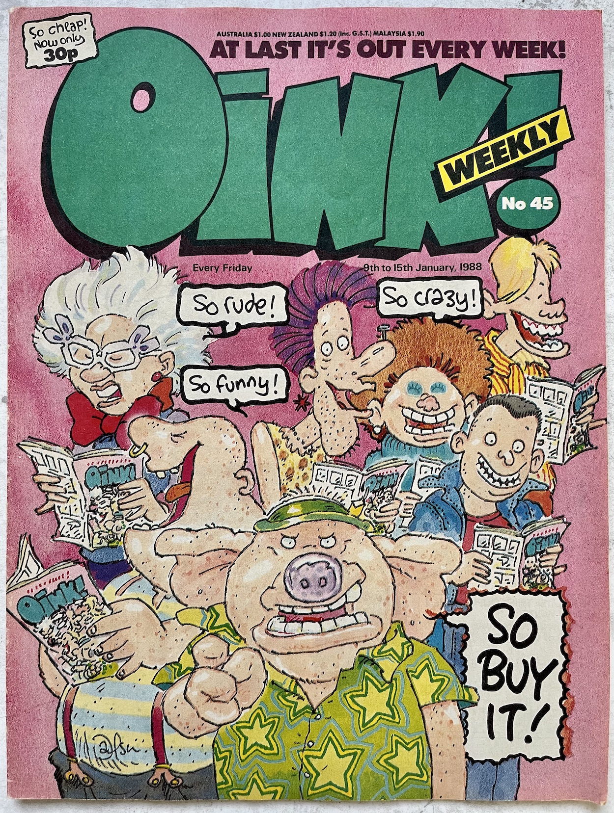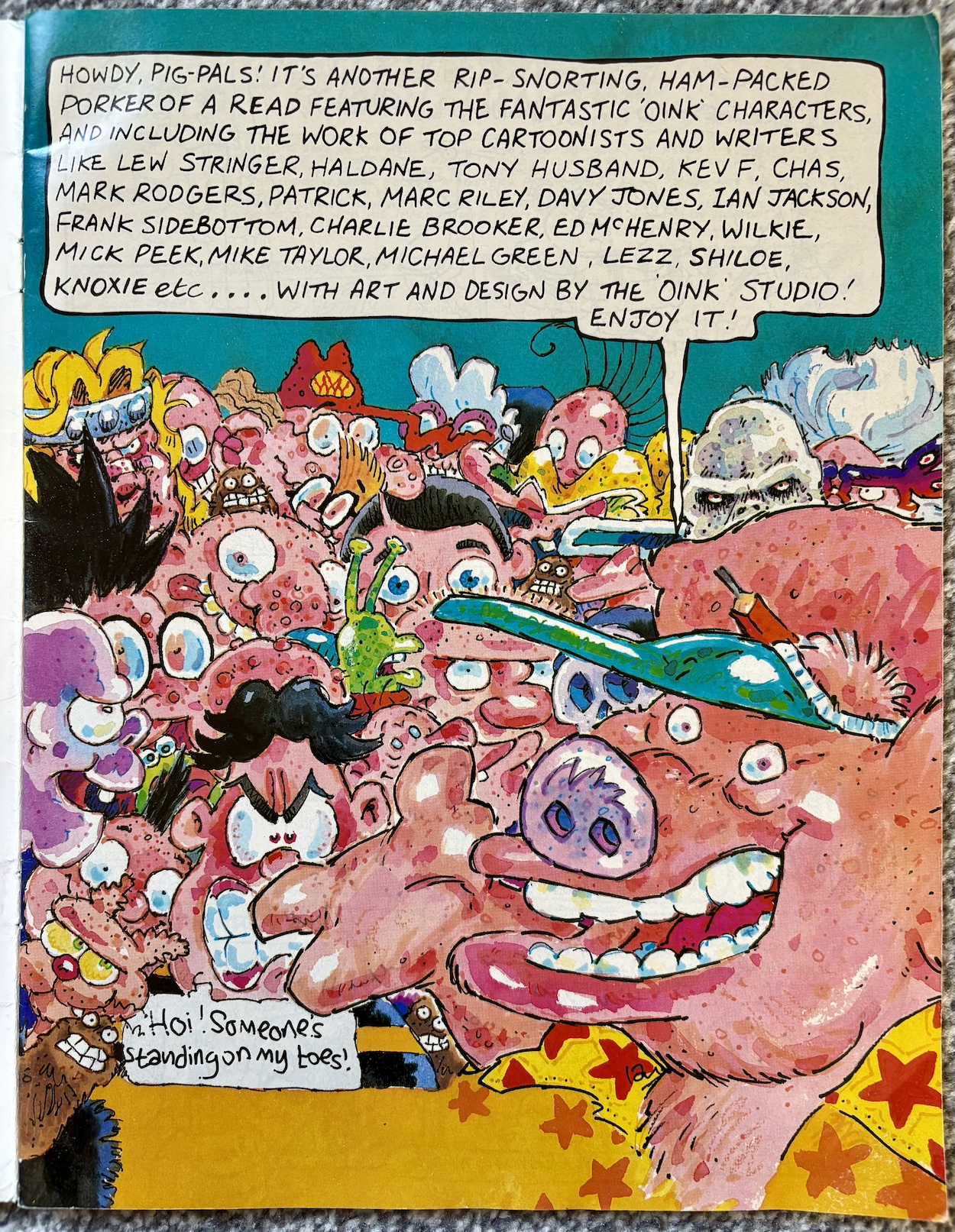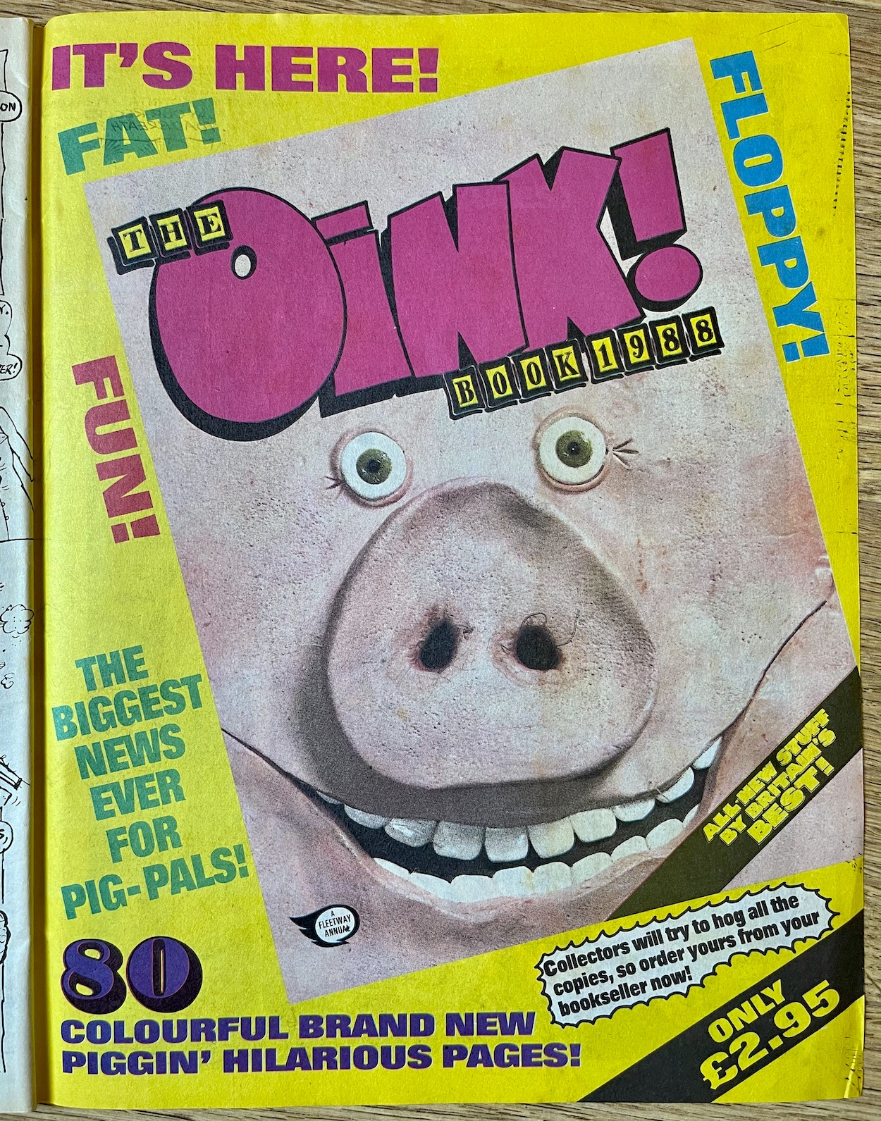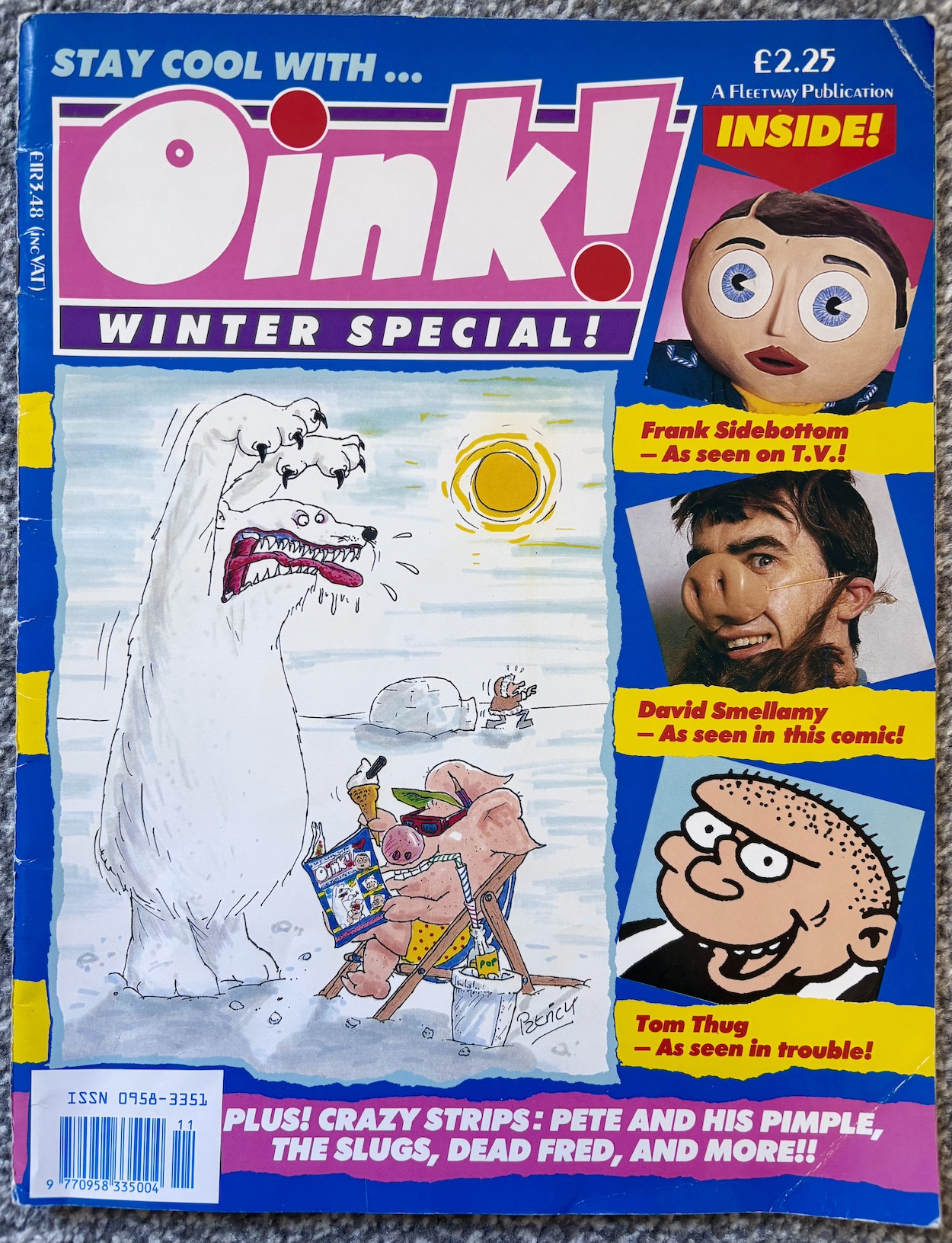 On a chilly November morning in 1989 I innocently toddled off to my local newsagent’s to pick up my Transformers, The Real Ghostbusters and Big Comic Fortnightly, only to be met with a lovely, glossy OiNK-shaped comic handed to me from the reservations box too! I’d no idea this was coming. I’d thought the Holiday Special from earlier in the year was the final issue ever. Seeing no annual on the shelves by now I’d given up hope of ever seeing a new OiNK again.