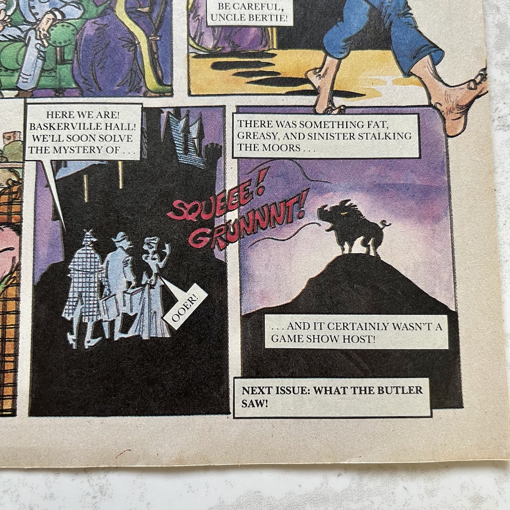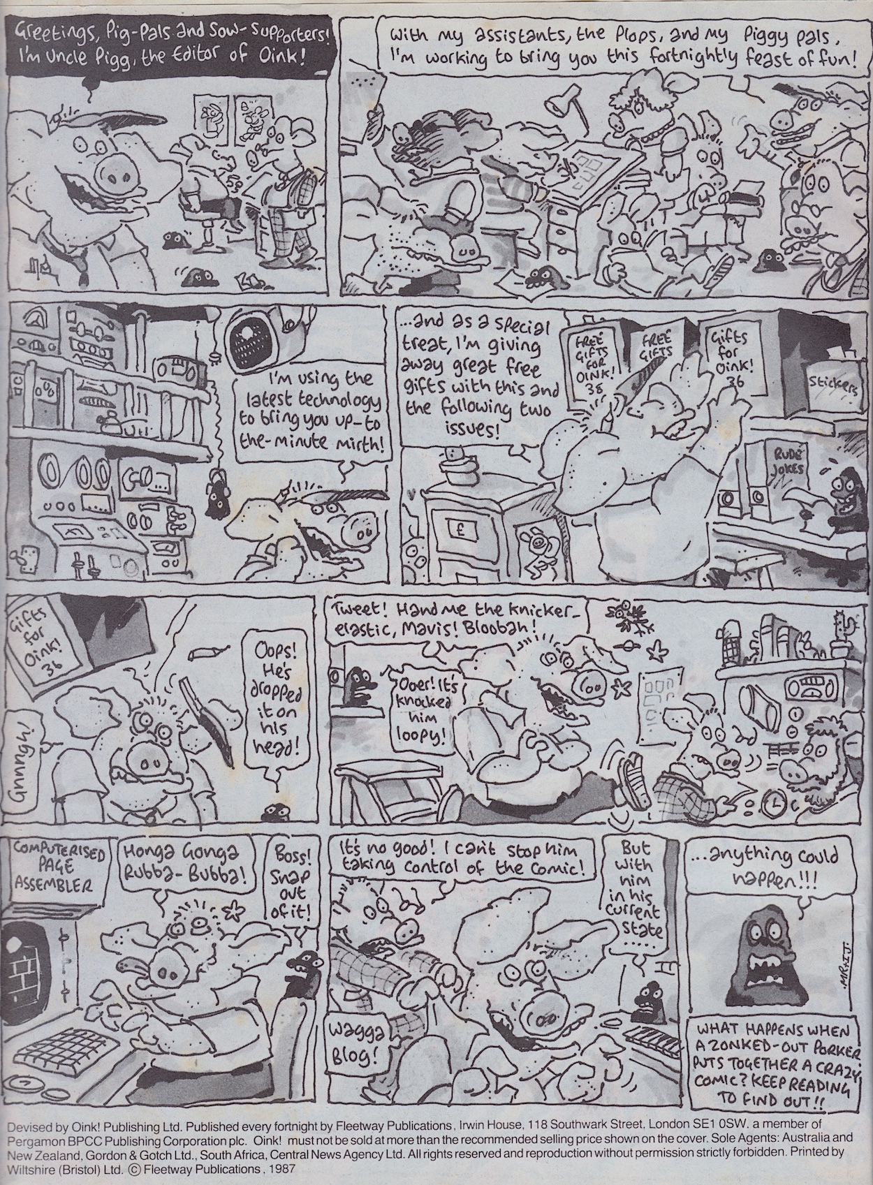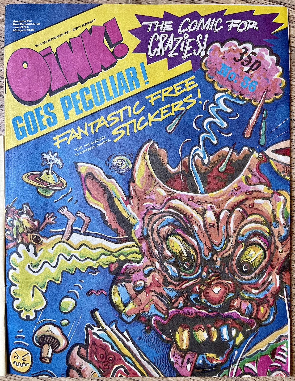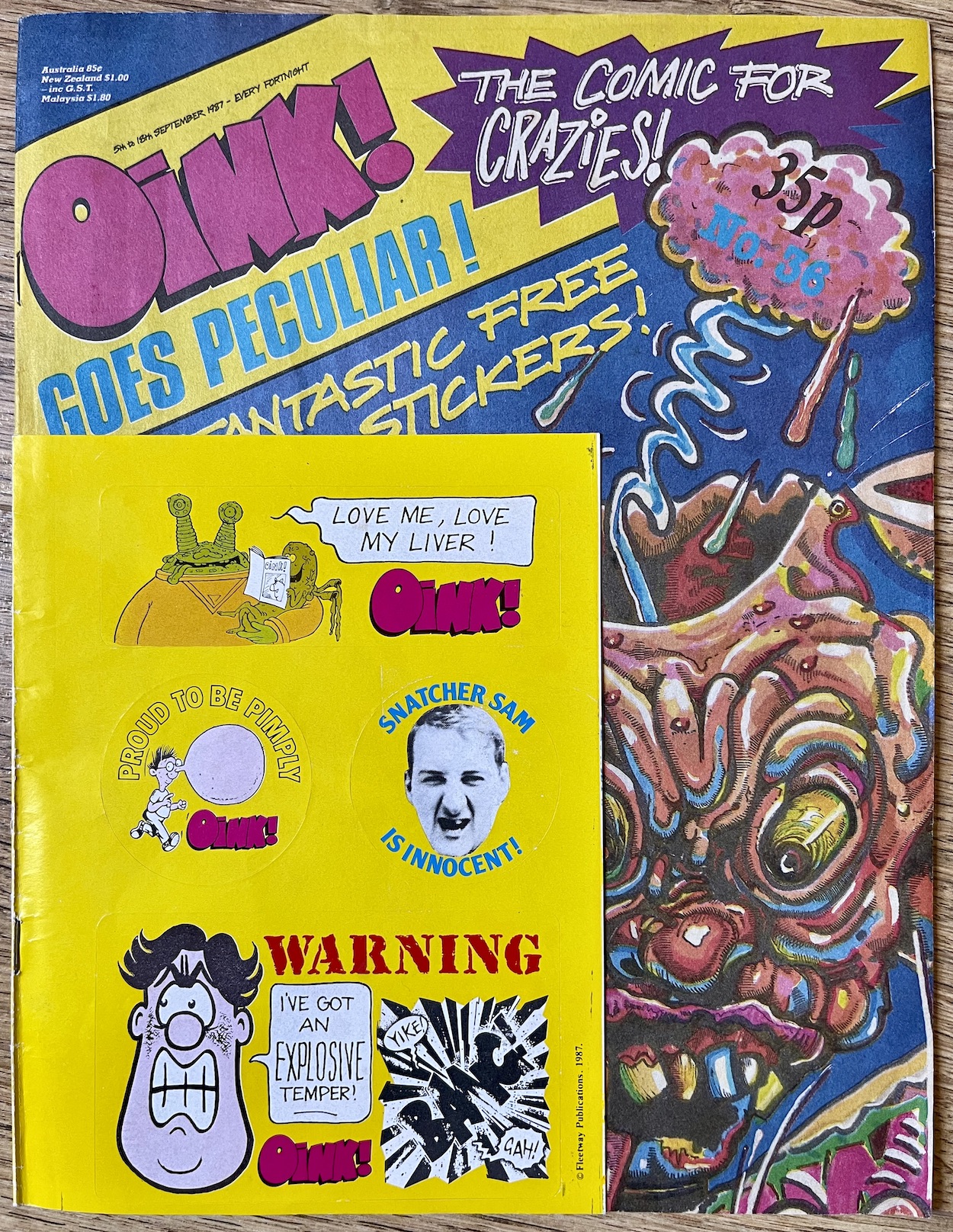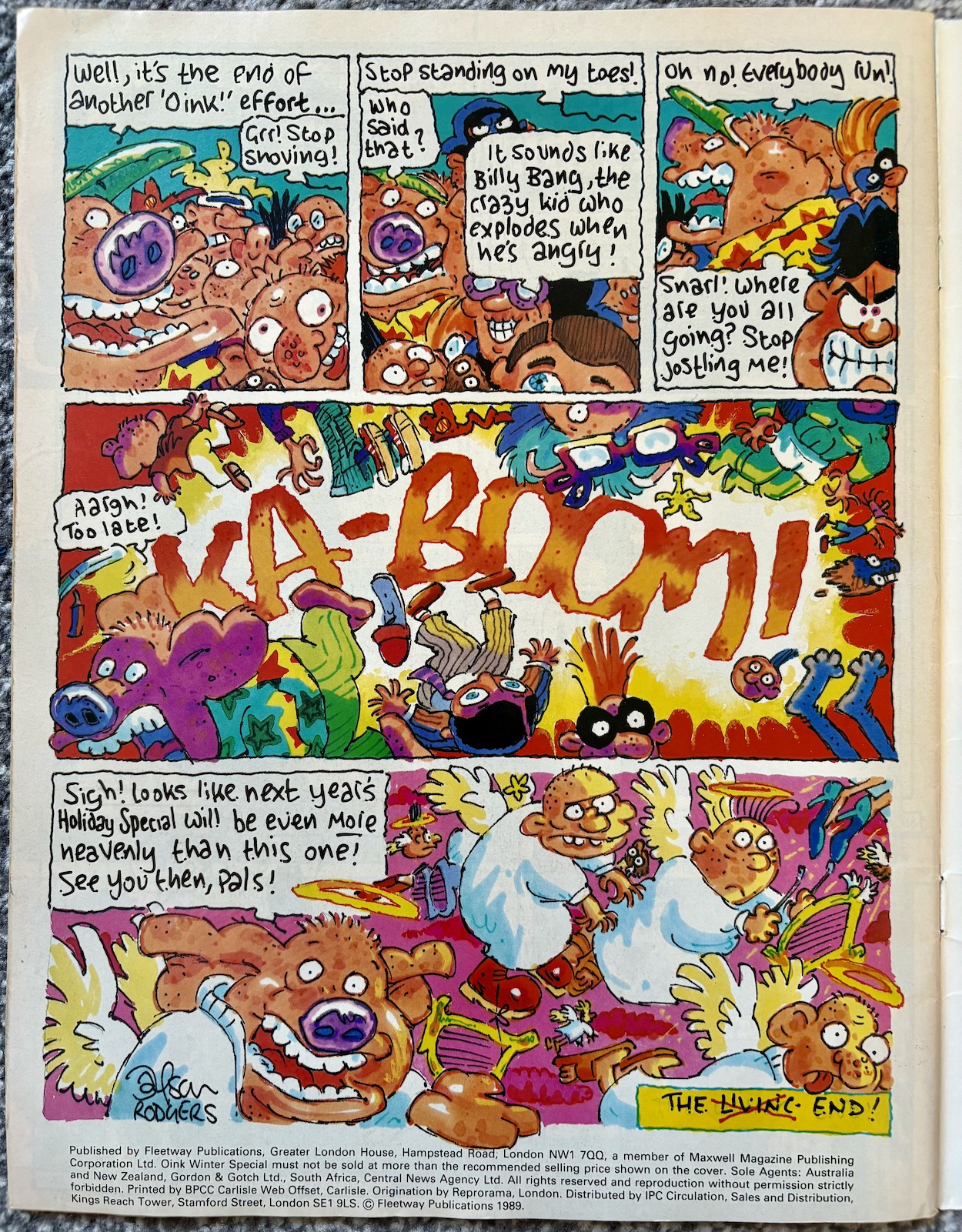 On a chilly November morning in 1989 I innocently toddled off to my local newsagent’s to pick up my Transformers, The Real Ghostbusters and Big Comic Fortnightly, only to be met with a lovely, glossy OiNK-shaped comic handed to me from the reservations box too! I’d no idea this was coming. I’d thought the Holiday Special from earlier in the year was the final issue ever. Seeing no annual on the shelves by now I’d given up hope of ever seeing a new OiNK again.