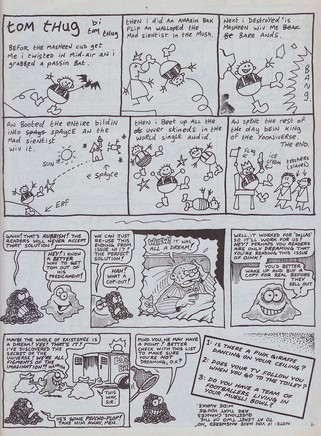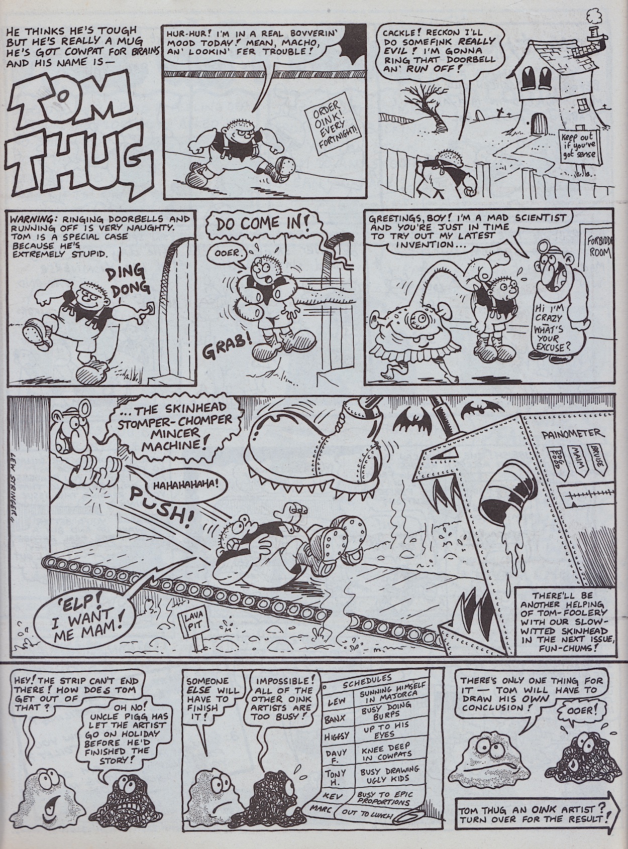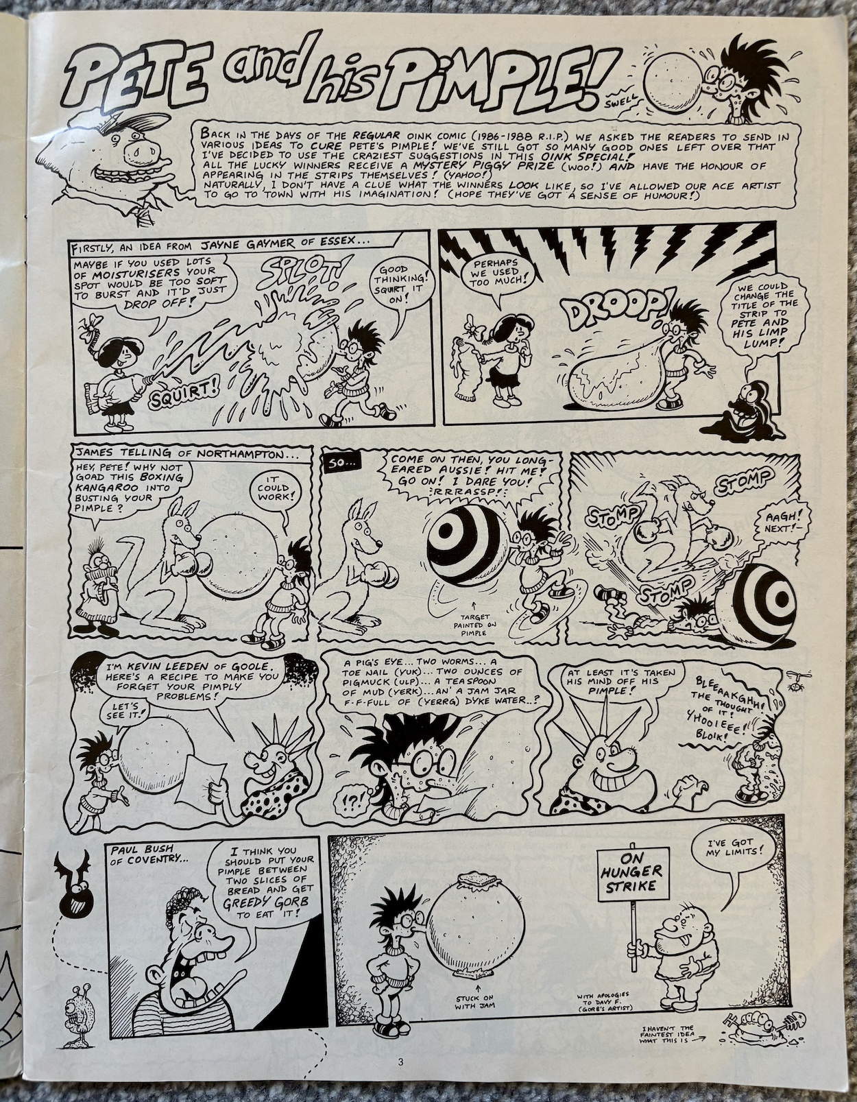 The team that were still working on it were definitely producing the goods, however OiNK was at its best when it was a children’s comic that could be read and enjoyed by anyone of any age, rather than a comic with a teen-and-older target audience that could (upon occasion) alienate its younger readers. Don’t get me wrong, as an adult it’s all very funny, but a few bits and pieces feel like they would’ve been better suited to a comic like Gas, which a lot of the OiNK team did contribute to (look out for that at a future date).