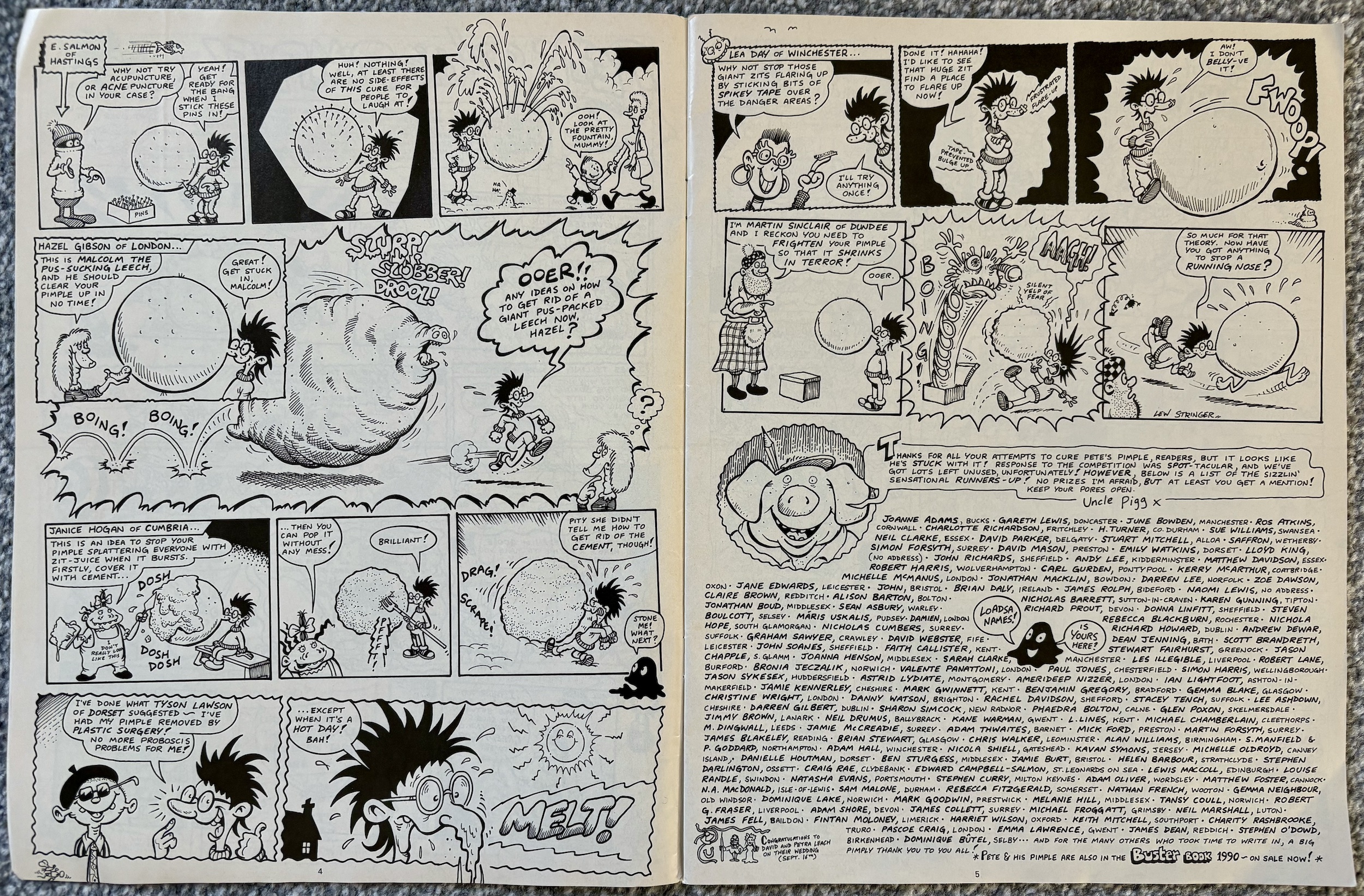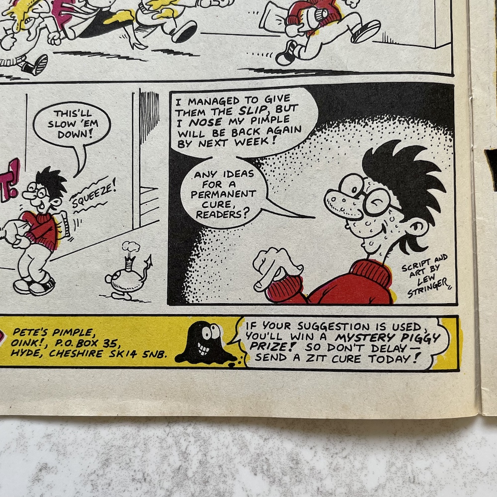 We kick things off with a fun three-page Pete and his Pimple and it’s great to see him back after missing him in the Holiday Special earlier this year, when he and Tom Thug (who also returns in this issue) kept themselves to Buster comic instead. With this being the final Pete strip in an OiNK, Lew Stringer decided to pick no less than ten reader ideas for ridding Mr. Throb of his pimple and, while they’re all fun, the best part for me is Lew’s interpretations of what the readers could’ve looked like!