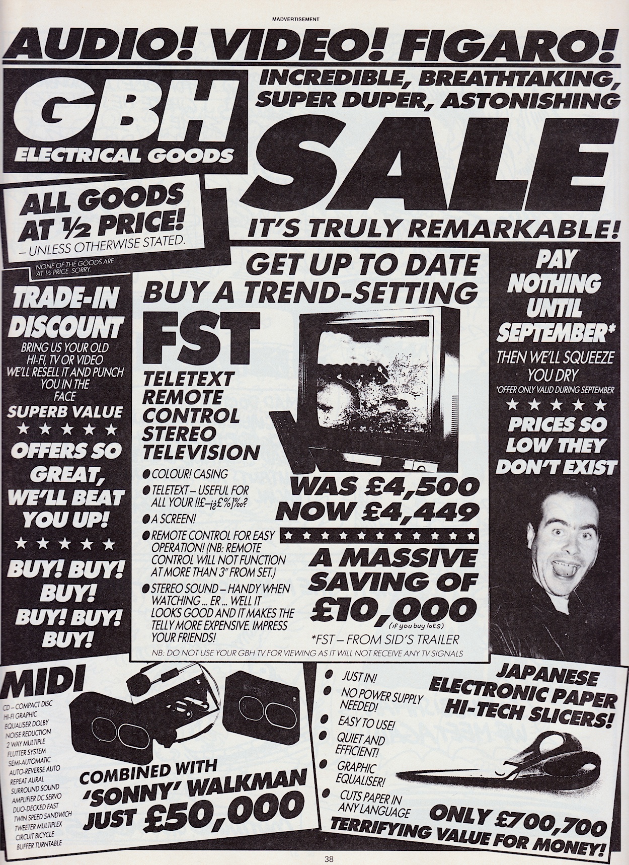 The photo of Patrick is reprinted from an earlier Grunts page but everything else here in GBH’s newest scam is brand new. The small print under the “All Goods At 1/2 Prince Unless Otherwise Stated” headline, the not-at-all-subtle dig at 80s marketing for new fangled music equipment and of course the boasts about the very ordinary features their TV includes are all classic GBH! I’m going to miss these gangsters.