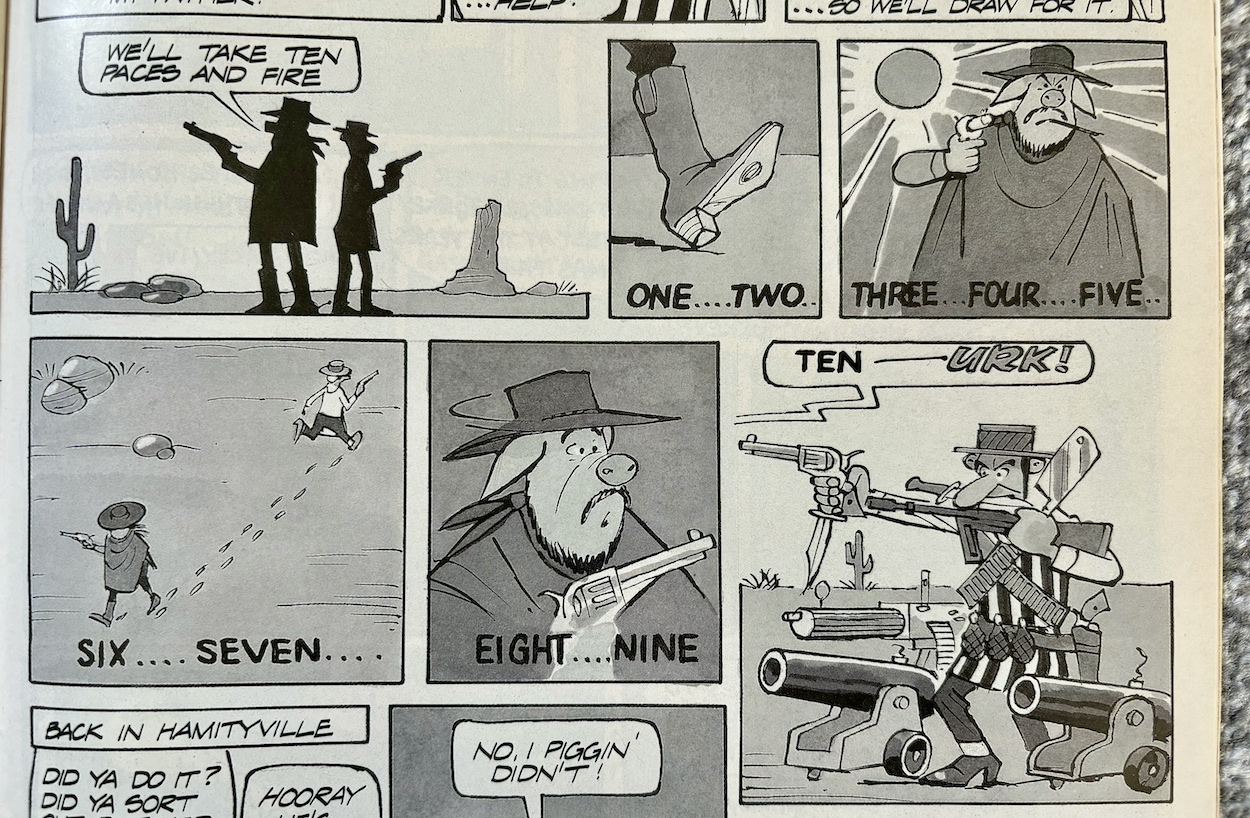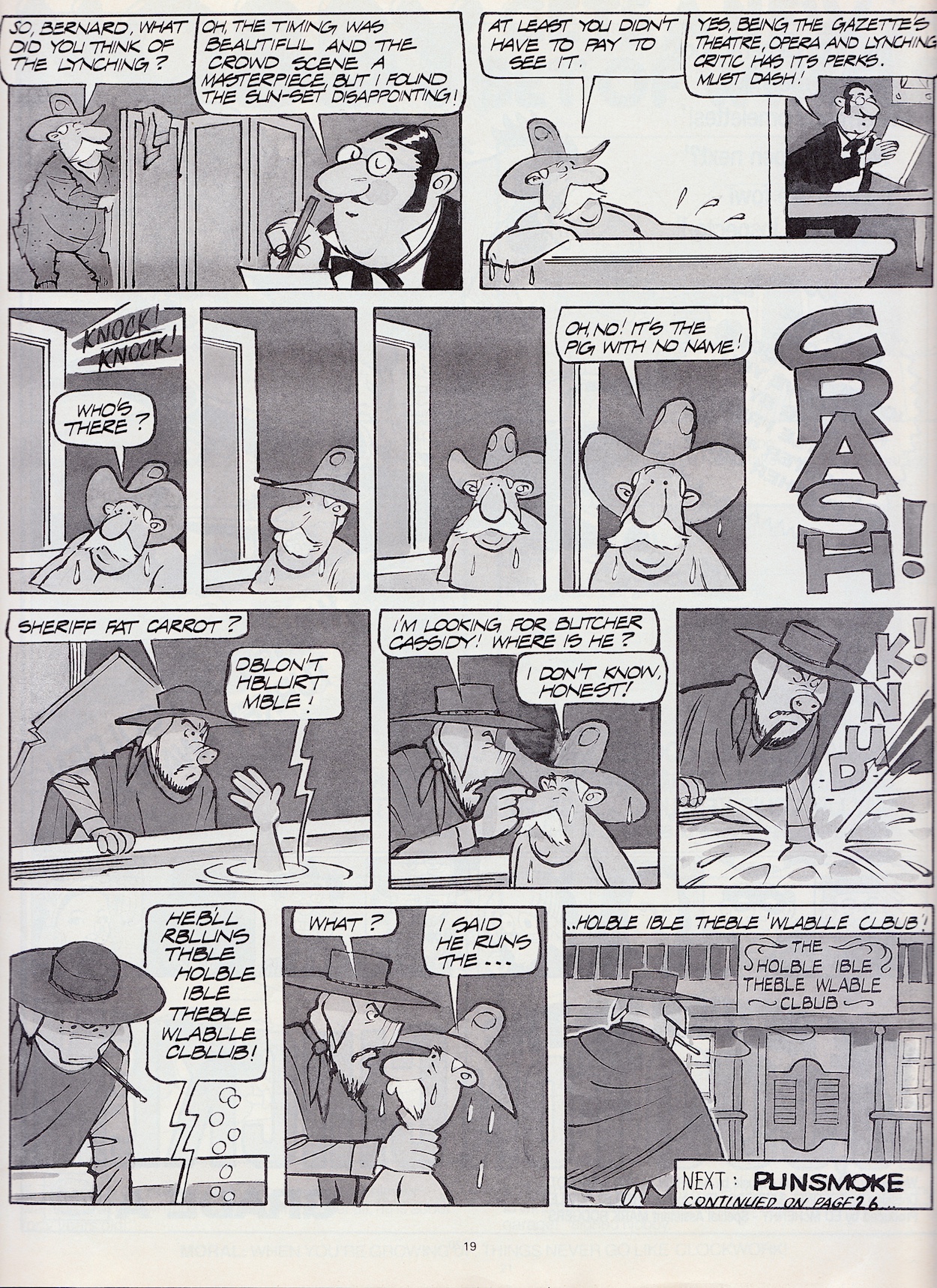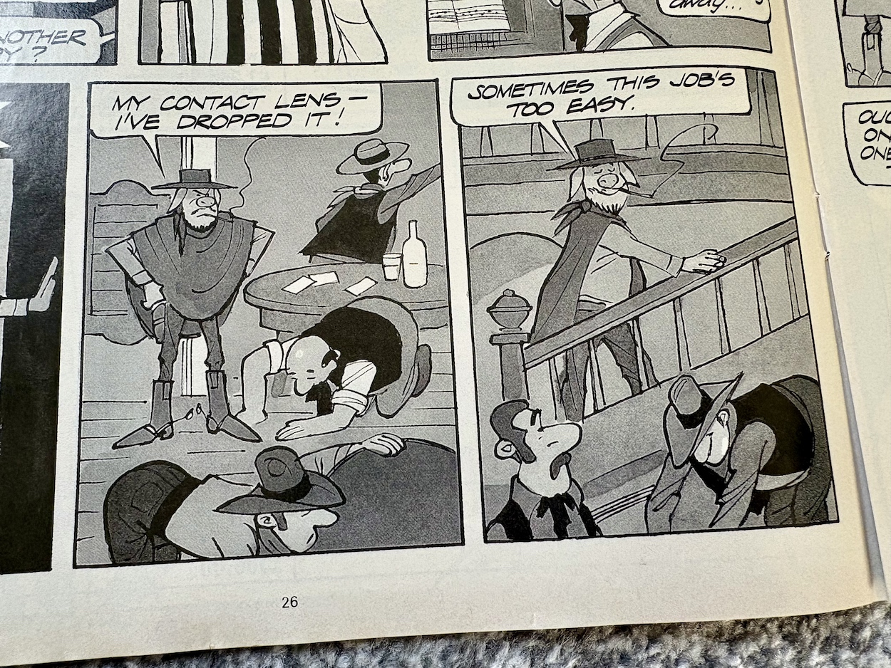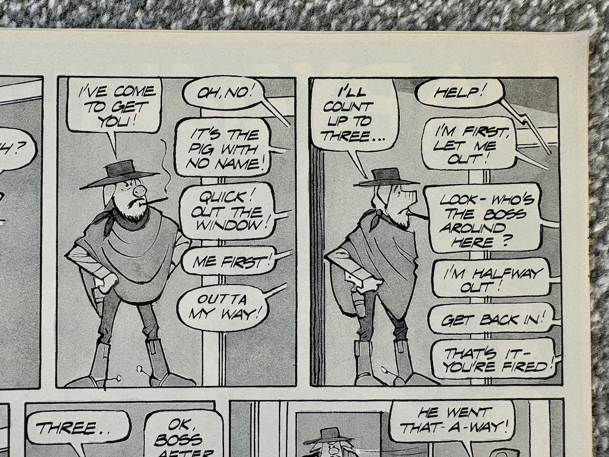 After I picked myself back up from that bathroom door scene the rest of the story is a cracker (crackling?). In part two the usual man-enters-a-saloon-and-everyone-stops scene is spoofed, quickly followed by the evil butcher villain and his men having a complete panic and showing the reader what really must go on behind the door in such scenes in these movies. Then finally, it all builds up to the stereotypical quick draw and ends with a hilarious, surprising defeat!