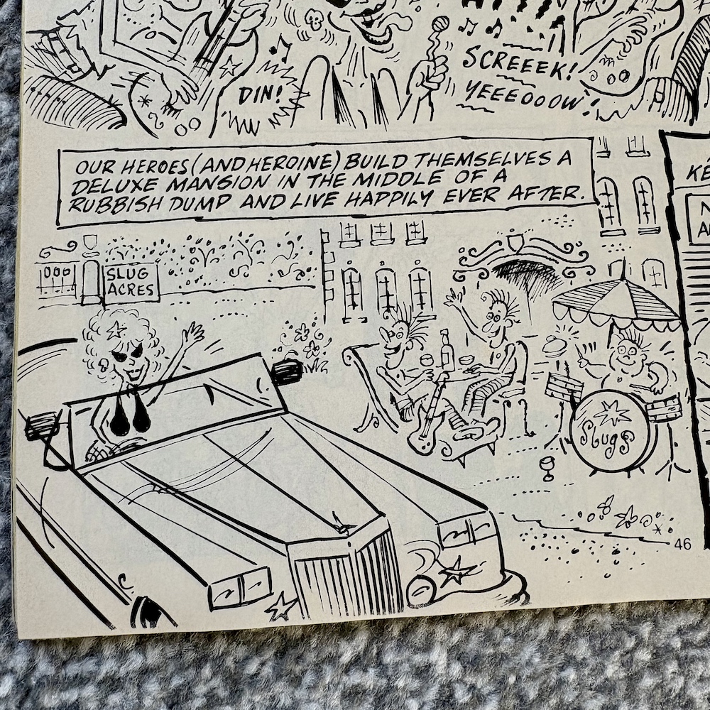There are a few even larger strips here too, such as an eight-page story for The Slugs, although it’s written by Charlie Brooker and Mark Rodgers instead of Tony Husband, the first time that’s happened, but it’s still brilliantly brought to the page by Lezz. It involves the band being told they need a female lead singer by their agent and it’s funny what their main complaint about this is! But Anna Key is even louder and more obnoxious than they are and it brings their adventures to a happy ending.