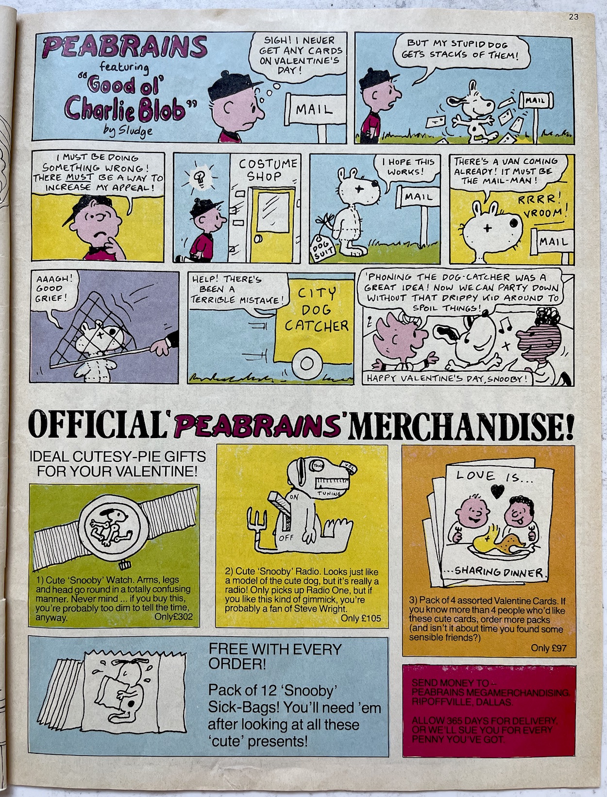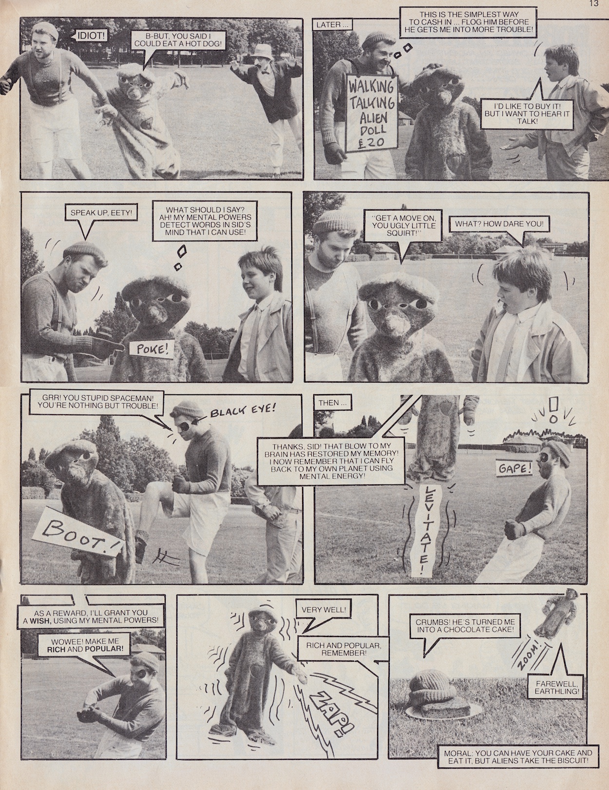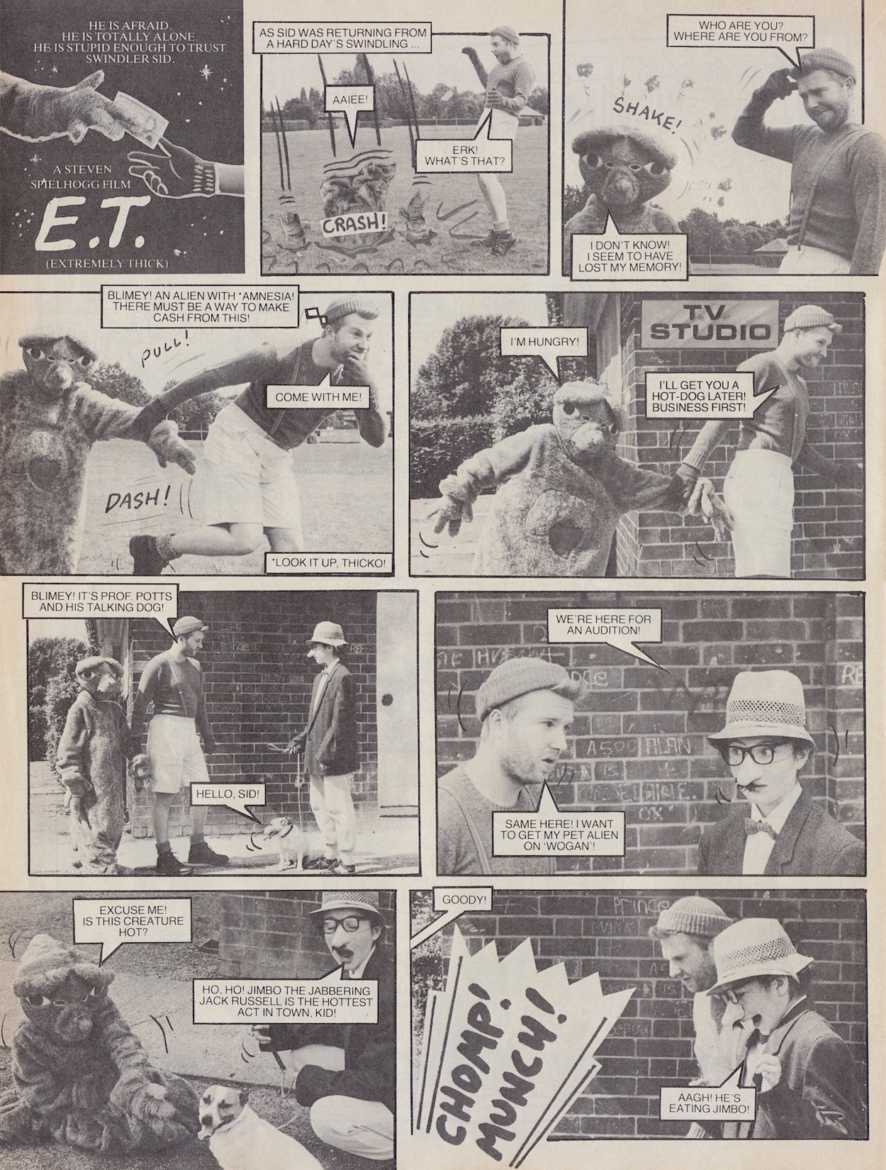 It almost feels a shame to have it inside the comic but when you see what’s on the back page you’ll understand. So let’s have a quick look at some of the other highlights of the issue. There’s a photo story made up of a series of mini-strips running throughout the issue which combines the best (worst?) of American and British television, in the King Solomon’s Swines serial Sir Herbert Quarterbrain‘s attempt at pleasing the enemy backfires and Horace (Ugly Face) Watkins makes a stand against some new friends. Also, Burp gets to enjoy all those fantastic 80s 3D feature films in the comfort of his own home and The Spectacles of Doom makes a funny reference to a song which at the time was actually banned.