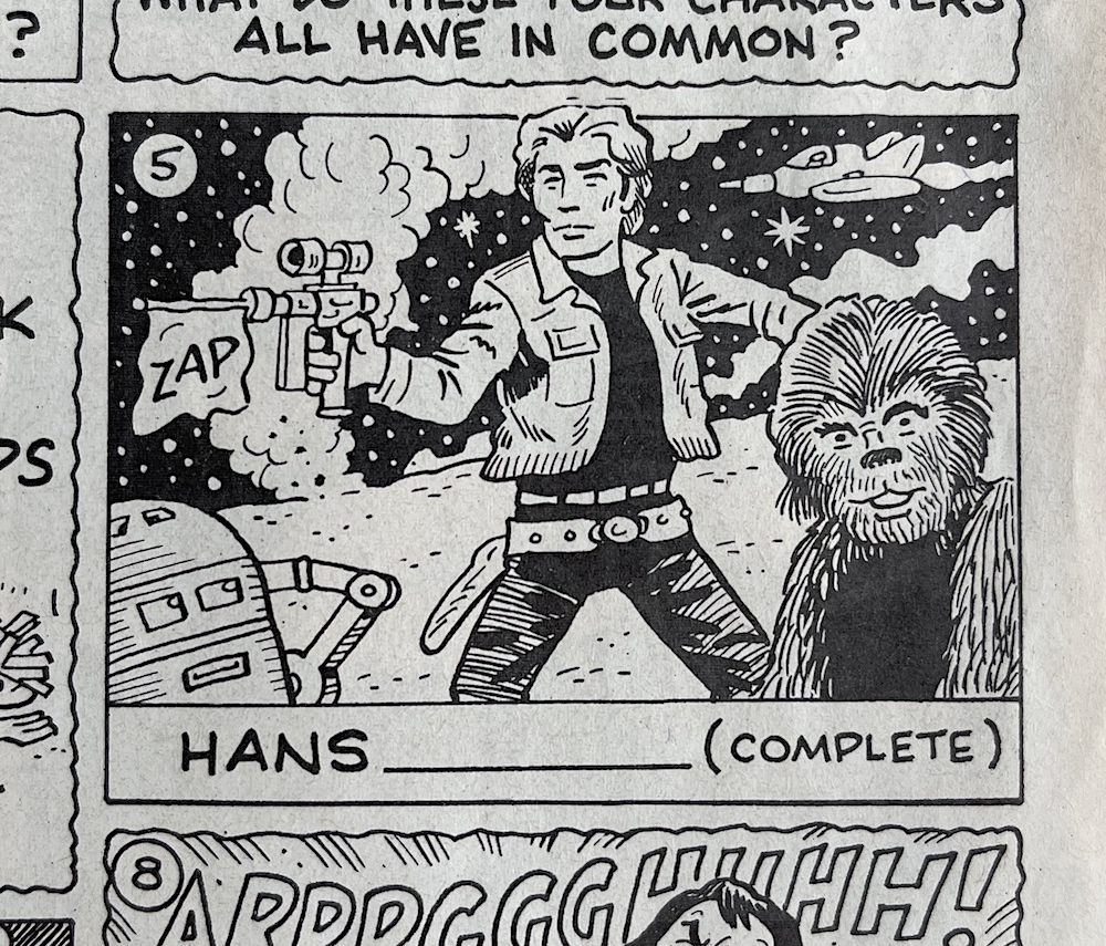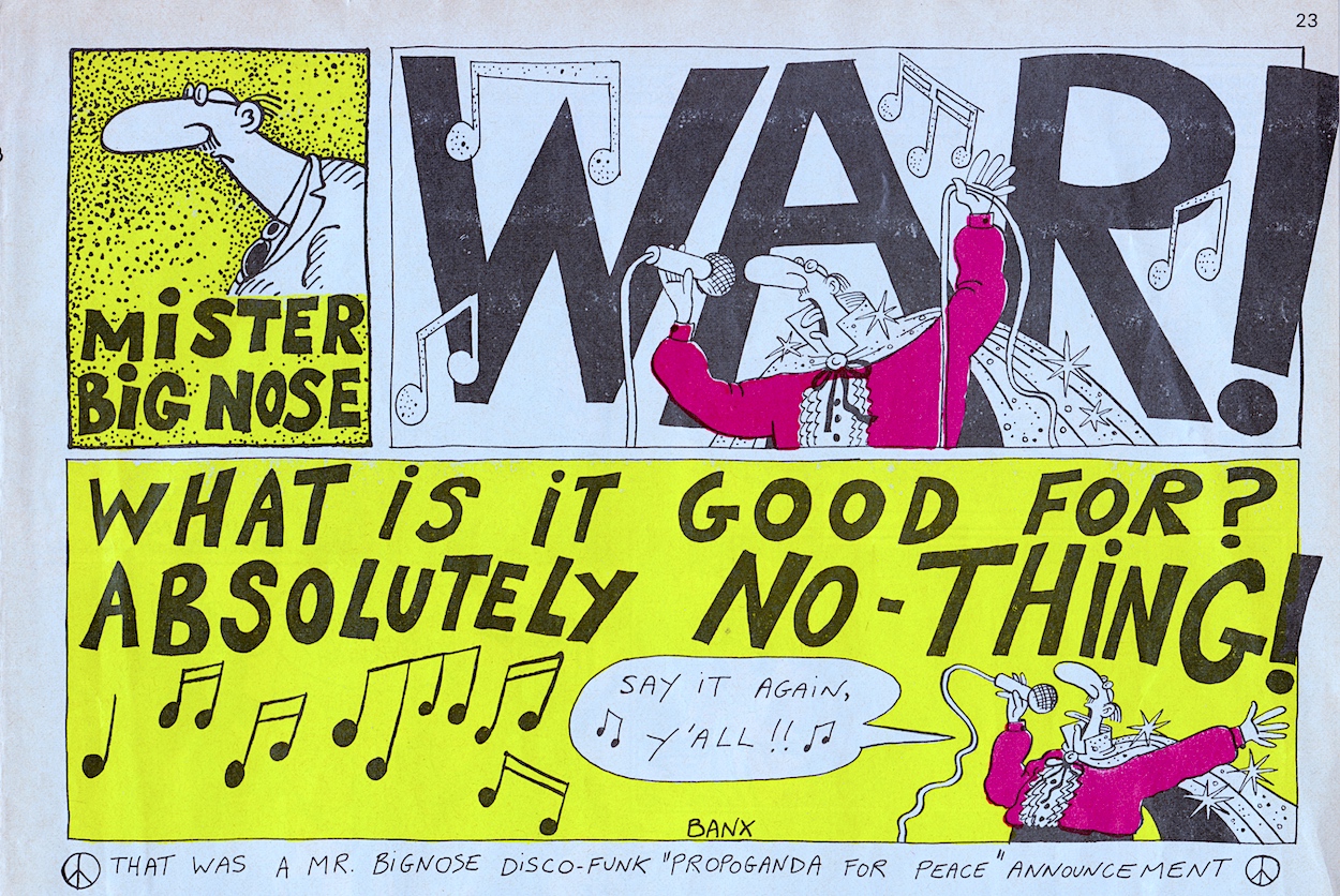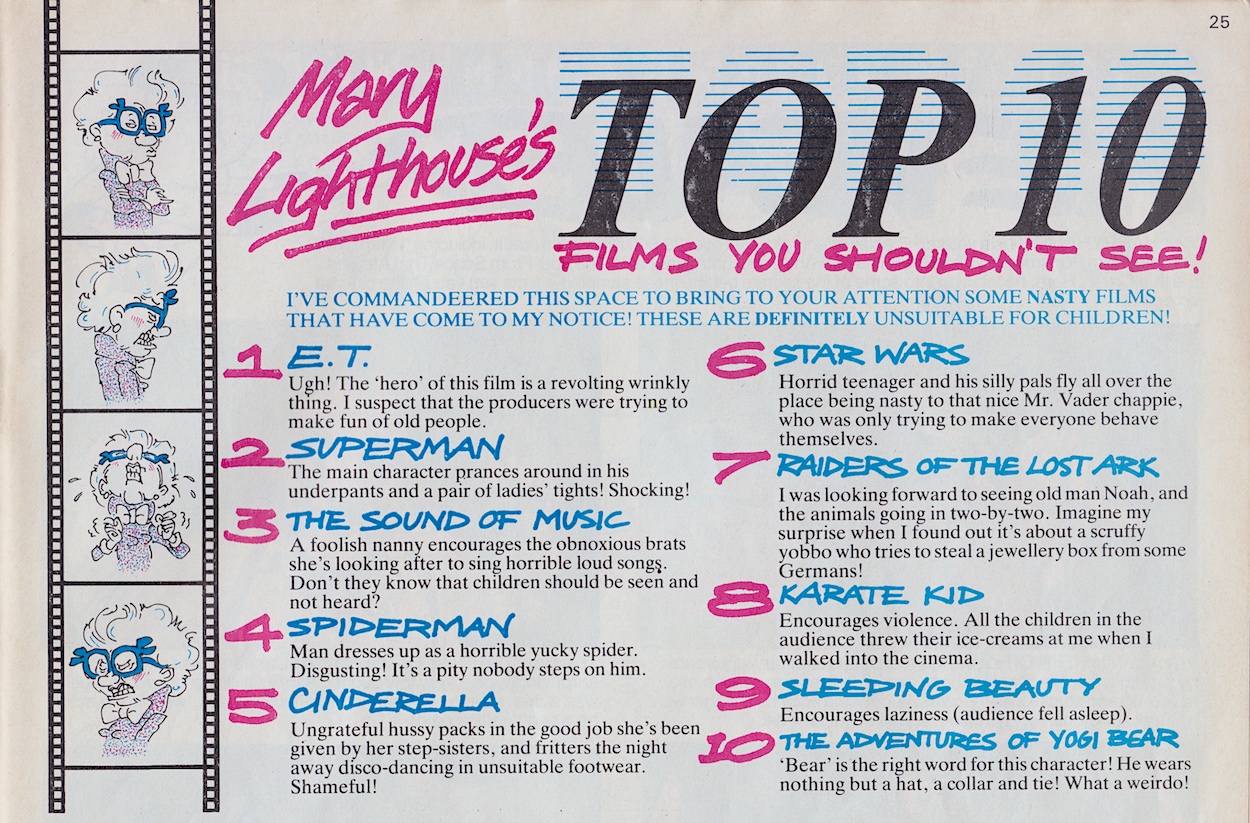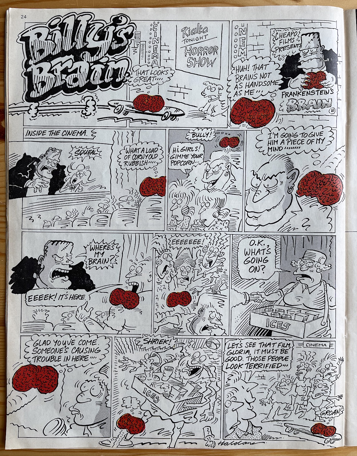 It almost feels a shame to have it inside the comic but when you see what’s on the back page you’ll understand. So let’s have a quick look at some of the other highlights of the issue. There’s a photo story made up of a series of mini-strips running throughout the issue which combines the best (worst?) of American and British television, in the King Solomon’s Swines serial Sir Herbert Quarterbrain‘s attempt at pleasing the enemy backfires and Horace (Ugly Face) Watkins makes a stand against some new friends. Also, Burp gets to enjoy all those fantastic 80s 3D feature films in the comfort of his own home and The Spectacles of Doom makes a funny reference to a song which at the time was actually banned.