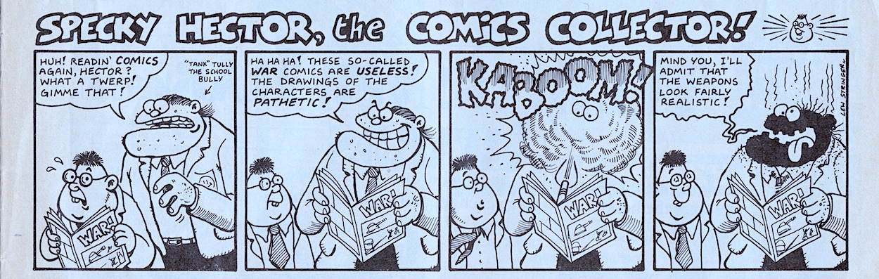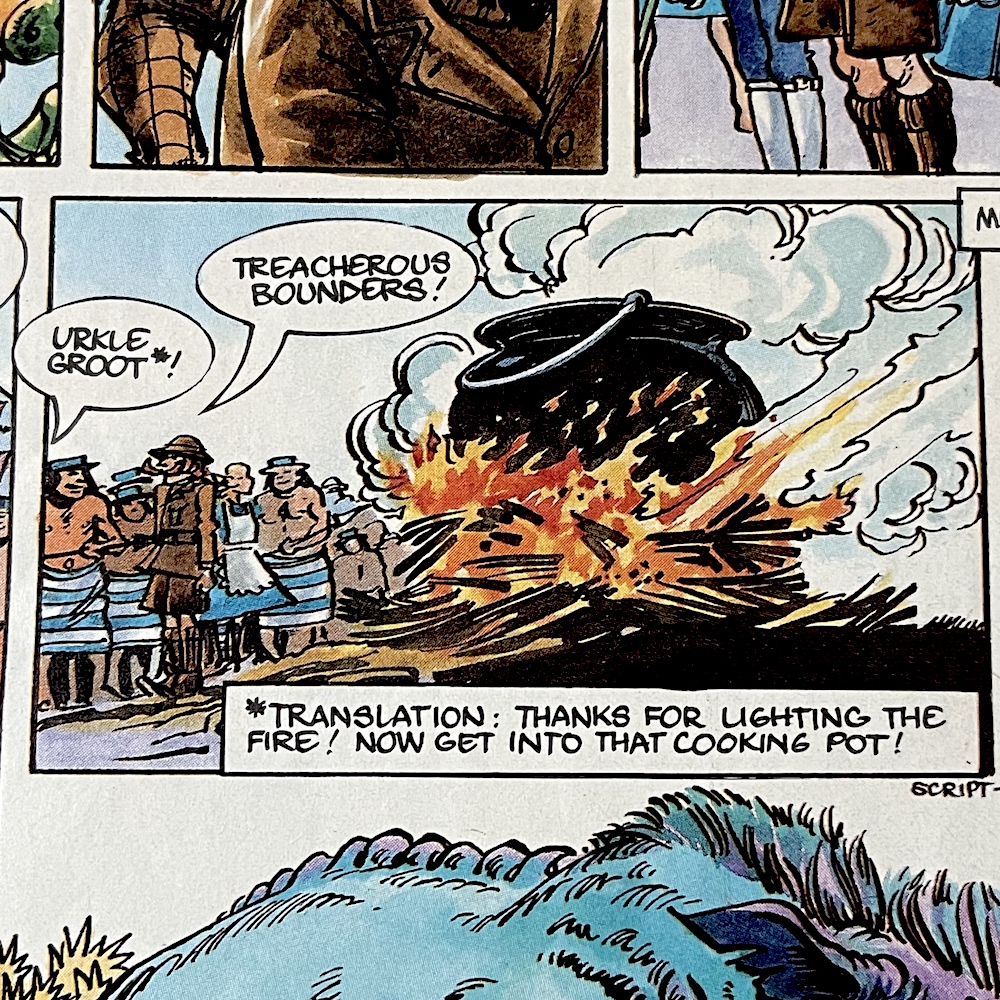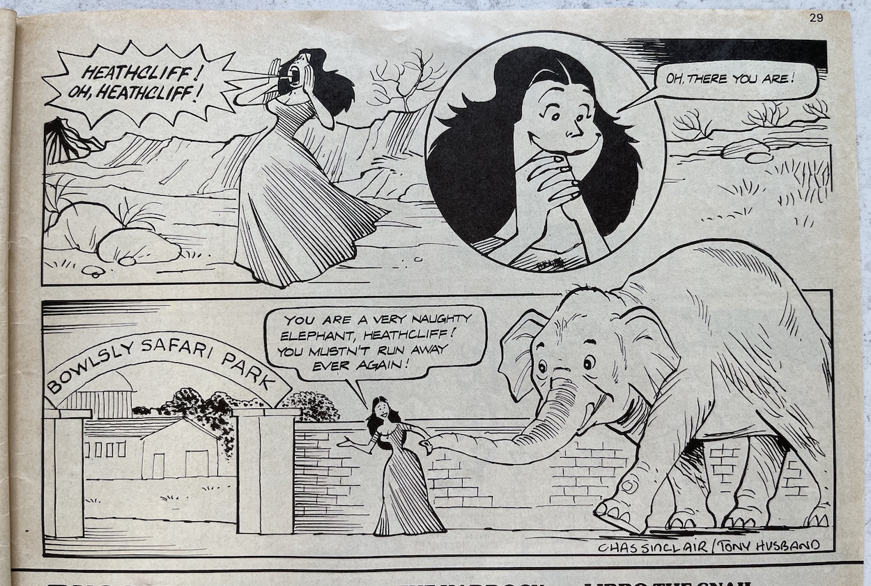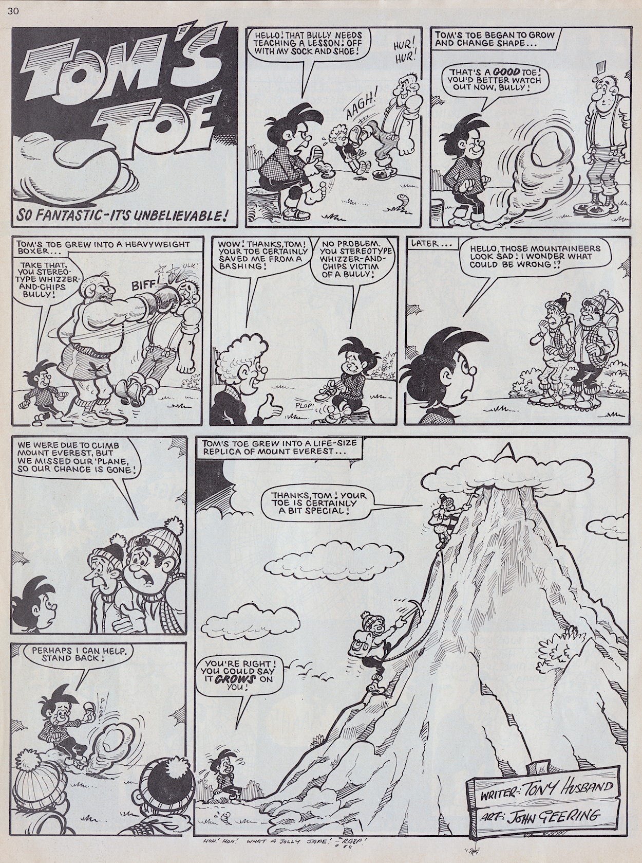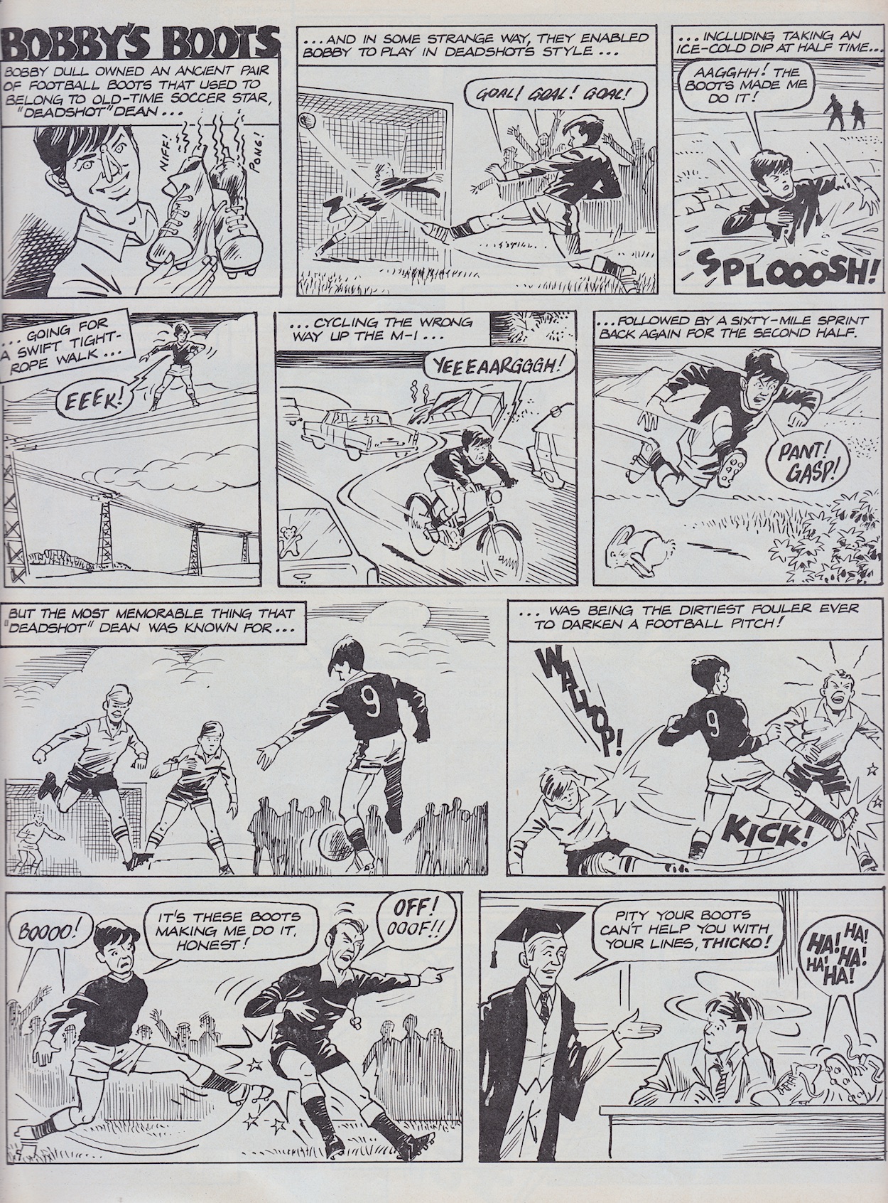According to Lew the bit at the bottom was an addition co-editor Mark Rodgers asked for (and wrote). The idea behind the strip was to shock children into paying attention when they crossed the road, but he believes Mark may have thought it could be misconstrued as making fun of road deaths, hence the Green Hog Code being added. It’s a great addition and after the ending I think it’s funny to have a pig come in with their stern look and tell us off. The strip itself is brilliant and this wraps it up as if the whole page was spoofing those Green Cross Code videos and leaflets we saw so much of as kids.