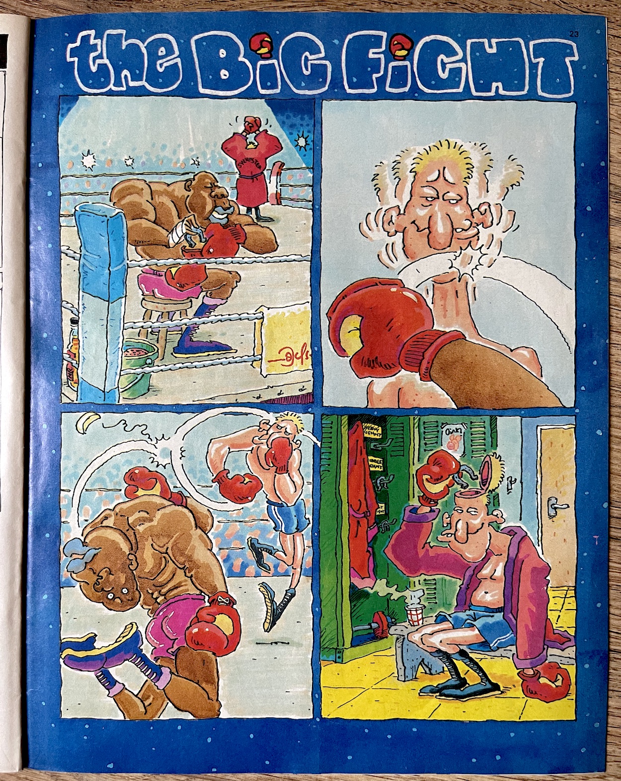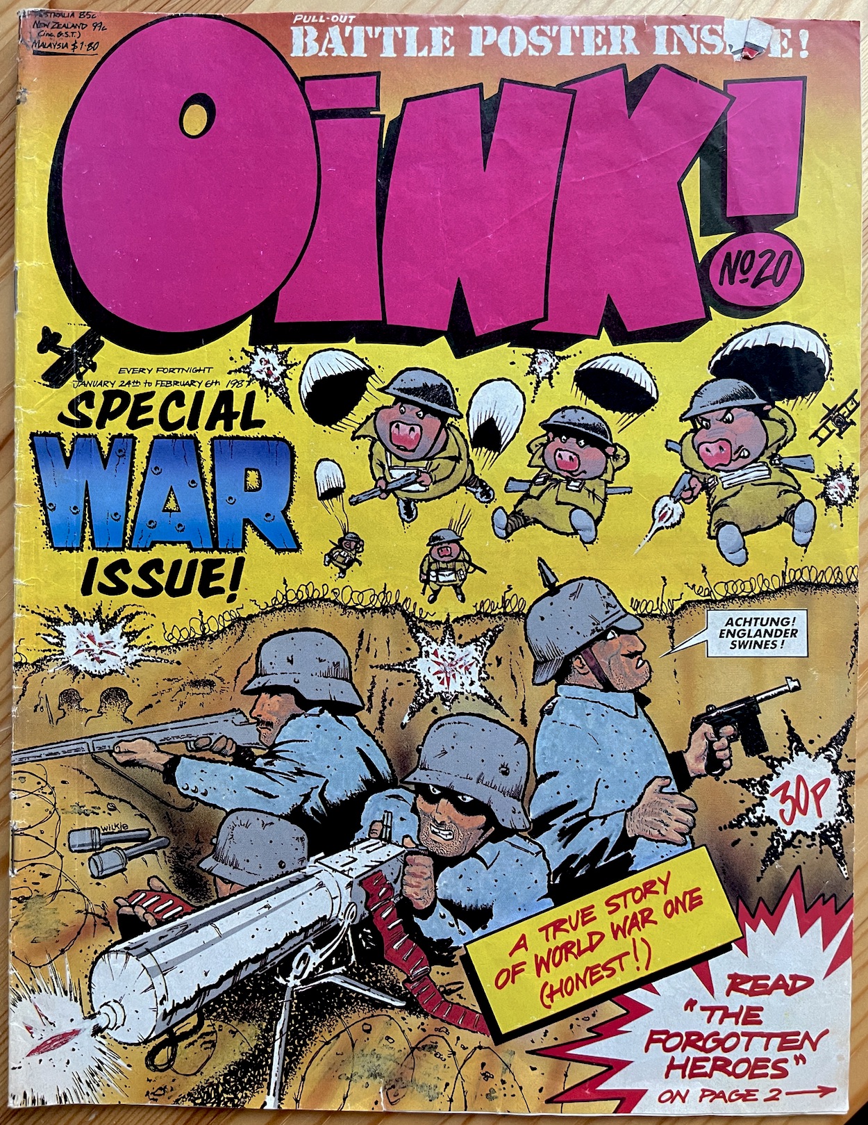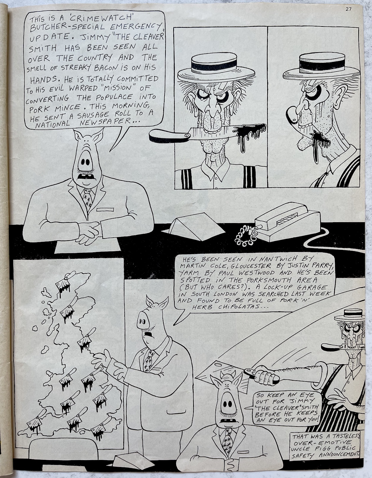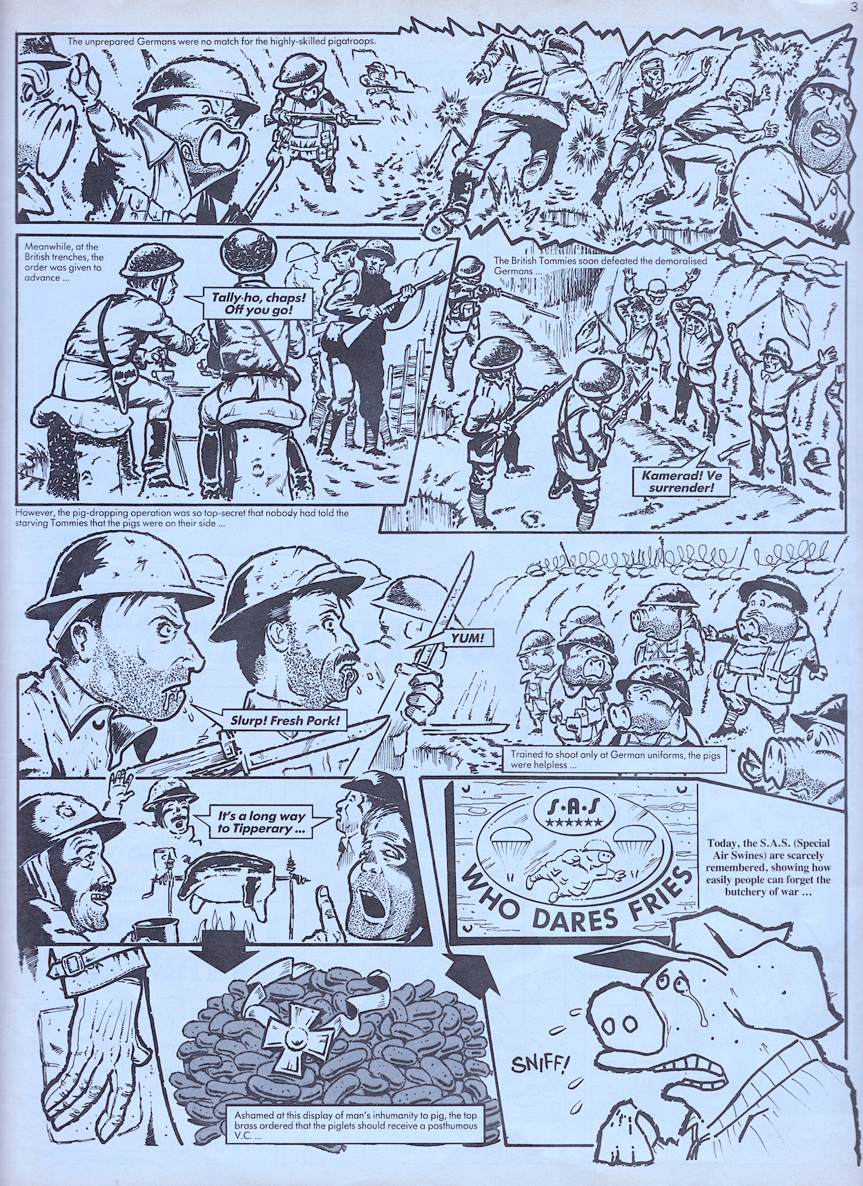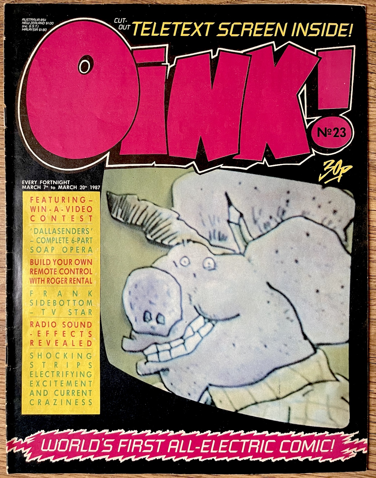 OiNK finished its regular run in 1988 but a couple of years later I was in my second year of grammar school and a new kid had joined our class. Because he hadn’t been taught Latin in the first year of his previous school he had to sit out those lessons, and was meant to use the 35 minutes of that classroom to study. On one occasion however, I happened to have the OiNK! Summer Collection with me, the final special released after the comic had finished made up almost entirely of reprint material. The next page from this issue was one of those reprints.