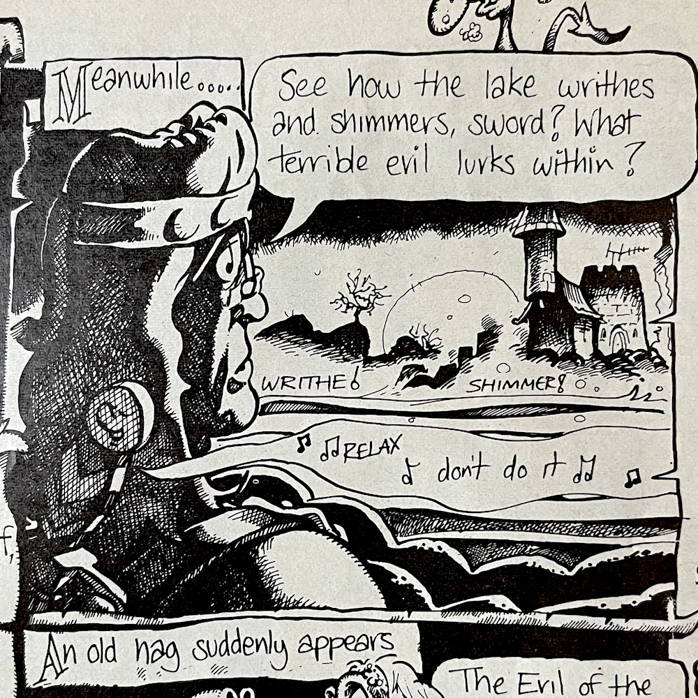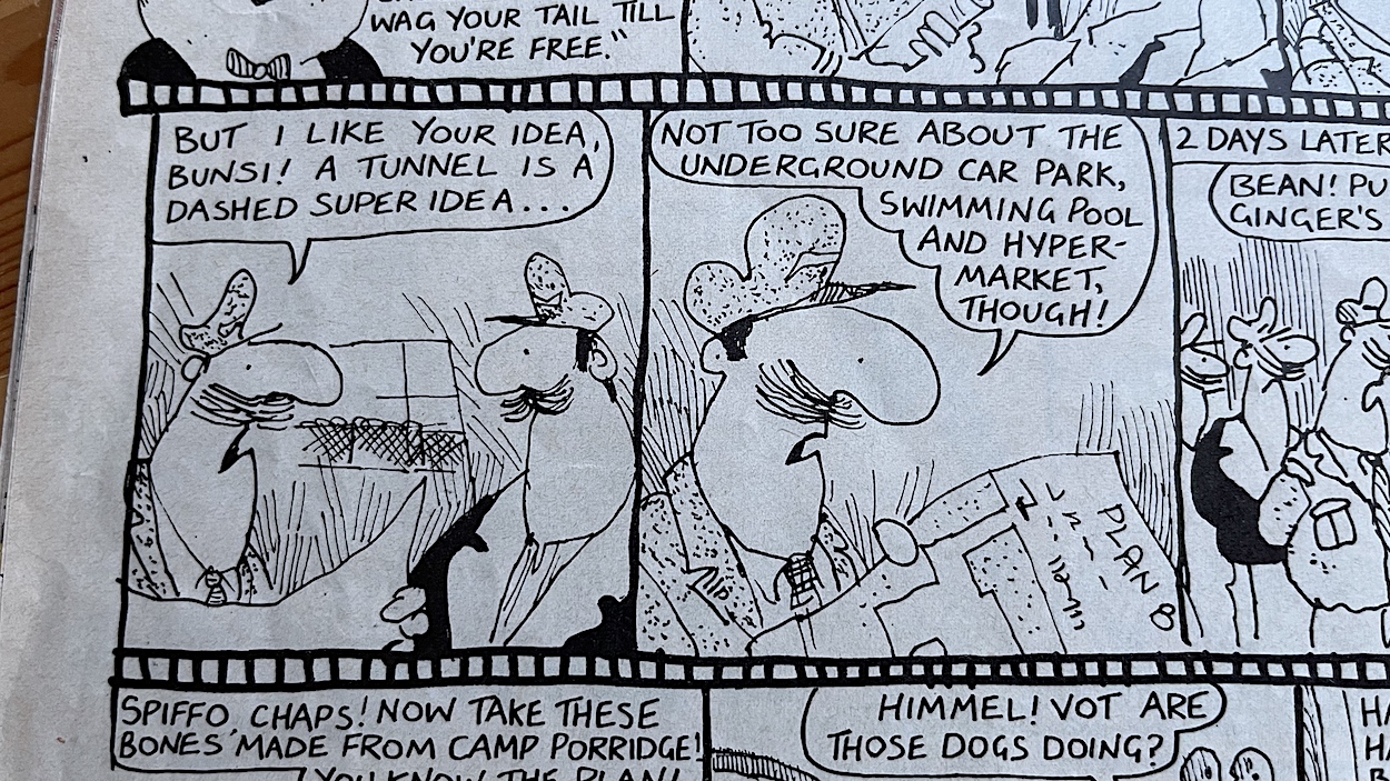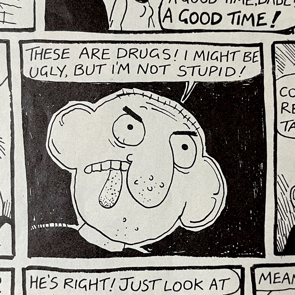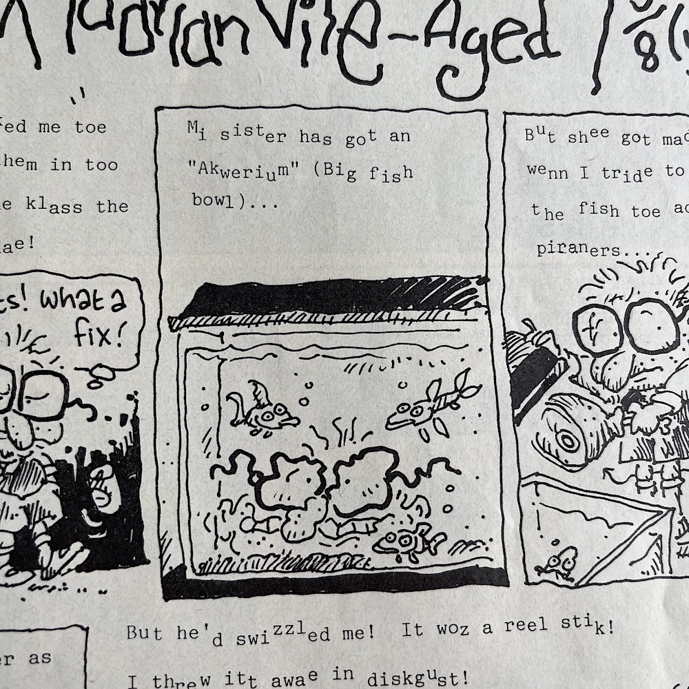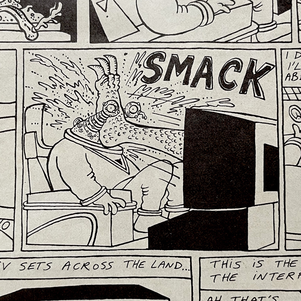 OiNK finished its regular run in 1988 but a couple of years later I was in my second year of grammar school and a new kid had joined our class. Because he hadn’t been taught Latin in the first year of his previous school he had to sit out those lessons, and was meant to use the 35 minutes of that classroom to study. On one occasion however, I happened to have the OiNK! Summer Collection with me, the final special released after the comic had finished made up almost entirely of reprint material. The next page from this issue was one of those reprints.