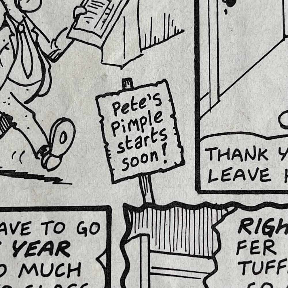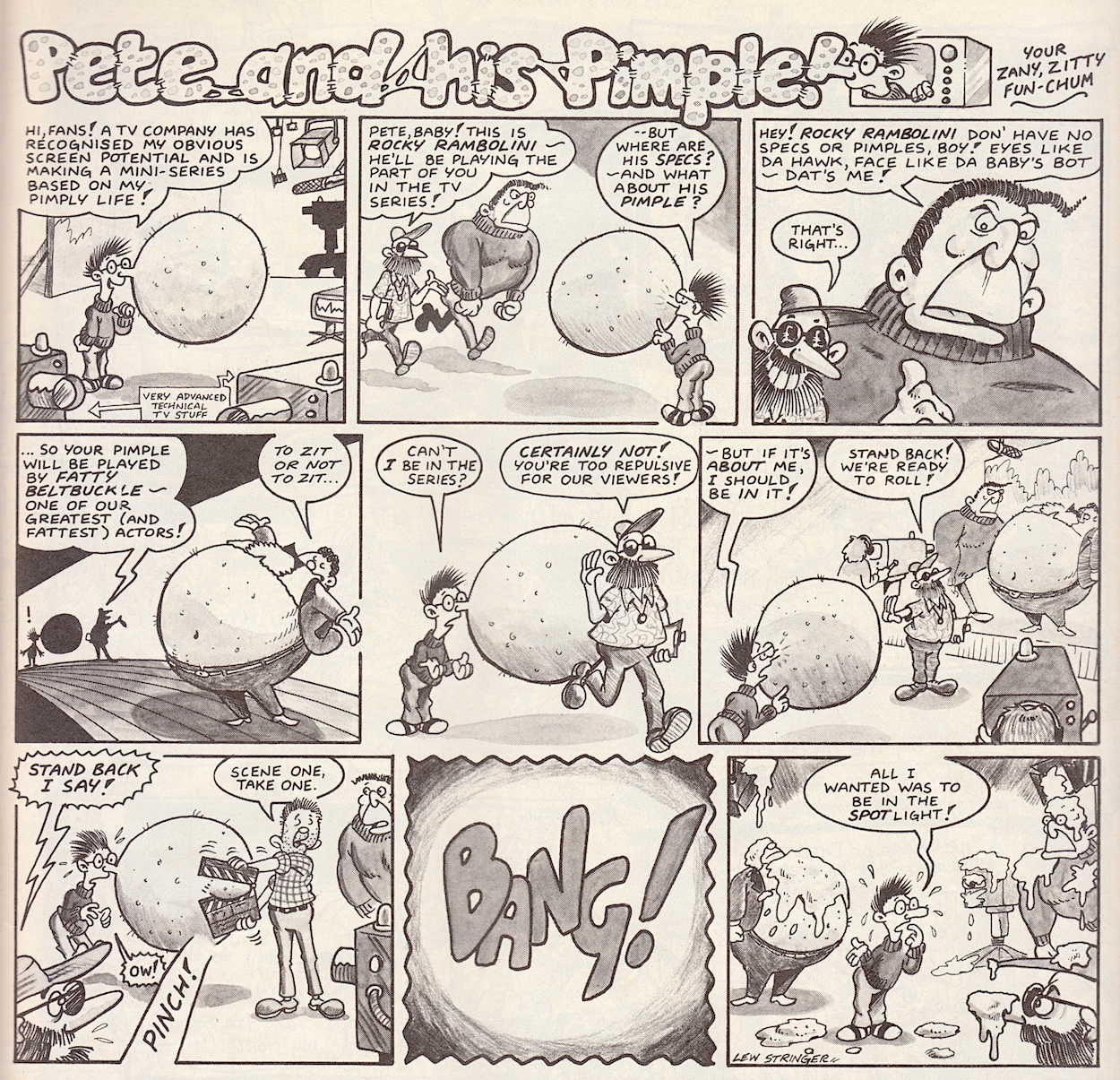 However, when OiNK folded into Buster towards the end of 1988 Pete’s strip had to be sanitised somewhat. Panels full of pus, covering everything and everyone, just weren’t something you could show in that comic. After six months the strip disappeared from its pages but while OiNK was being published Pete was a superstar. So much so a Sylvester Stallone-alike was going to play him in a new TV series and even his pimple was going to be played by an actor. This strip contains everything we came to love about a Pete story. I like the little details such as the “advanced technical stuff” which of course now looks lovely and retro, the panel dramatically revealing Fatty Beltbuckle and the skin and pus holding the strip’s name together.