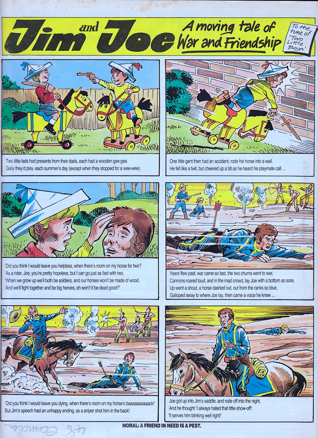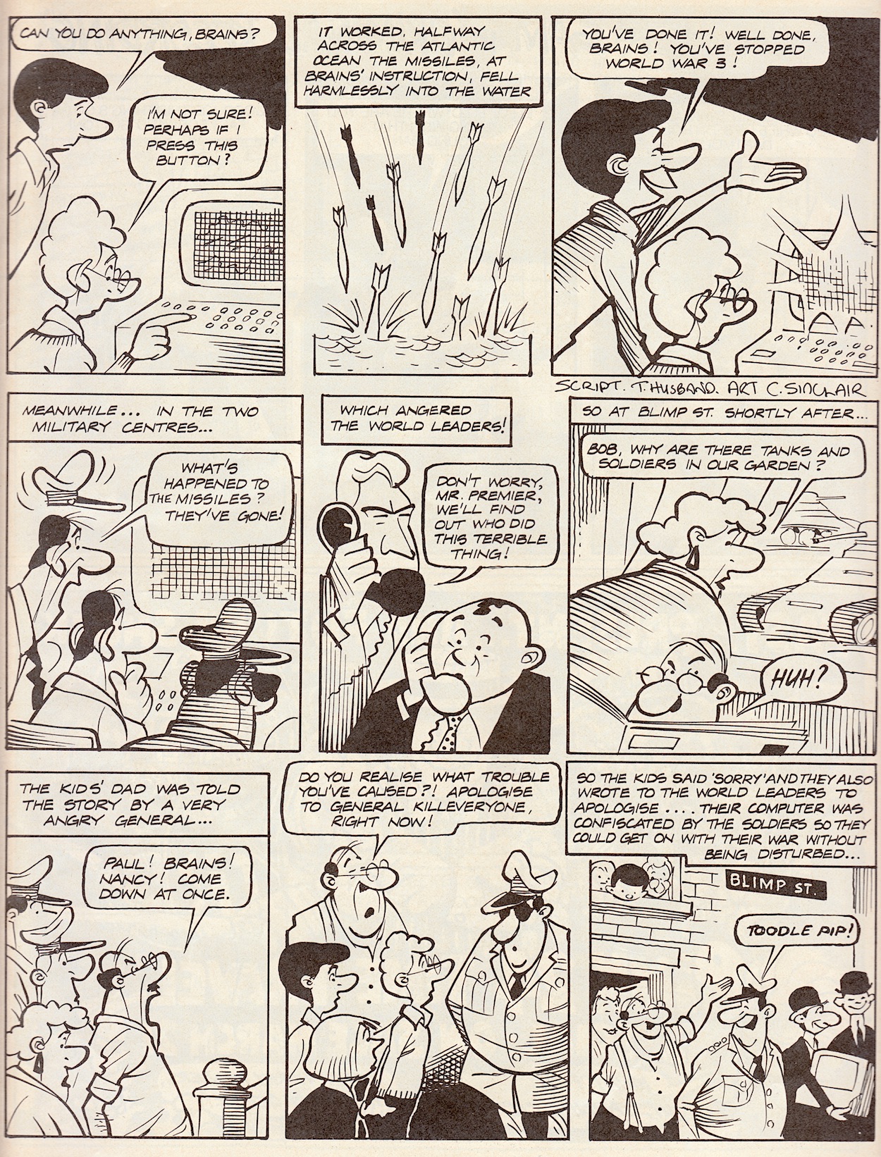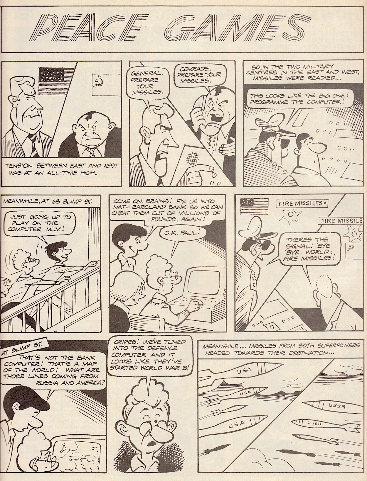 I am of course talking about WarGames starring Matthew Broderick and Ally Sheedy, which writer Tony Husband has decided to take aim at in a strip drawn by Chas Sinclair. Whereas in the film the kids almost accidentally start a war, here they accidentally stop one and this doesn’t go down well with the world’s leaders who want nothing more than to obliterate all life on the planet so they can feel superior. The message in this strip is clear and it’s hilariously presented, right down to that 80s movie cliché of just how easy it apparently was to hack any computer in the world.