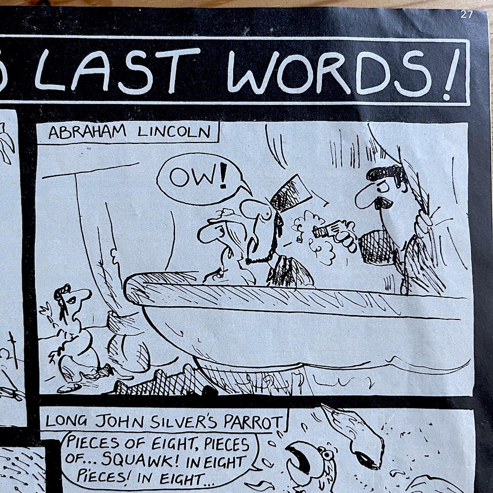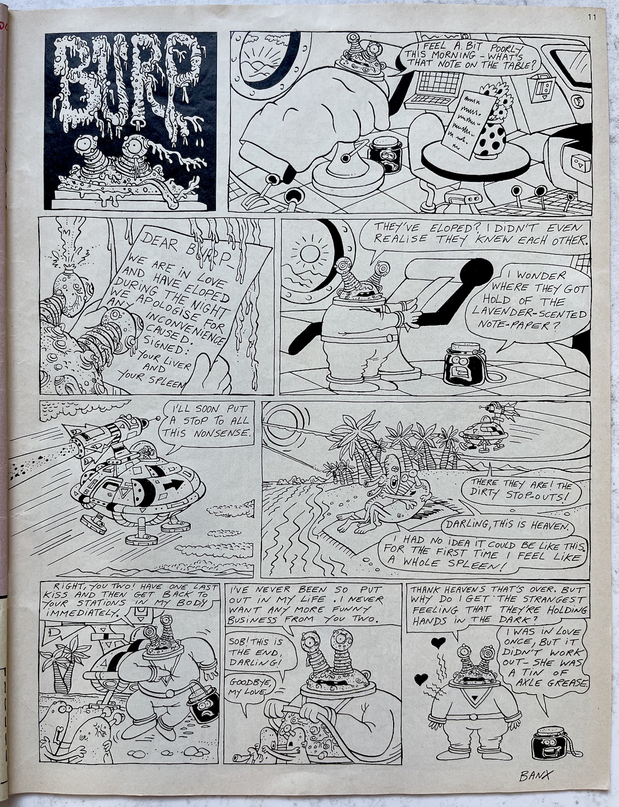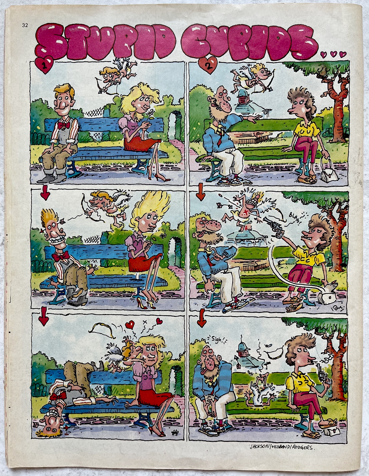 A couple of issues ago the back page of the Valentine’s OiNK had another of those superb full-colour Ian Jackson contributions, one of which (back in #4) remains to this day as my very favourite page out of all of OiNK’s issues. I remarked in #21 how it would’ve been wonderful to see every issue of the comic end with one of these, a series of completely unconnected strips, all hilariously illustrated by Ian. Imagine curious kids picking up an issue from the shelves and turning the comic over to see one of them. How many would’ve been instantly won over? This issue’s isn’t on the back cover, instead it’s tucked away inside but it’s still just as funny.