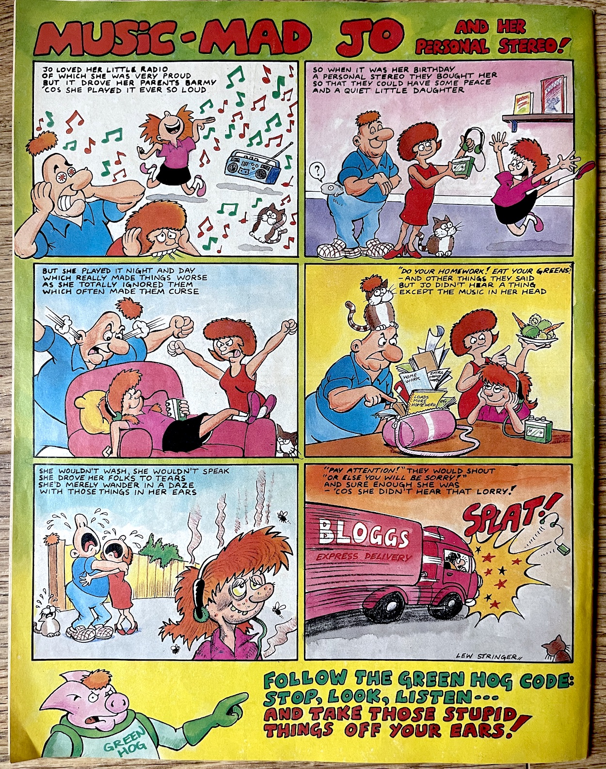 So it’s Lew Stringer who brings the issue to a close with a full-colour strip on the back page. But it’s not just any strip, it’s told in rhyme, something Lew seemed to really enjoy as he’d do it quite a few times for OiNK. This particular strip focusses on one of the truly great pieces of 80s technology, the personal stereo (or ‘Walkman’ as most of us called it after Sony’s name became ubiquitous with the devices). So with music playing a central role here the rhyming captions are the perfect way to tell the story.