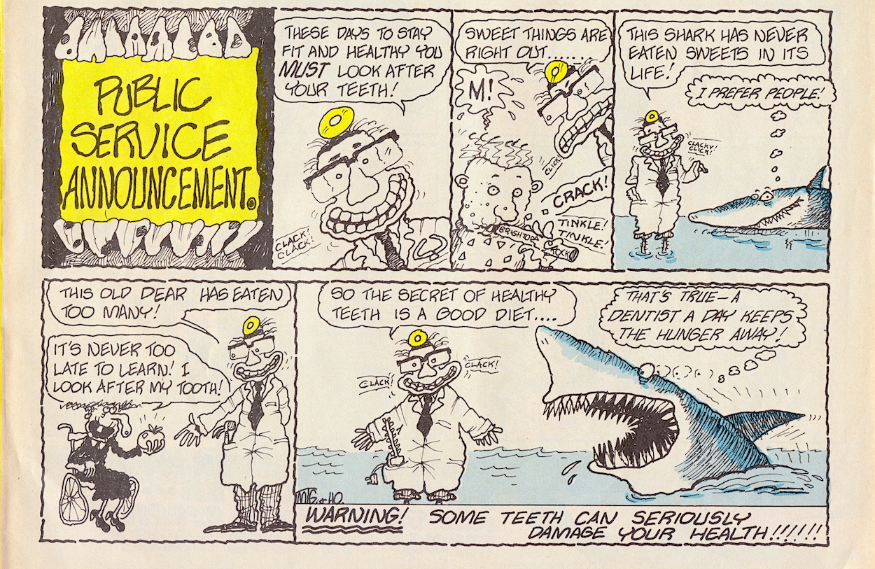 Before we see that back page I mentioned it’s time for a Public Service Announcement from new OiNK writer Howard Osborn. Howard would contribute to 19 editions of the comic altogether, often writing a few strips per issue. Here he’s partnered with Weedy Willy artist Mike Green to teach the kids about looking after their teeth and it includes a comical shark, so I was always going to include it.