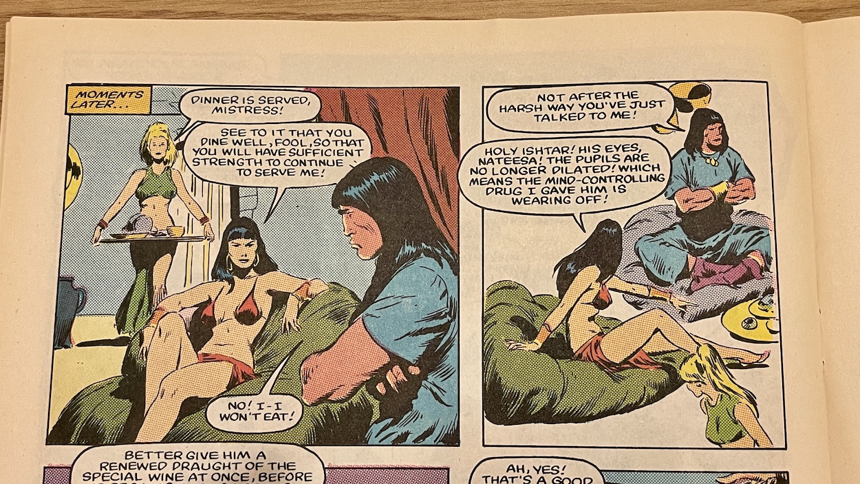 Conan begins to weep and after Nateesa is ordered to bring them food and wine we huffs and begins to rebel. He may still be under her influence but he’s not meant to talk back. Suspecting he needs further drugging, Mariella orders Nateesa to give him more wine filled with the toxin but quickly realises Nateesa has been giving him regular wine, trying to help bring him out of this state naturally.
