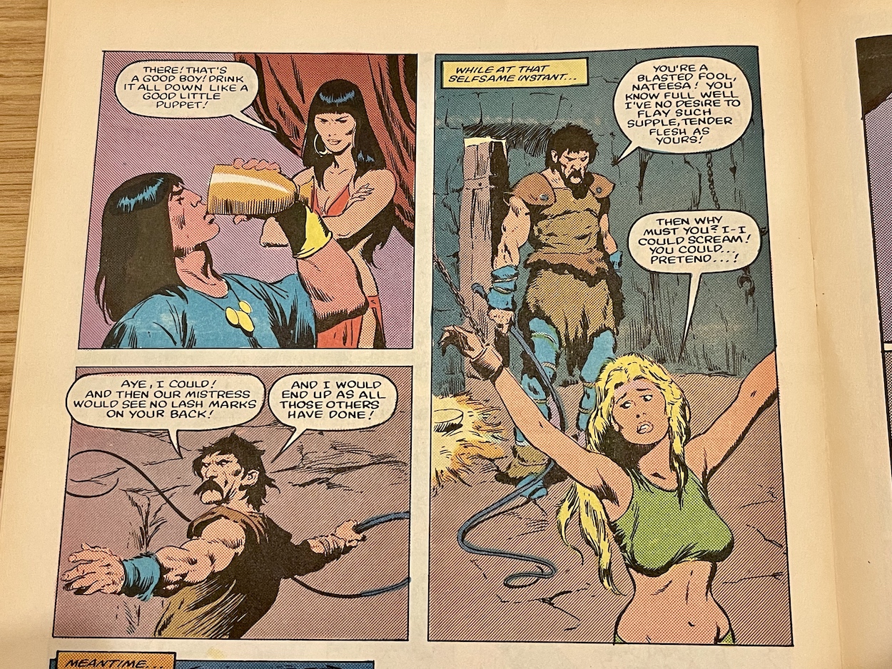 Marielle orders another servant, a vile man by the name of Zogran to take Nateesa away and punish her. Conan doesn’t flinch at her pleading as she’s dragged away and soon Marielle is feeding him more of the laced drink. We see Nateesa trying to convince Zogran not to harm her and it appears he’s well aware Marielle is evil. But he’s still a creep and soon he’s whipping her for his own pleasure, the screams echoing throughout the mansion.