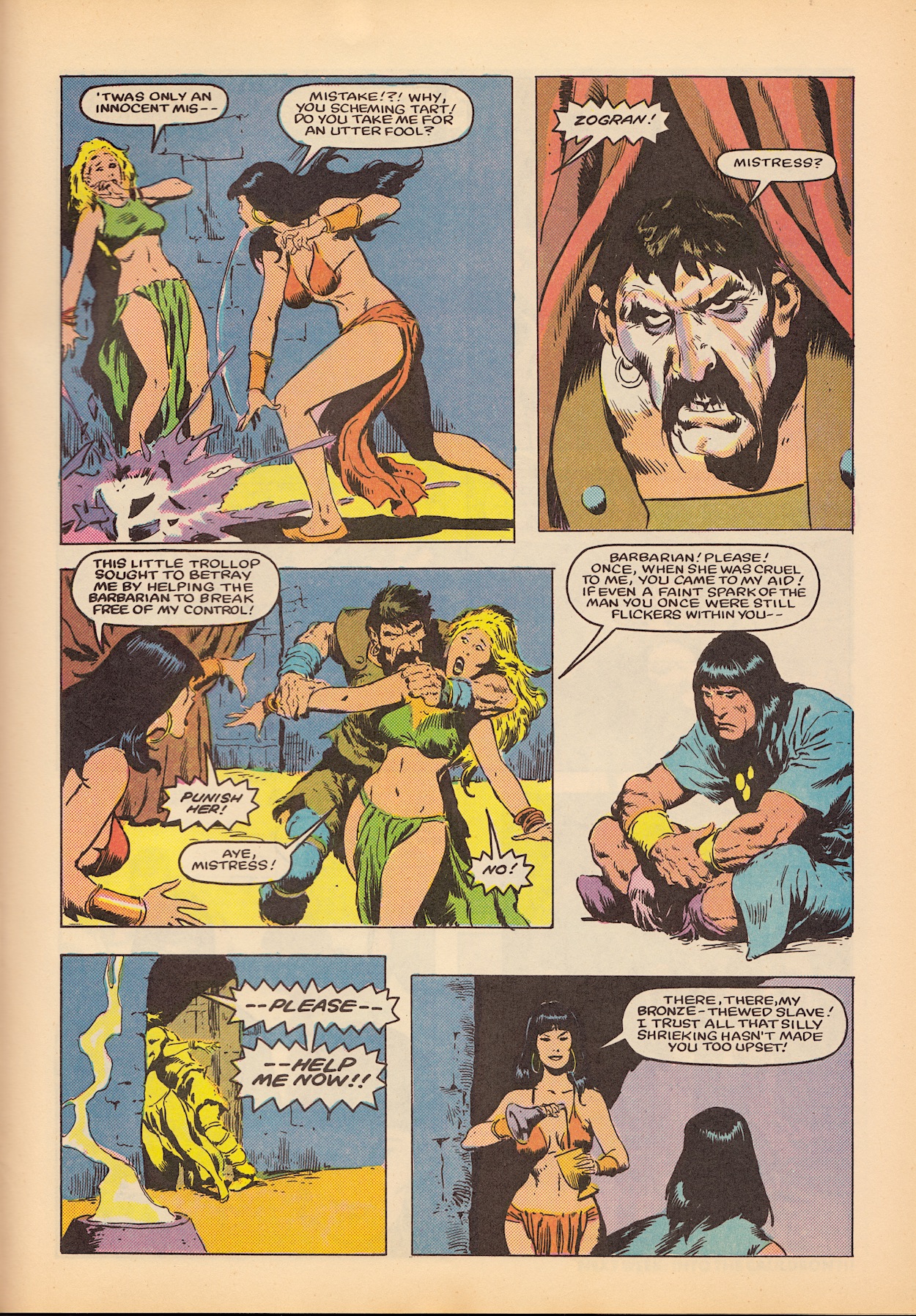 Moving on to Conan: Cauldron of the Doomed which is plotted and drawn by John Buscema, with dialogue by Michael Fleischer and letters by Janice Chiang. Last week’s Conan the Barbarian ended with the caption, ‘Next Week: Conan is made ready for the cauldron!” Well, it’s only in the final panels here that the sinister Marielle tells her servants to prepare Conan for said cauldron, so the editor seems to have gotten ahead of themselves again. The story begins after the entranced Conan and Marielle return home and as he attempts to fawn over her she snaps and scolds him, suddenly deciding she’s had enough.