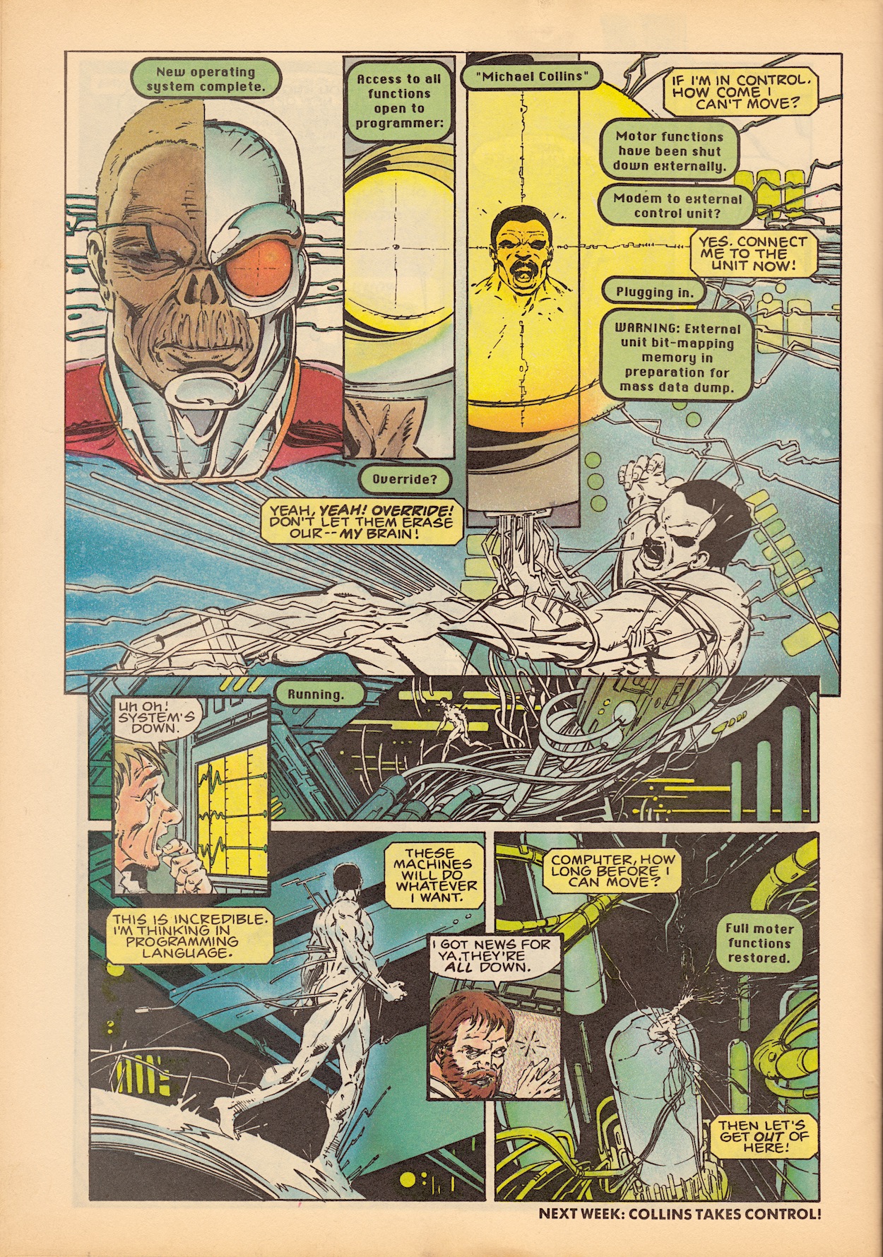 Michael now knows he can interact with the program running the machine and Ryker’s response to it letting the child live is truly shocking. Clearly there’s nothing this man won’t instruct Deathlok to do for his client’s money. Days later the techs are going over Deathlok with a fine-toothed comb and Ryker has his suspicions about Collins being “in there”. With the cyborg in its recharge cradle, unable to move, Michael asks the computer to open up the operating system and thus begins what I loved the most about this strip.
