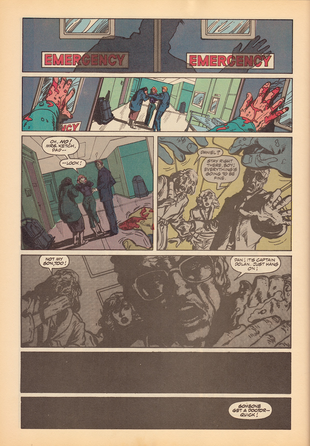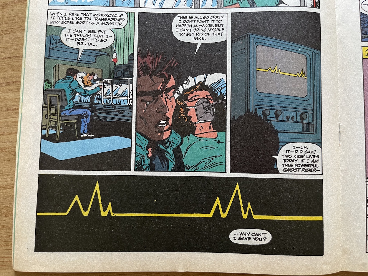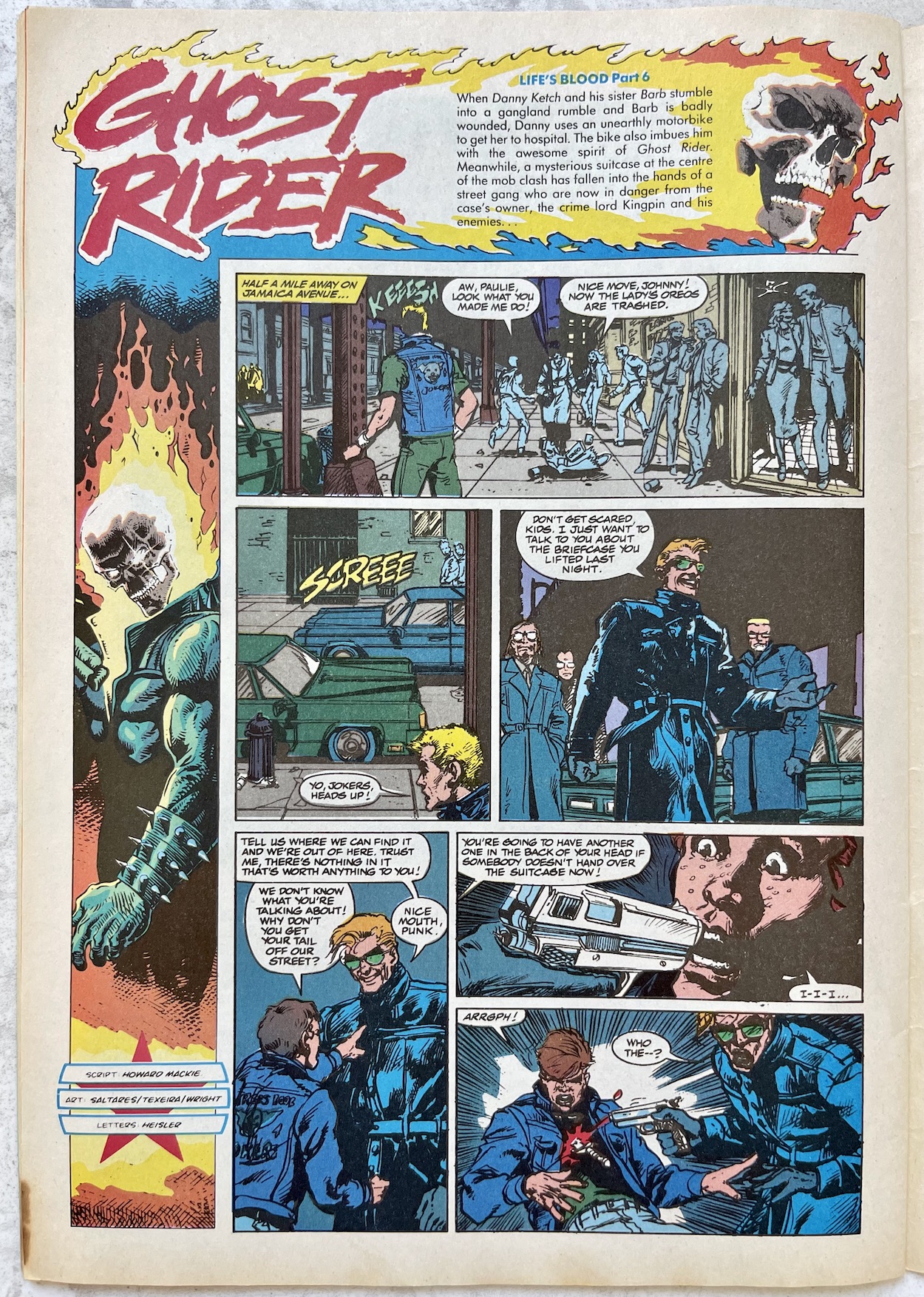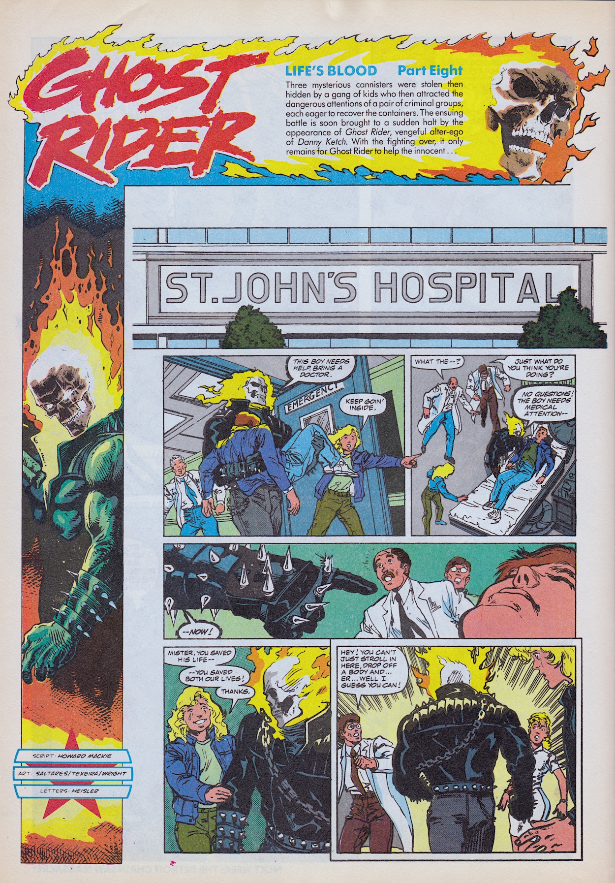 Alongside Deathlok, Ghost Rider’s origin story also ends this issue, with part eight of Life’s Blood ((written by Howard Mackie, pencilled by Javier Saltares, inked by Mark Texeira, coloured by Gregory Wright, lettered by Michael Heisler)) which acts as a kind of epilogue. In his demonic form Danny Ketch bursts into the local hospital to deliver the young gang member who initially scared him back in #1, injured in the battle between Kingpin’s and Deathwatch’s cronies over the mysterious suitcase and its canisters. After this first page he reverts back to human form for the rest of the story.