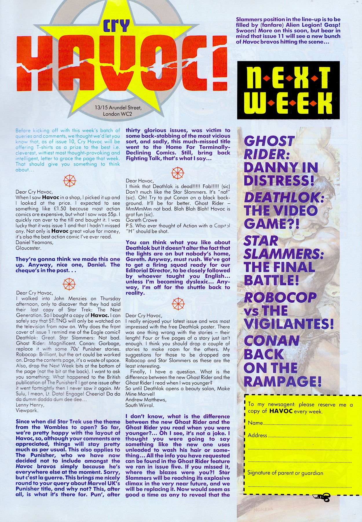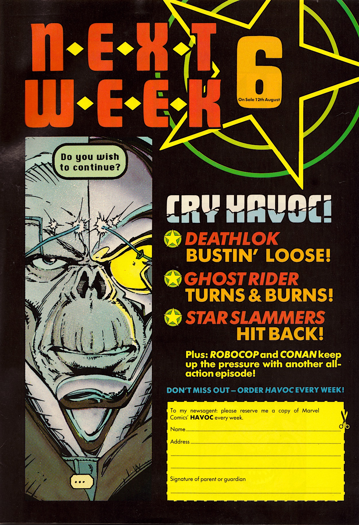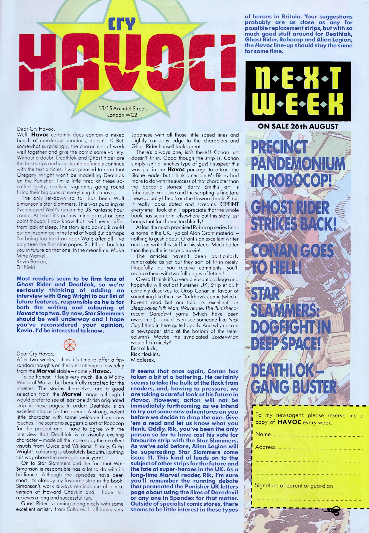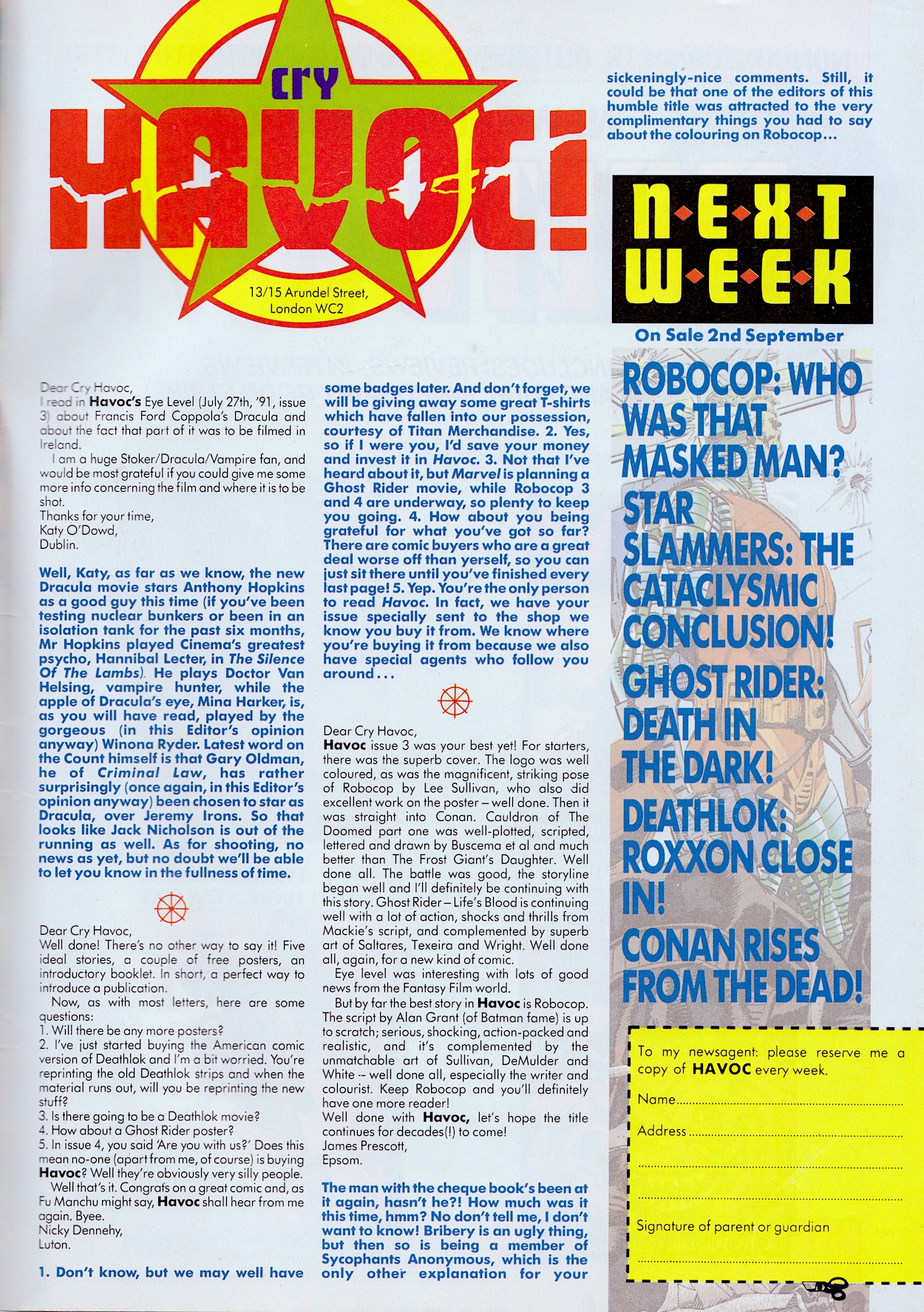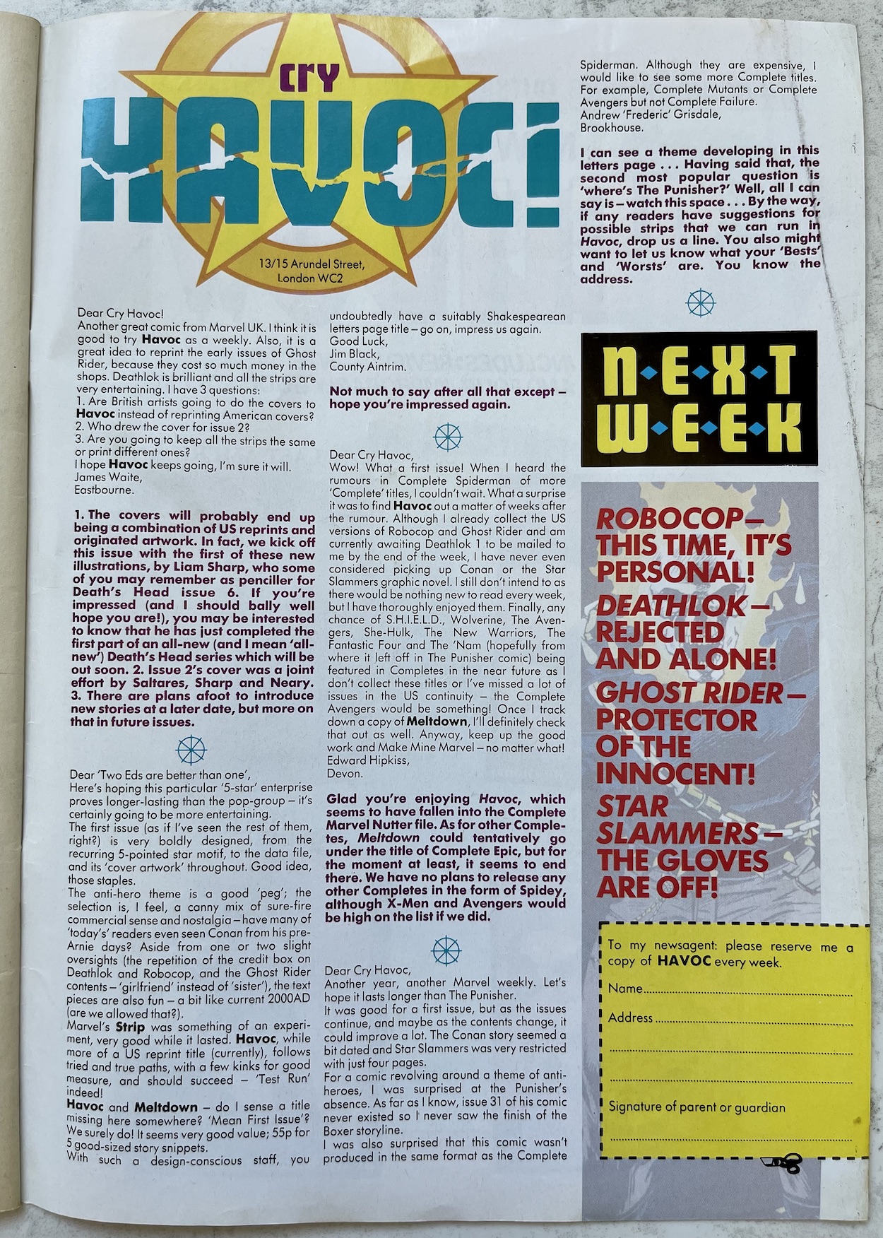 There are some cheeky answers here too (“How about you being grateful for what you’ve got so far?”) which is very Marvel UK indeed, instructions to invest in the future of Havoc for new Deathlok (oh deary me, you’ll start me off again) and a funny final answer which refers to the fact RoboCop was coincidentally coloured by Havoc’s editor. Then just to rub salt in the wound is the Next Issue box and a reservation coupon. This is not the end this comic deserved.