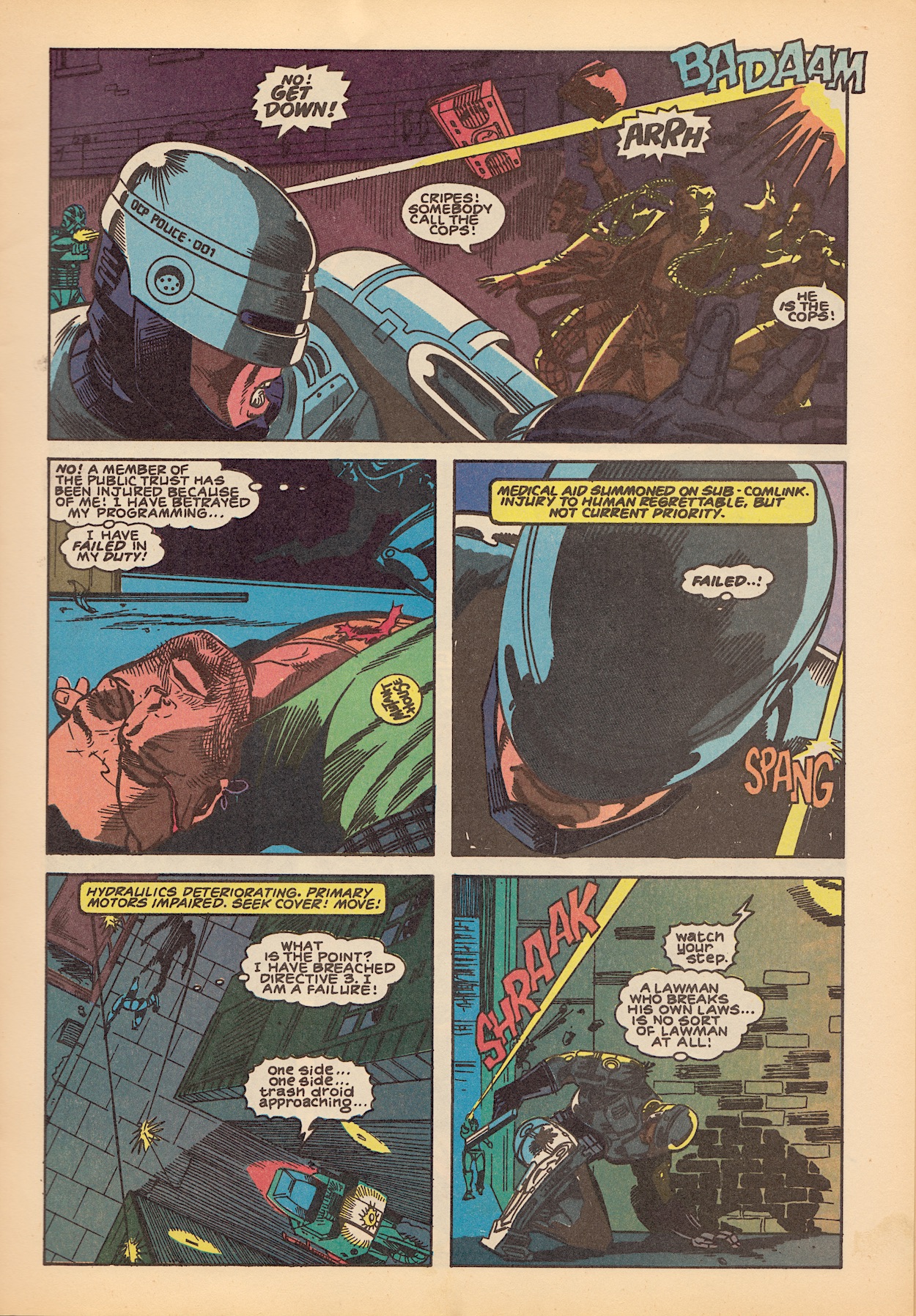 In the original film and TV show his outward speech wasn’t as free-flowing and natural as it reads here, which of course was very deliberate. It made his internal thoughts, memories and the times he’d act with surprising humanity all the more important to the character because they were so jarring with the machine cop he was presented as. It’s what made him unique. I’m glad to say, while the strip has him speaking more like a regular human, these moments filled with doubt are superb and somehow still maintain that jarring feel.