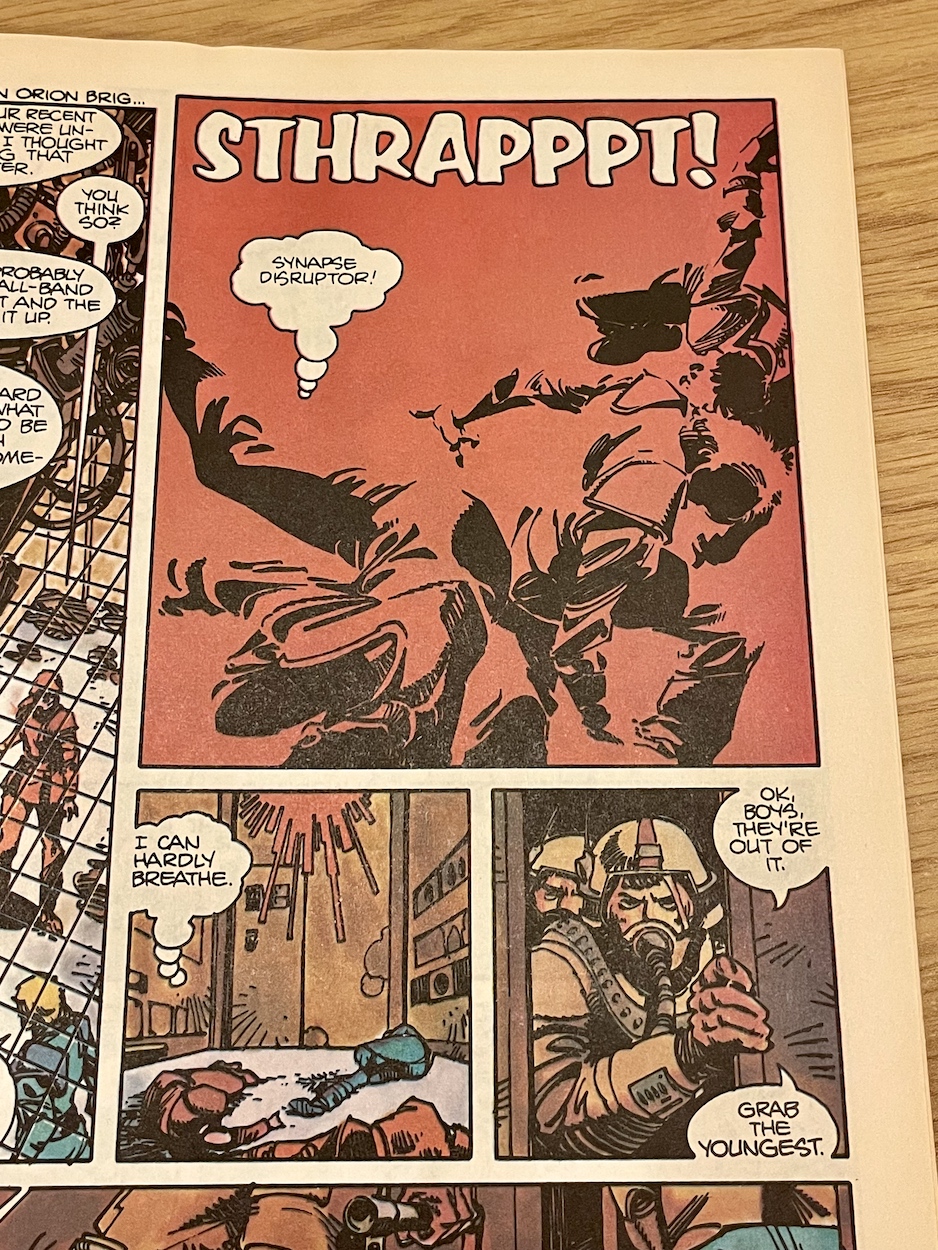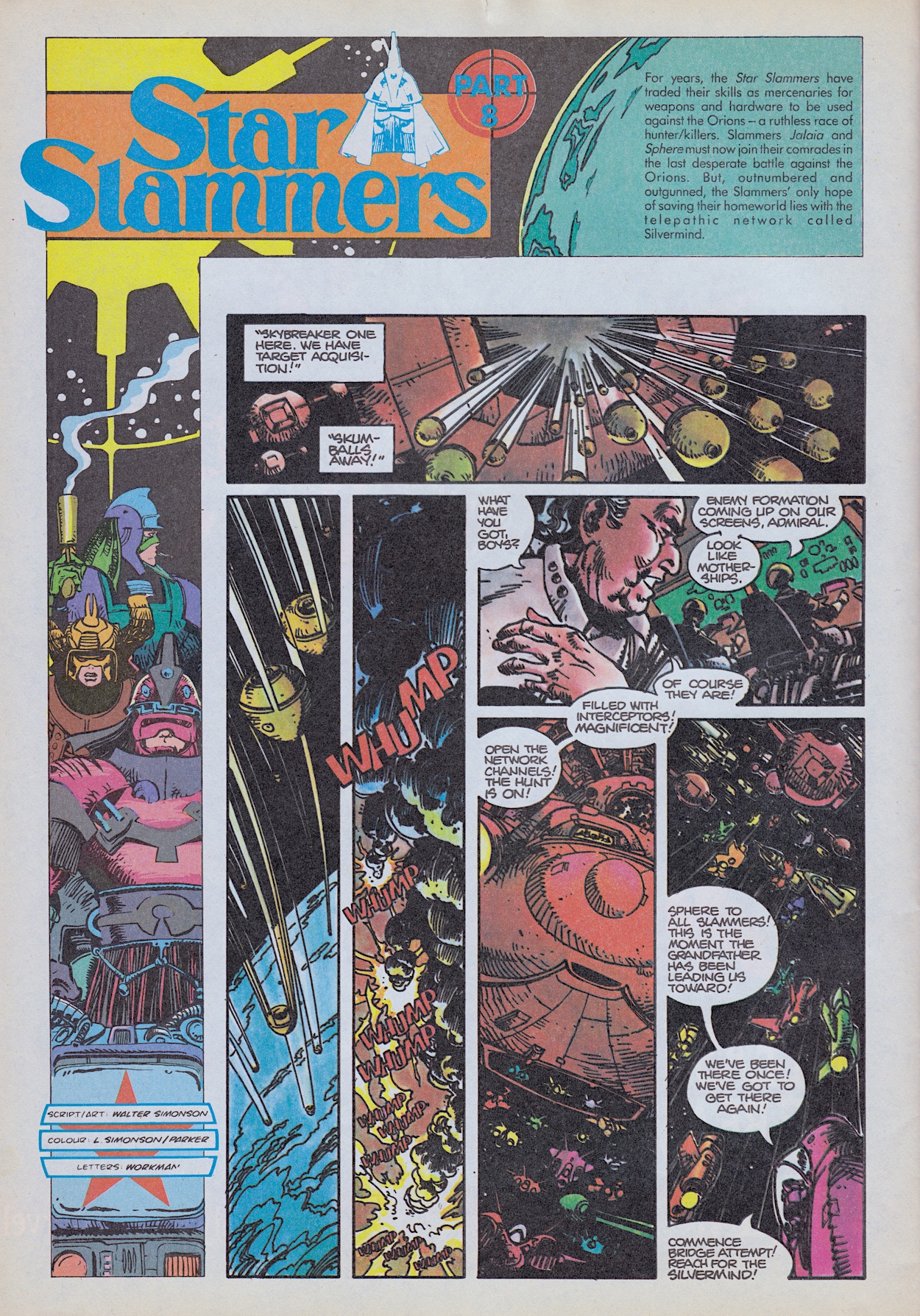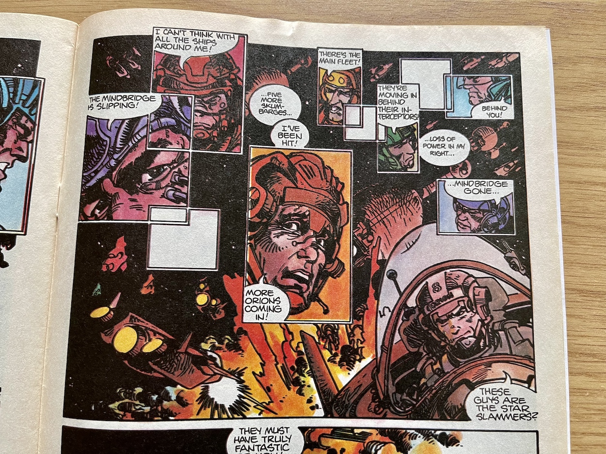 So, we finish our penultimate issue with the Star Slammers (written and drawn by Walt Simonson, colours by Louise Simonson and Deborah Pedler, letters by John Workman) and if I thought Conan’s strip didn’t have much going on then this one has absolutely nothing. At first glance it all looks very exciting, with a unique layout to the battle scenes and it entices the reader in, only to find not much there upon closer inspection.
