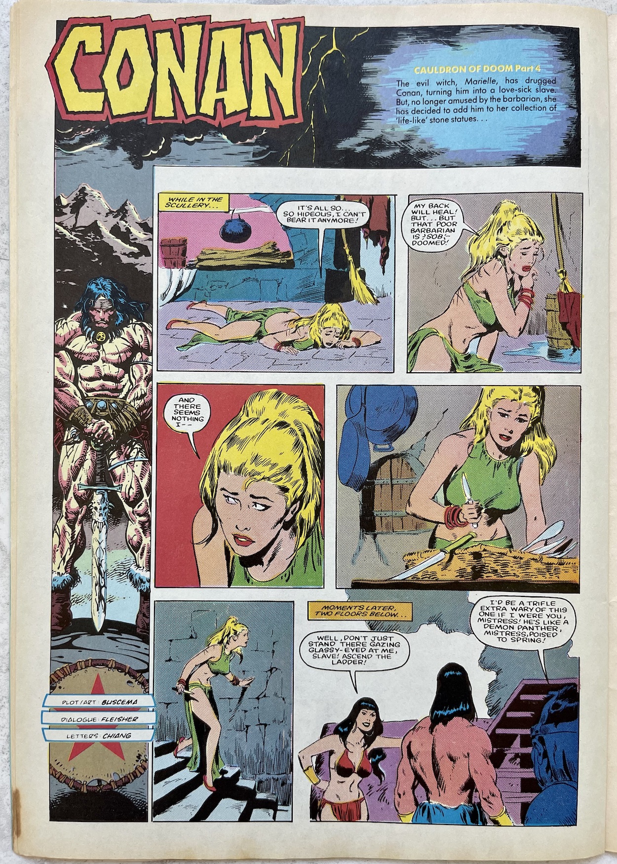 Conan the Barbarian’s Cauldron of Doom (plot and art by John Buscema, dialogue by Michael Fleischer, letters by Janice Chiang) comes to its conclusion this issue and as feared it basically boils down to Conan coming out of his hypnotised state and punching a few people. How this happens is rather good though, with slave girl Nateesa coming to his rescue. Terrified of her mistress Marielle, Nateesa can’t get close to Conan so she resorts to desperate measures and throws a stolen knife at him. She’s a very good shot from so far away!