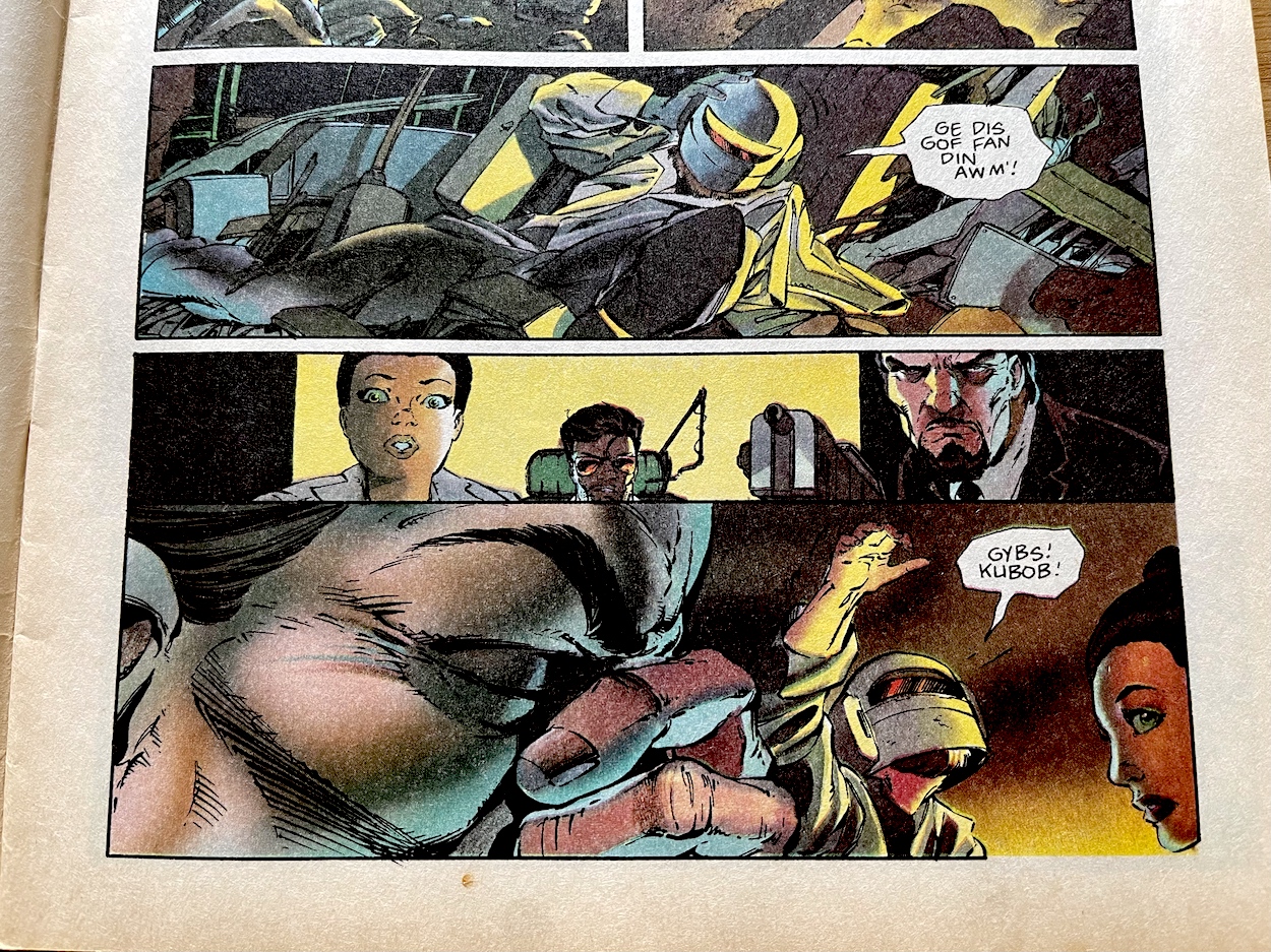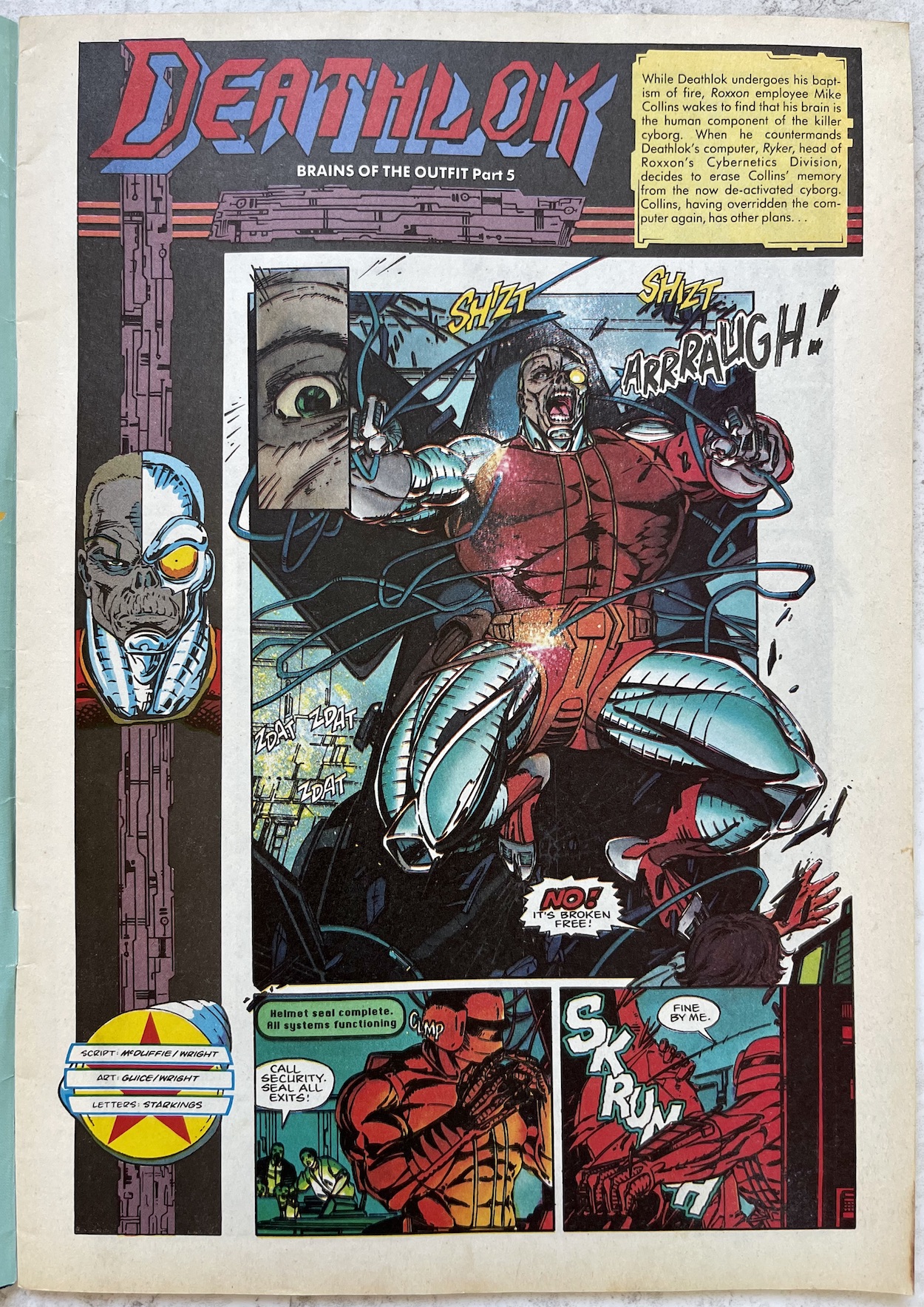 Speaking of the editorial team, there’s been a bit of a shake up. Launch editors John Freeman and Harry Papadopooulos have jumped ship already, leaving the tiller in the capable hands of Jacqui Papp (editor for titles such as Motormouth, Die Cut and Battle Tide, all comics from the Marvel UK Genesis Project) and Steve White (colourist for Transformers, Jurassic Park’s Xenzoic Tales and editor on Visionaries). Their first issue is a doozy, so let’s get started with Deathlok: Brains of the Outfit written by Dwayne McDuffie and Gregory Wright, drawn by Gregory and Jackson Guise and lettered by Richard Starkings.