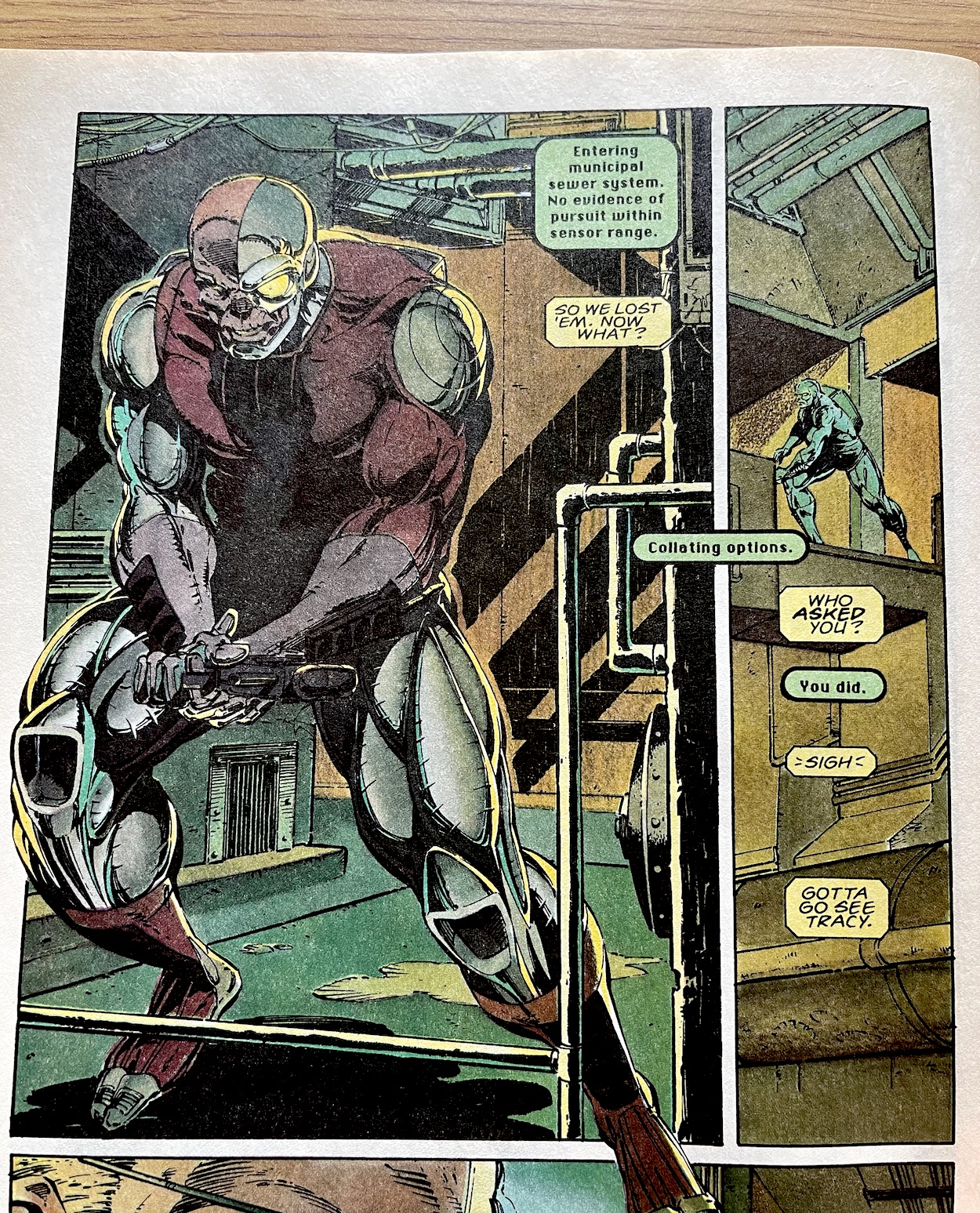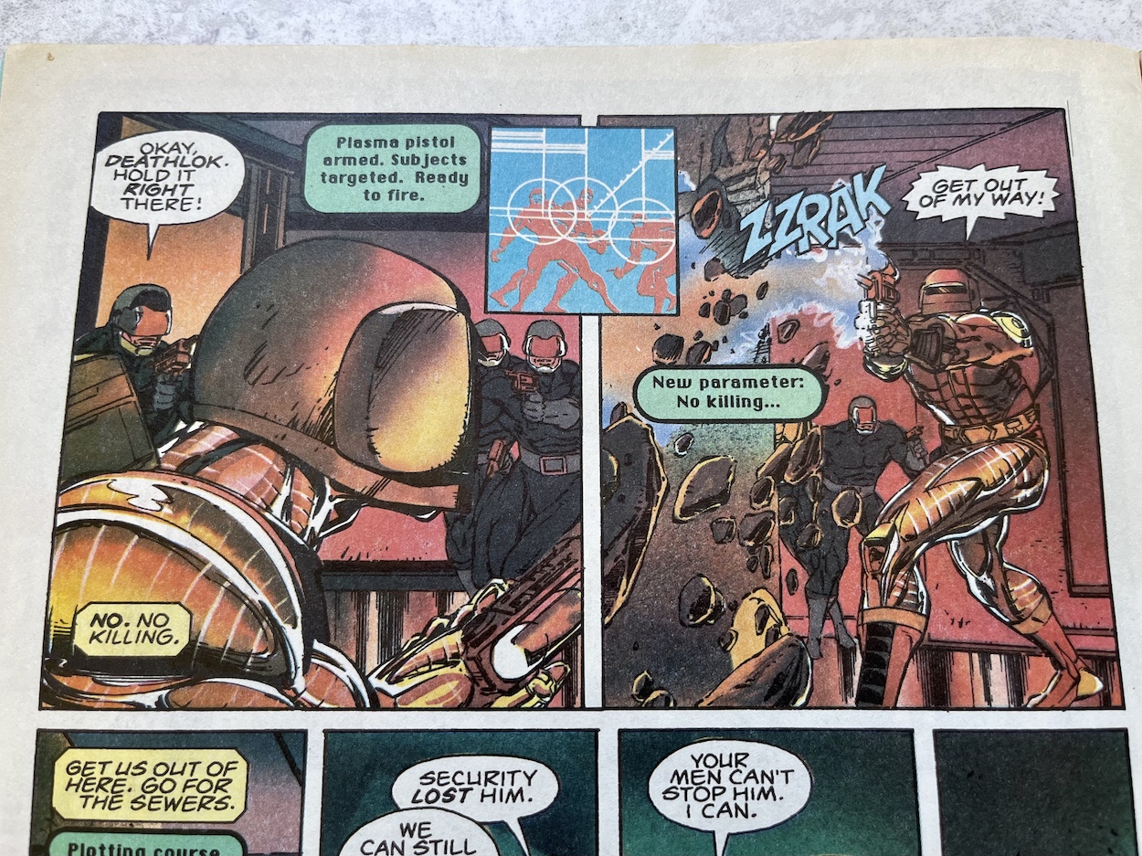 Murphy’s Law (nice) begins with Robo battling a group of new Nixcops. Programmed as his replacements they believe our hero is now impersonating an officer and must be destroyed, and his prisoner taken into custody. In reality his prisoner, Dek Kyng, could expose the corruption at Nixco and so the bosses are using their new cops to put an end to Robo’s investigation. His internal thoughts alongside the readouts of his systems are very similar to Deathlok’s but this isn’t a complaint. Alex is much more in control of his systems, they are him, so it’s different to the other cyborg strip.