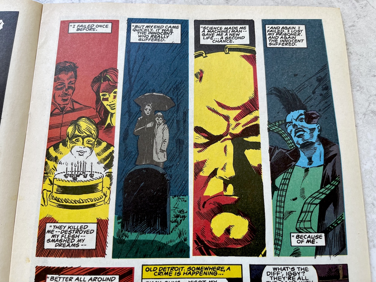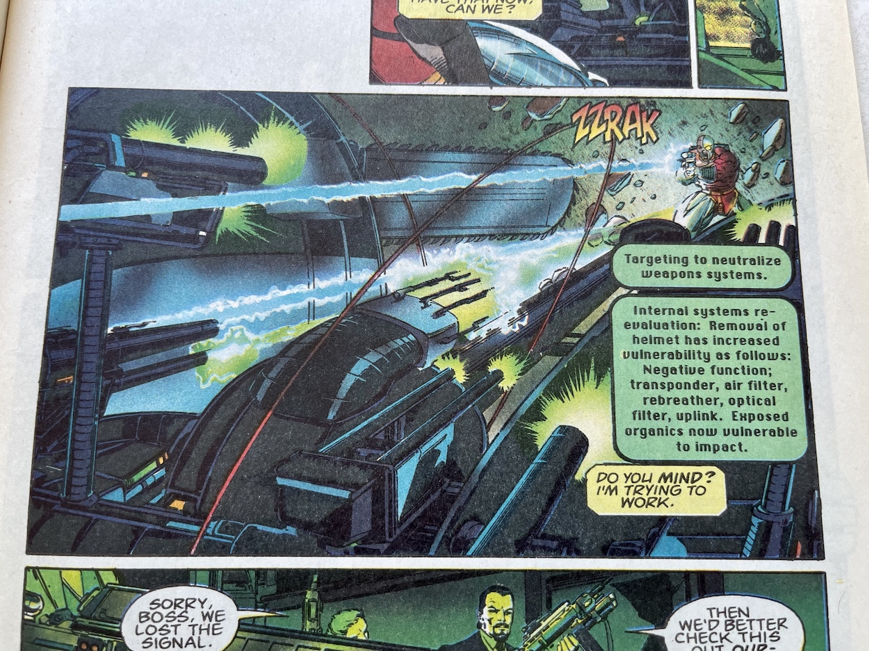 Up to this point Deathlok has been full of action, strong character development and some rather terrifying moments when Michael Collins awoke. I’ve previously mentioned how I remembered there being a lot of humour too, particularly between Michael and the monotone computer operating the Deathlok cyborg. We get to see quite a bit of this in part six of Brains of the Outfit, such as the computer’s recalculating moment and when they finally destroy the massive tank and it looks like the killer cyborg is about to see off its driver Ben, a former colleague of Michael’s, only for his head to be squished inside Deathlok’s helmet instead.